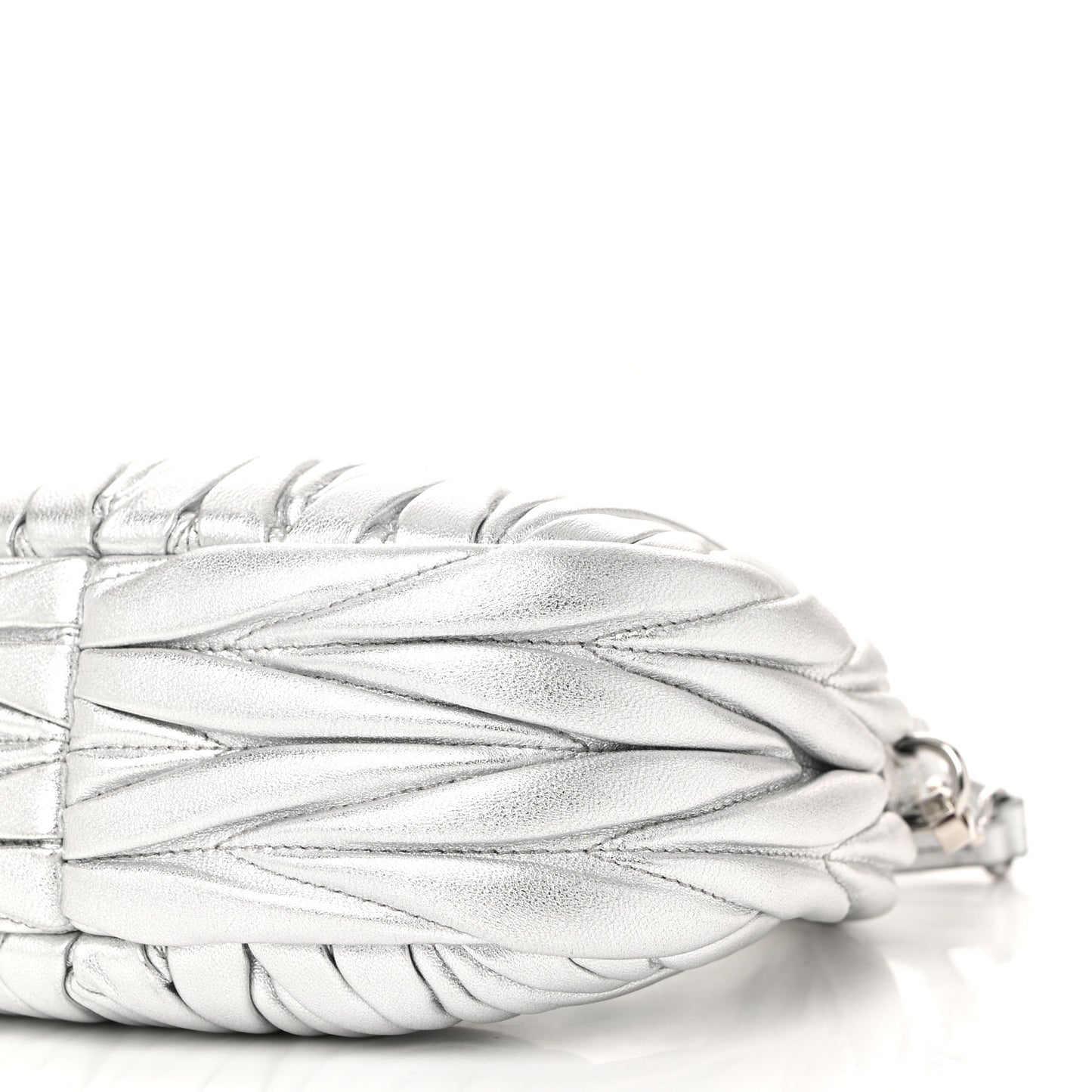 This an authentic MIU MIU Metallic Nappa Matelasse Mini Wander Hobo in Cromo. This chic baguette is crafted of matelasse pleated lambskin leather in silver. This handbag features a matching looping top handle and a detachable shoulder strap with silver hardware. The top zipper opens to a black fabric interior.Follow this item for alerts. Miu Miu is a registered trademark of Miu Miu. FASHIONPHILE is not affiliated with Miu Miu.