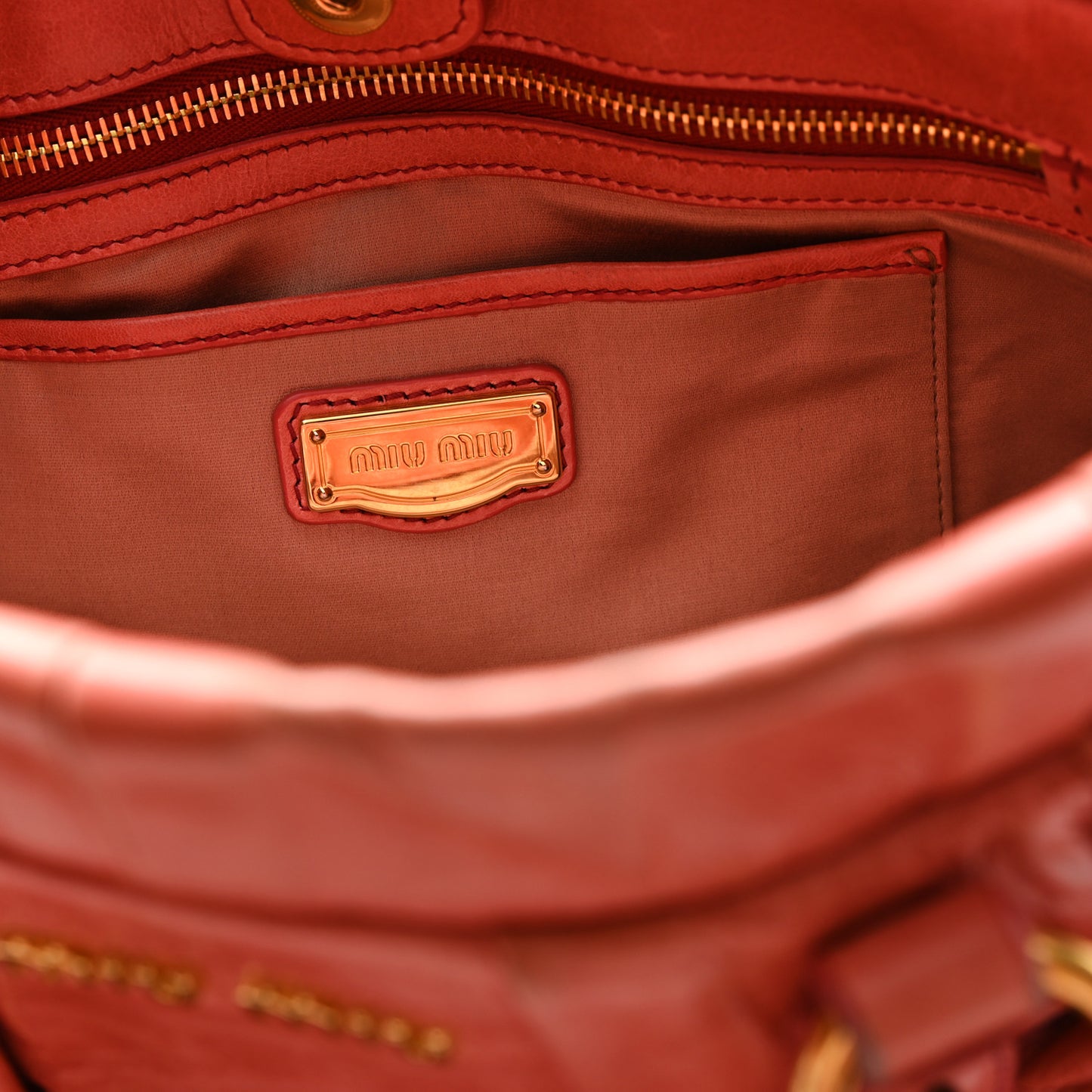 This authentic MIU MIU Vitello Lux Gathered Tote in Rosa. This stylish tote is crafted of shiny textured leather in red. The bag features rolled leather top handles with gold rings, an optional shoulder strap and gold hardware. The interior is a spacious red fabric interior with zipper and patch pockets. This shoulder bag is ideal for everyday use, only from Miu Miu.Follow this item for alerts. Miu Miu is a registered trademark of Miu Miu. FASHIONPHILE is not affiliated with Miu Miu.