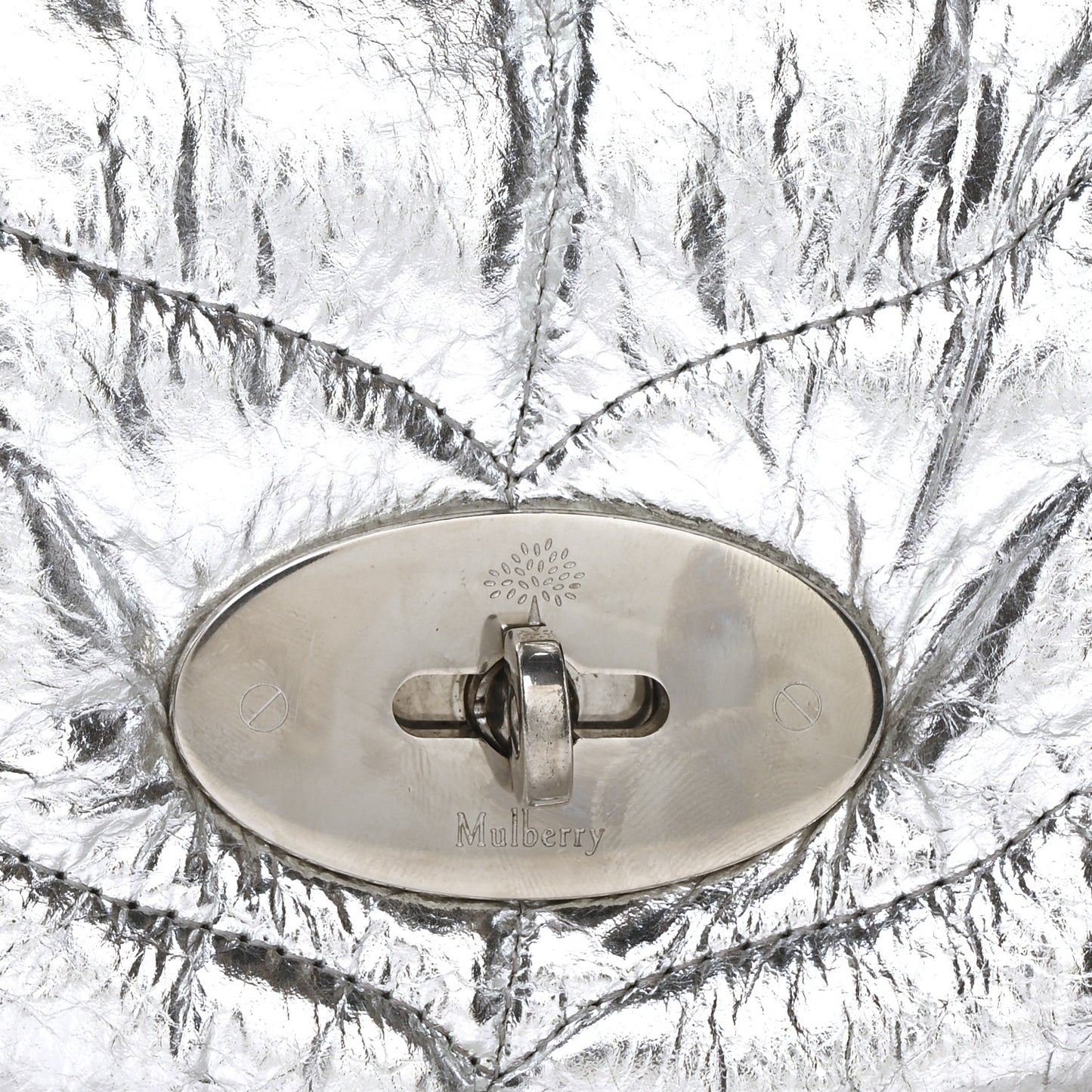 This is an authentic MULBERRY Metallic Crinkled Nappa Pillow Quilted Tiny Softie Bag in Silver. This tiny bag is crafted of stuffed quilting metallic leather. It features a flat top handle and a chain strap with a leather pad. The Postman's turn lock opens to a black nylon interior with card slots.Follow this item for alerts. Mulberry is a registered trademark of Mulberry. FASHIONPHILE is not affiliated with Mulberry.