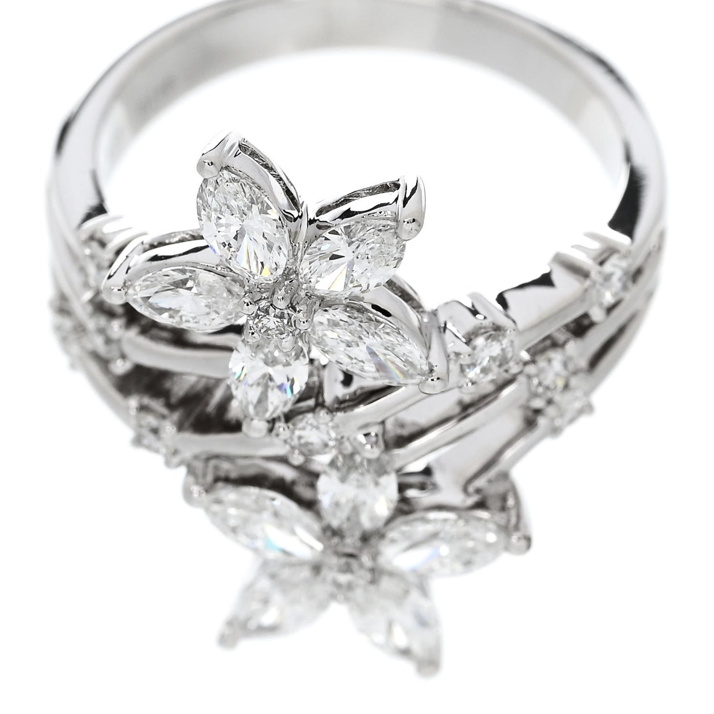 This is an 18K White Gold Diamond 1.46ctw Flower Ring in size 53 6.5. The ring is crafted of 18 karat white gold and features a polished band with two floral motifs set with round and marquis cut diamonds, approximately 1.46 total carat weight with I2-SI1 clarity and F-G color.Follow this item for alerts. Parker & West by FASHIONPHILE is a registered trademark of Parker & West by FASHIONPHILE. FASHIONPHILE is not affiliated with Parker & West by FASHIONPHILE.