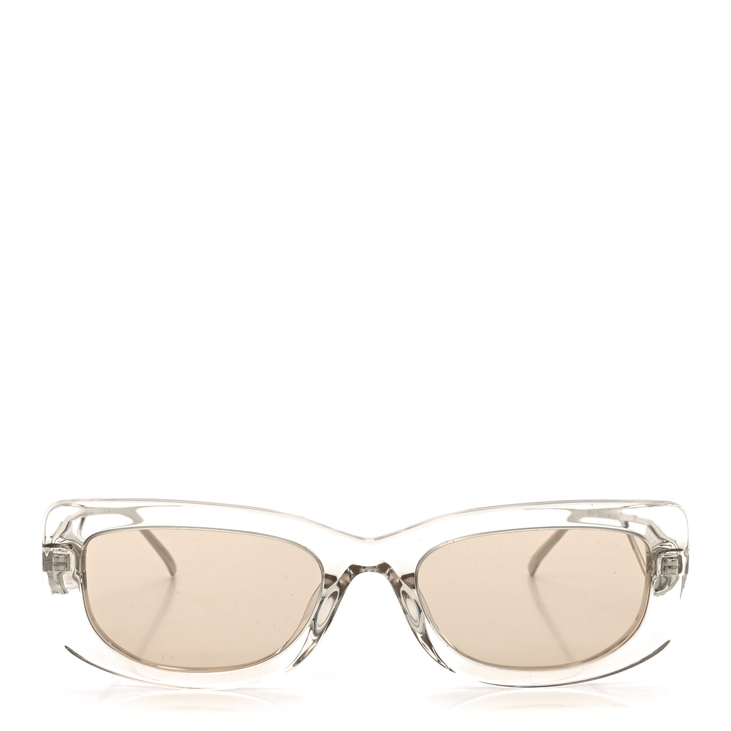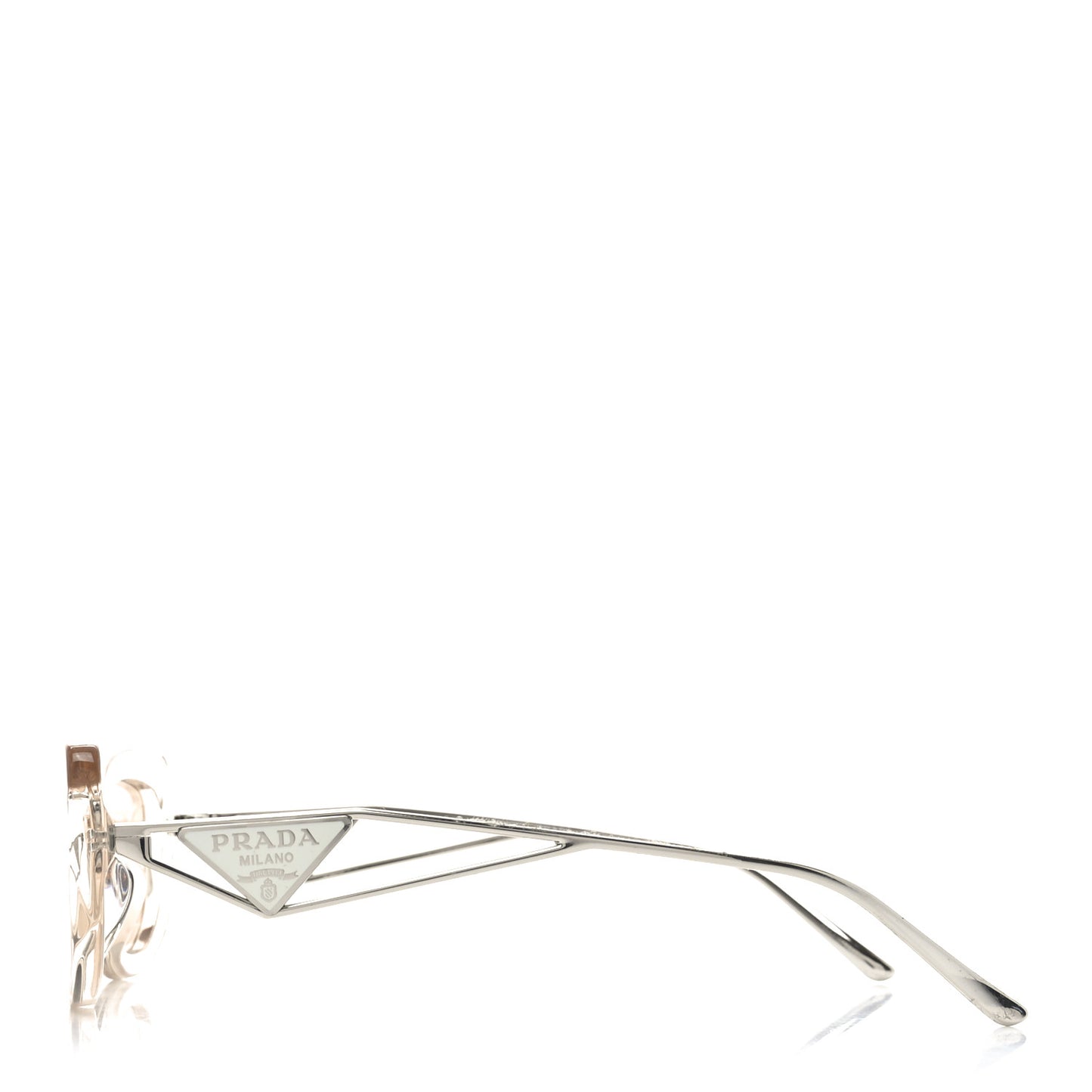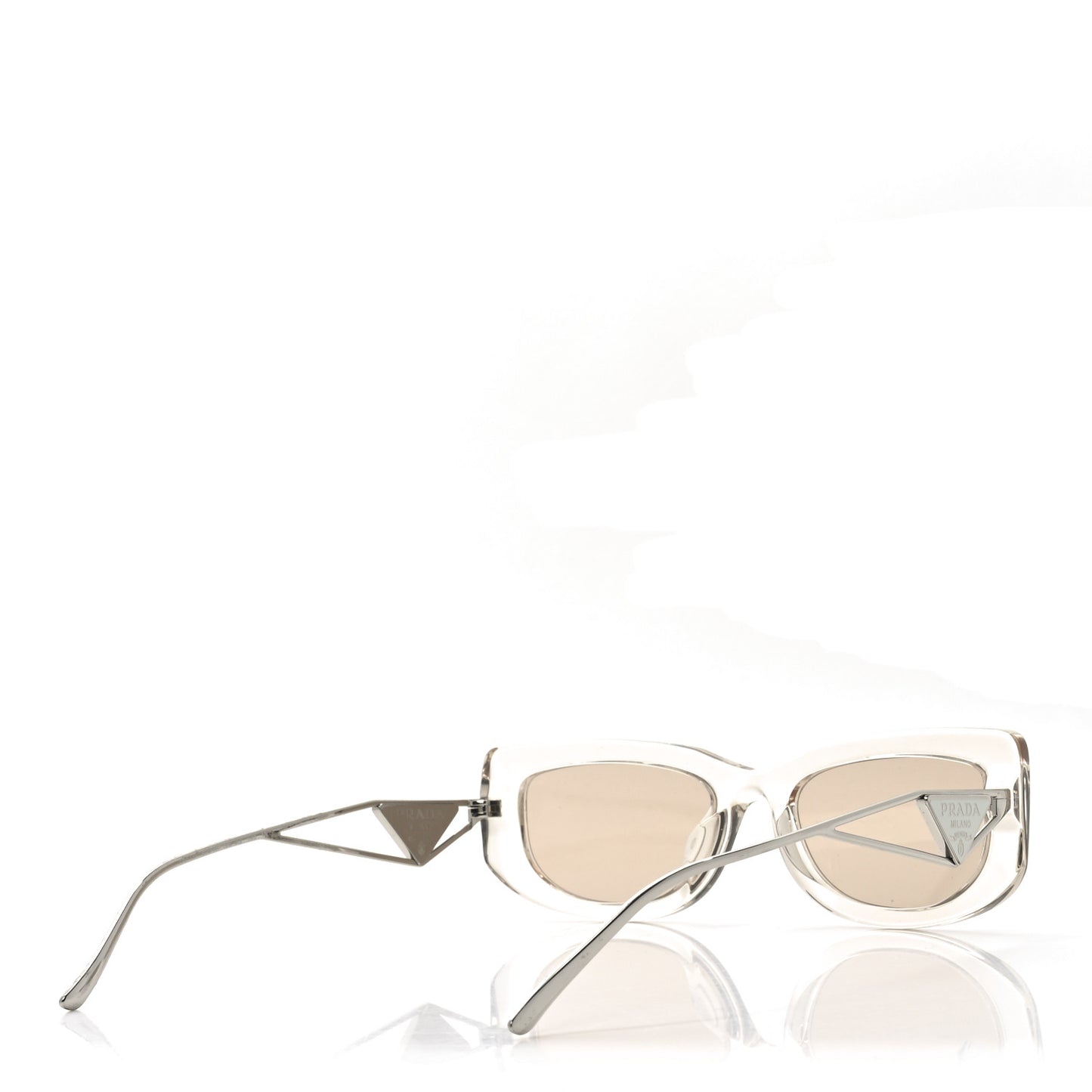 This is an authentic pair of PRADA Acetate Sunglasses SPR 14Y in Crystal and Beige. These classic sunglasses have a silver wire frame decorated with a white triangle logo and hazelnut brown lenses.Follow this item for alerts. Prada is a registered trademark of Prada. FASHIONPHILE is not affiliated with Prada.
