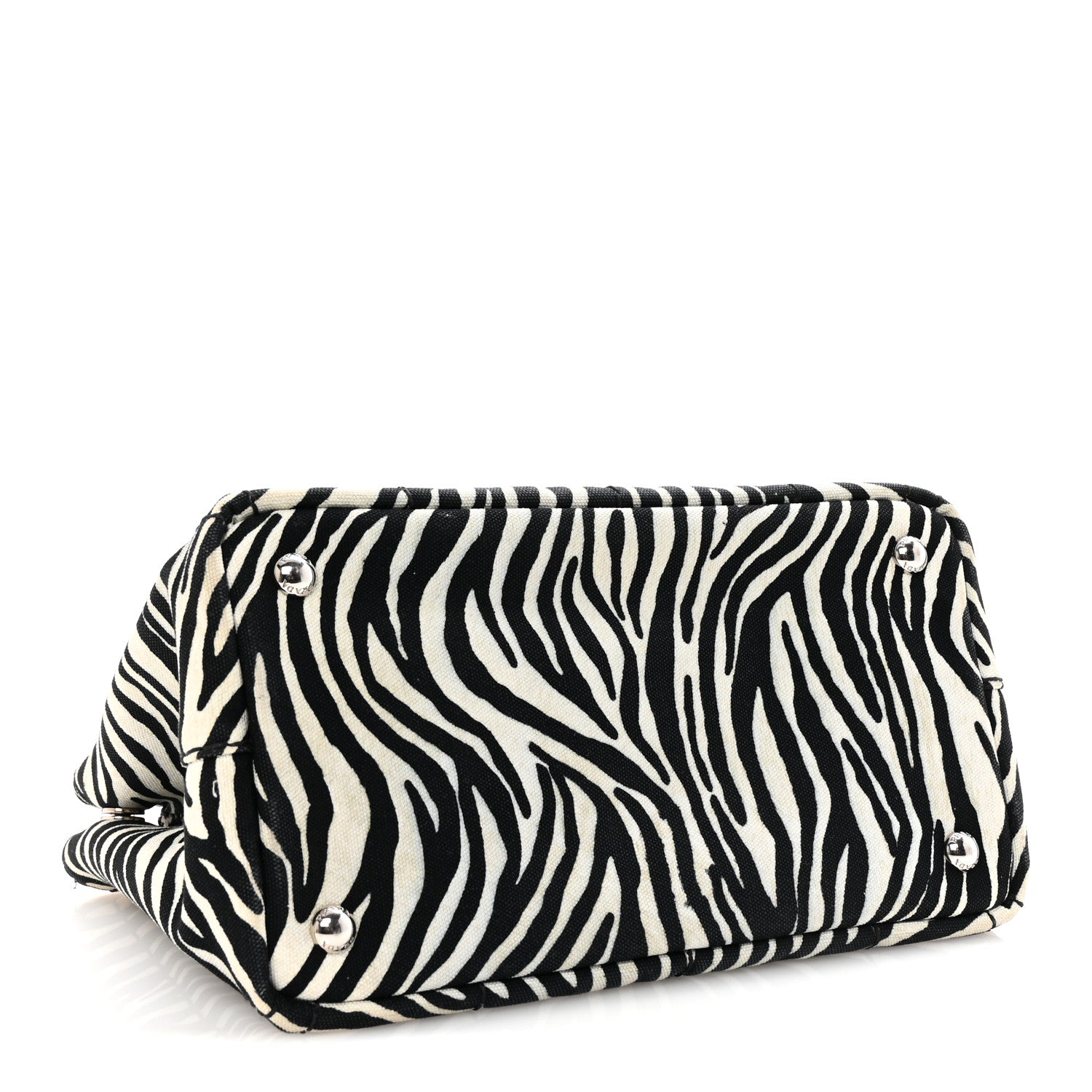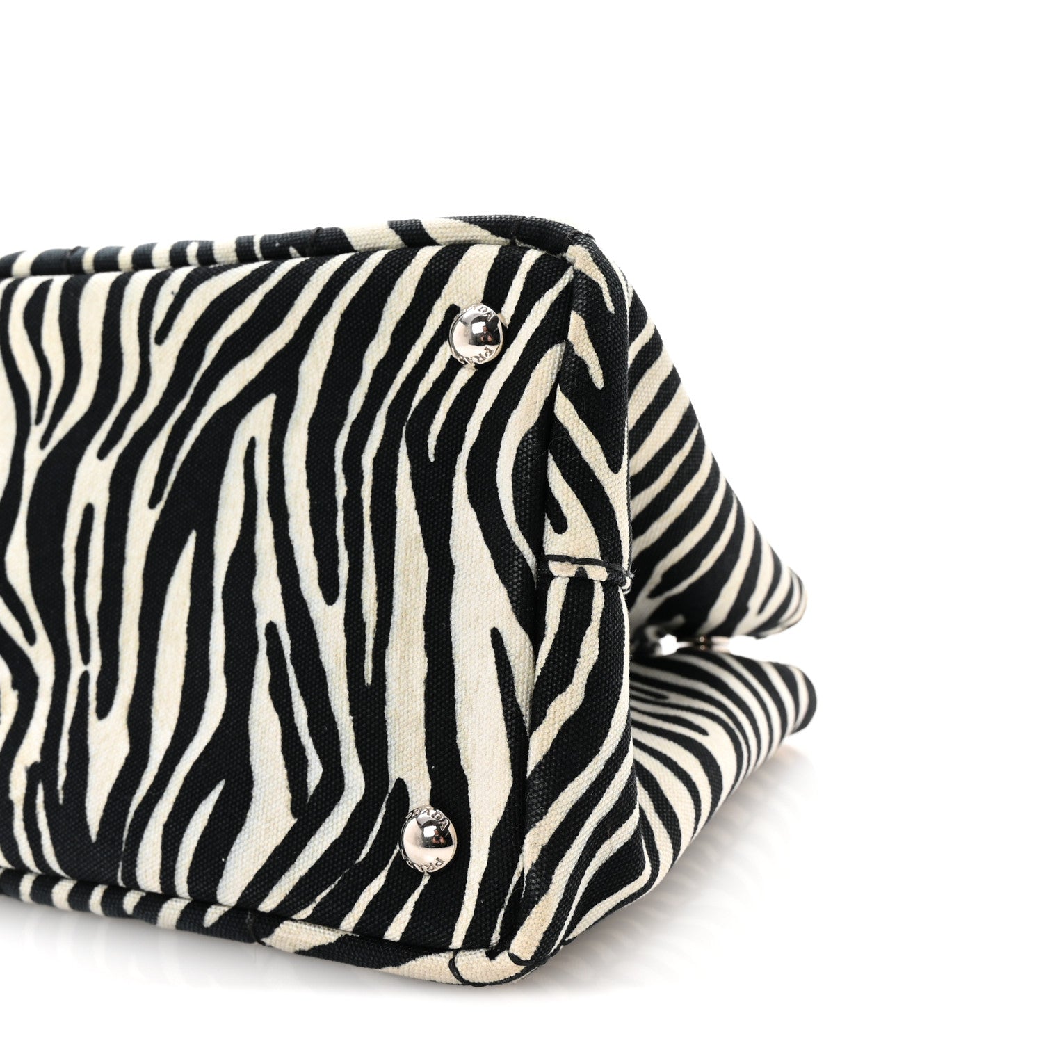 This is an authentic PRADA Canapa Zebra Small Tote in White Black. This stylish tote is crafted of zebra printed canvas. The bag features matching top handles, an optional black canvas shoulder strap, and silver hardware. The top opens to a black fabric interior with zipper and patch pockets.Follow this item for alerts. Prada is a registered trademark of Prada. FASHIONPHILE is not affiliated with Prada.