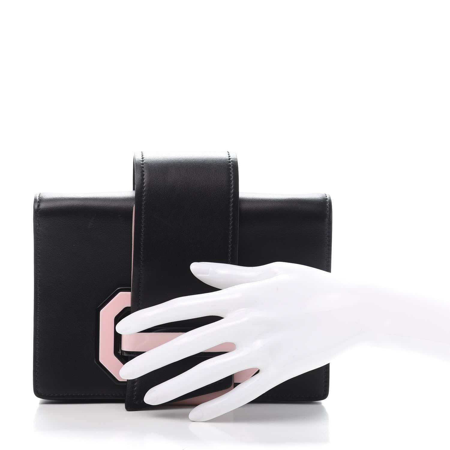 This is an authentic PRADA City Calf Plex Ribbon Bag in Black and Rosa. This chic shoulder bag is crafted of smooth calfskin leather in black. The bag features an optional leather shoulder strap and a leather "ribbon" strap that crosses the front through a pink plexiglass logo bar. This opens to a black monogram fabric interior with a simple patch pocket. This popular bag is ideal for all of your everyday essentials with the luxury and style, from Prada!Follow this item for alerts. Prada is a registered trademark of Prada. FASHIONPHILE is not affiliated with Prada.