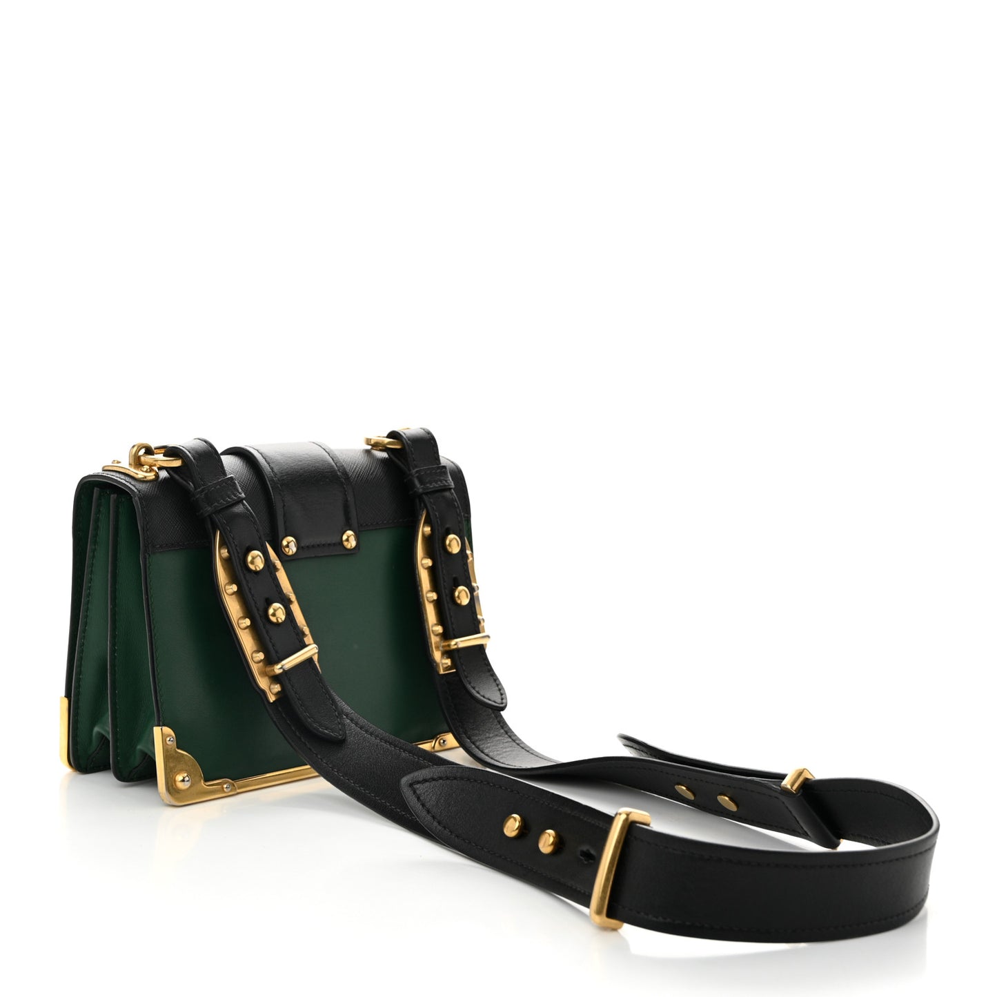 This is an authentic PRADA City Calf Saffiano Cahier Bag in Biliardo and Black. This stylish crossbody bag is crafted of calfskin leather in dark green and black. The bag features black saffiano crossgrain leather trim on the top, a gold chain shoulder strap with a leather shoulder pad, and brass hardware including corner plates and a bar closure. The bag opens to a partitioned black leather interior with patch pockets.Follow this item for alerts. Prada is a registered trademark of Prada. FASHIONPHILE is not affiliated with Prada.