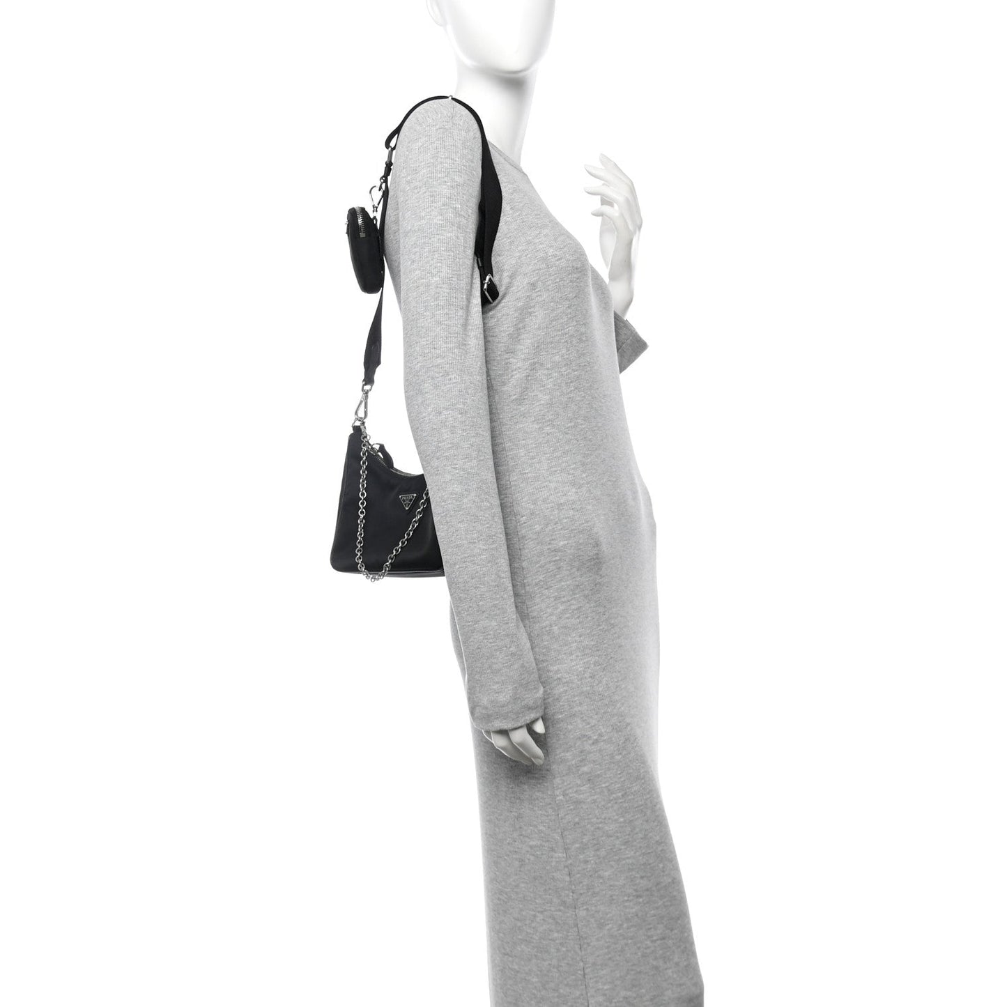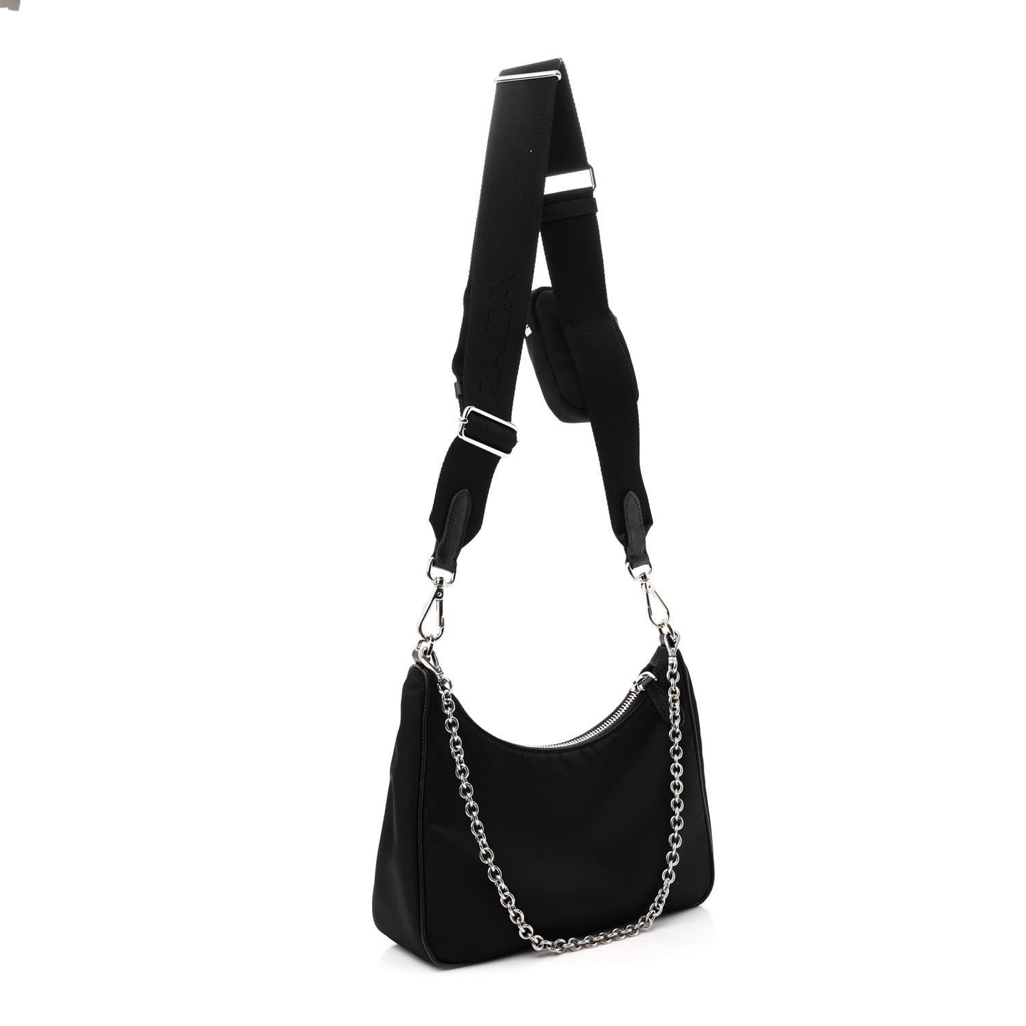 This is an authentic PRADA Nylon Re-Edition 2005 Shoulder Bag in Black. This petite messenger bag is crafted of fine nylon in black with matching black saffiano leather trim and gold hardware. The set features an adjustable black nylon shoulder strap, an optional silver chain-link strap, and a removable coin purse. The top zipper opens to a black Prada monogram jacquard fabric interior.Follow this item for alerts. Prada is a registered trademark of Prada. FASHIONPHILE is not affiliated with Prada.