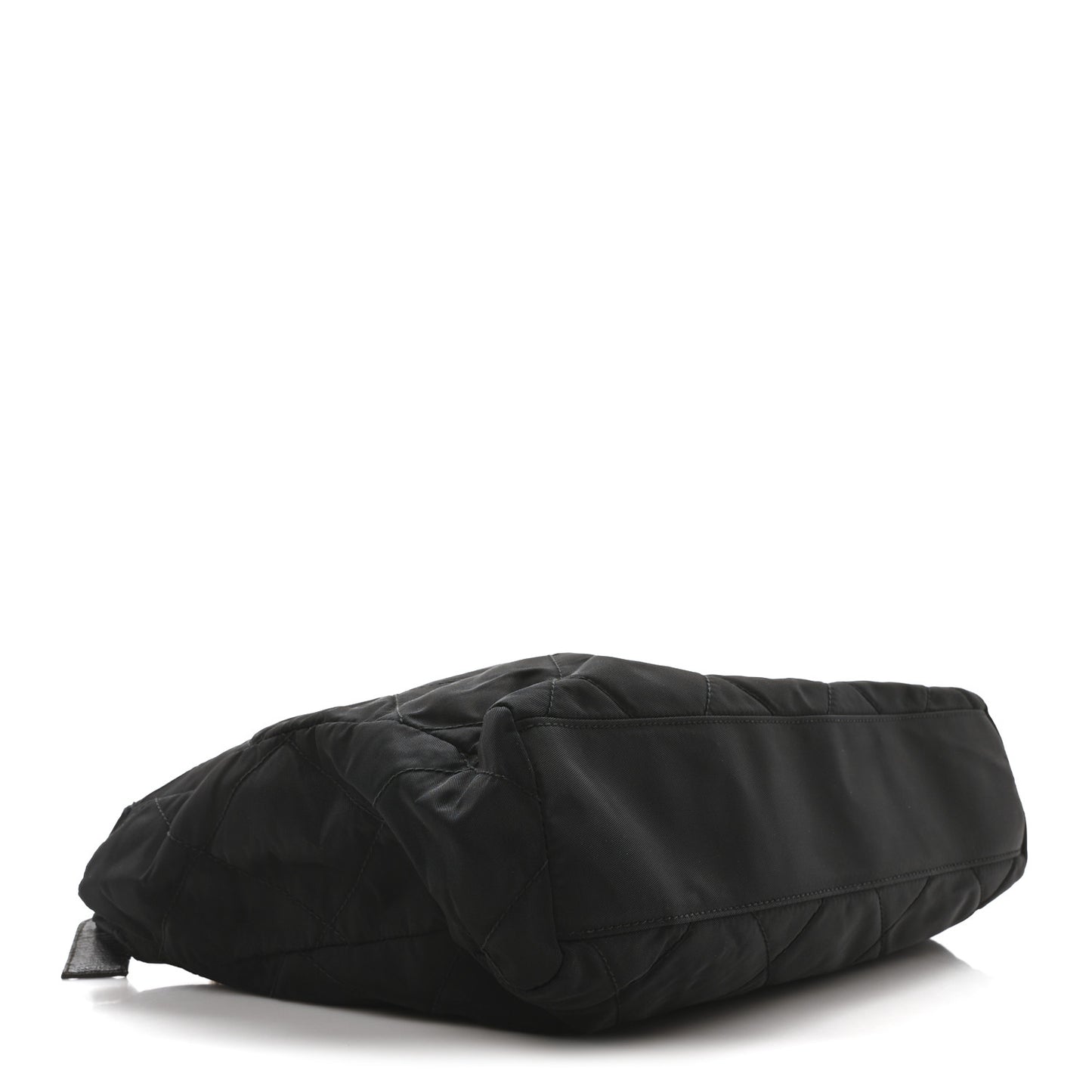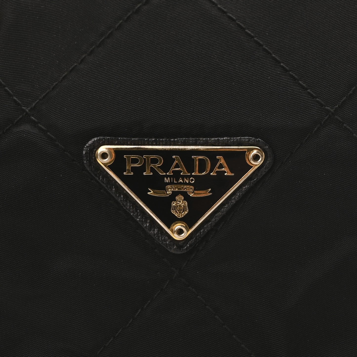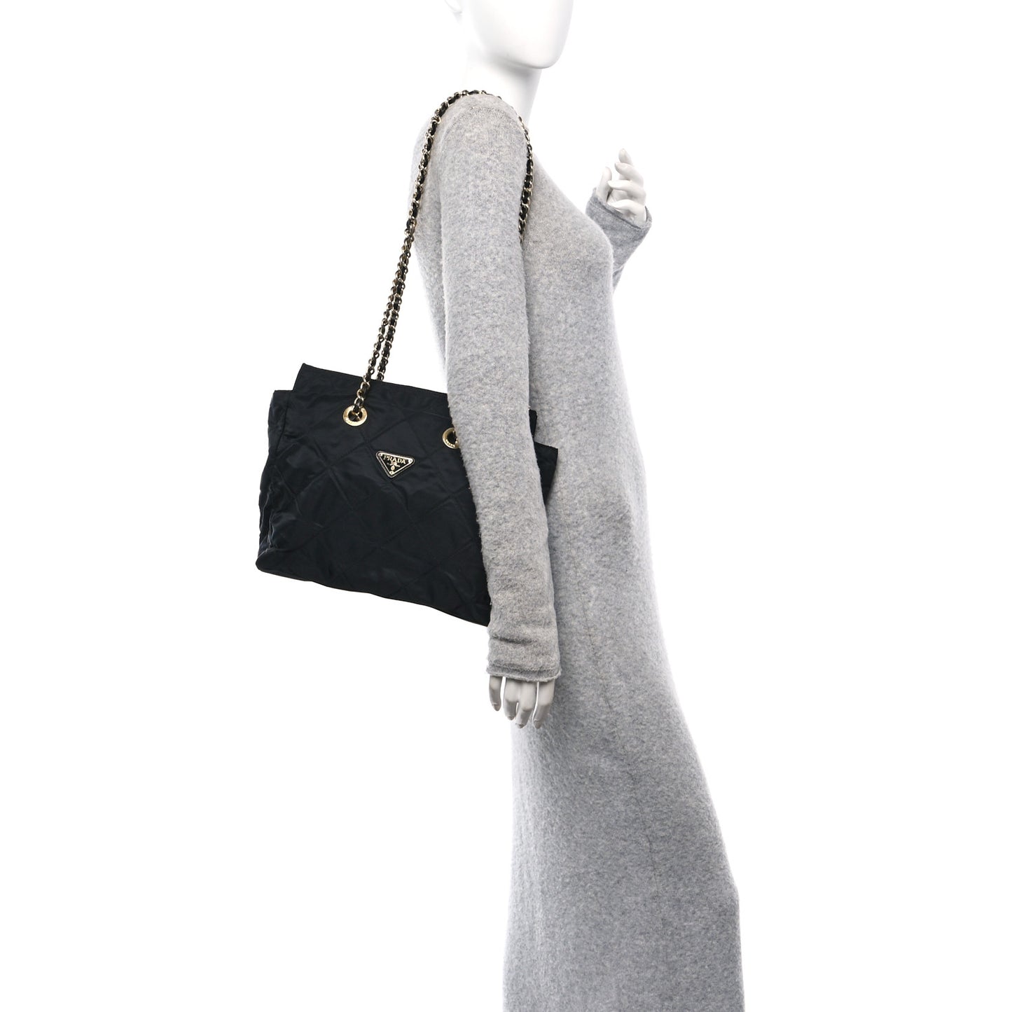 This is an authentic PRADA Nylon Tessuto Quilted Shoulder Bag in Black. This stunning shoulder bag is beautifully crafted of black diamond quilted fine tessuto nylon. The bag features a black leather threaded chain shoulder strap and polished gold hardware. The top zipper opens to a black Prada logo jacquard interior with zipper pocket.Follow this item for alerts. Prada is a registered trademark of Prada. FASHIONPHILE is not affiliated with Prada.