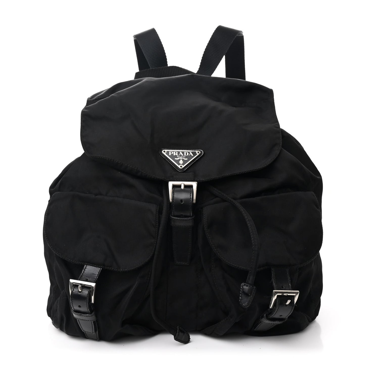This is an authentic PRADA Nylon Vela Medium Backpack in Black. This chic backpack is crafted of fine durable nylon in black and features a crossover top flap and two exterior pockets all with silver buckles and adjustable nylon shoulder straps. The top opens to a spacious black Prada logo jacquard interior with zipper and patch pockets.Follow this item for alerts. Prada is a registered trademark of Prada. FASHIONPHILE is not affiliated with Prada.