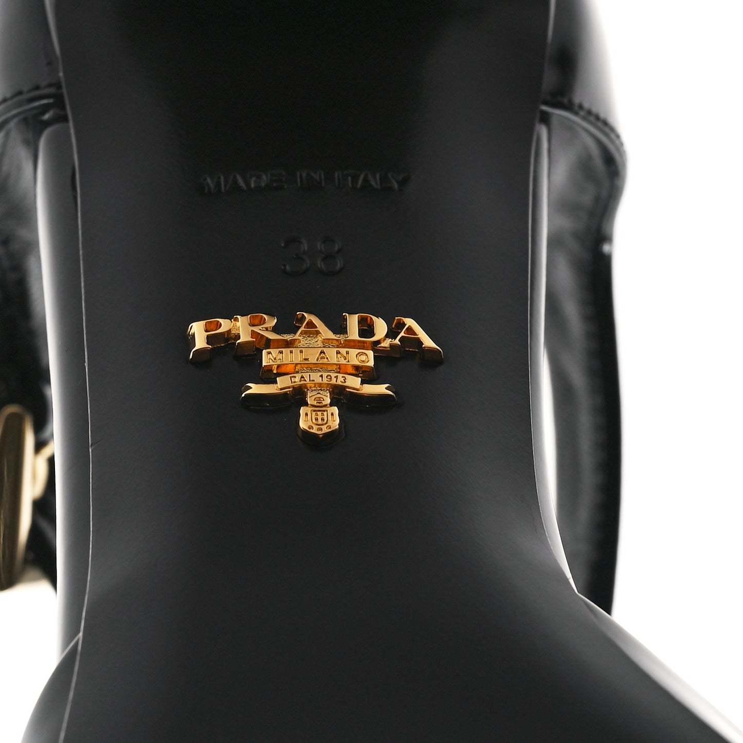 This is an authentic pair of PRADA Patent Triangle Squared Toe 35mm Pumps size 38 in Black. These stylish pumps are crafted of black patent leather. They feature black and gold logos on the top, squared toes, adjustable buckle ankle straps, and 1.5-inch heelsFollow this item for alerts. Prada is a registered trademark of Prada. FASHIONPHILE is not affiliated with Prada.