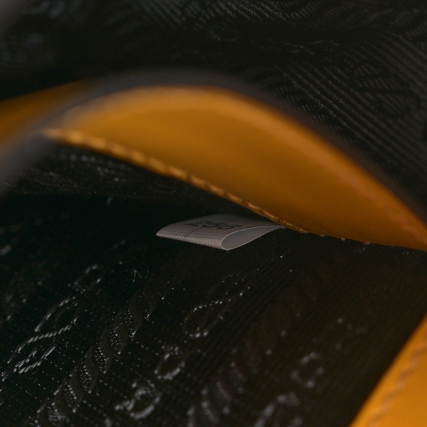 This is an authentic PRADA Saffiano City Calf Cahier Belt Bag in Soleil and Black. This stylish versatile bag is crafted of smooth calfskin leather. The bag features an adjustable black leather belt, aged brass hardware including shoulder chain and closure. The top flap opens to a black Prada jacquard fabric and yellow leather interior with patch pockets.Follow this item for alerts. Prada is a registered trademark of Prada. FASHIONPHILE is not affiliated with Prada.