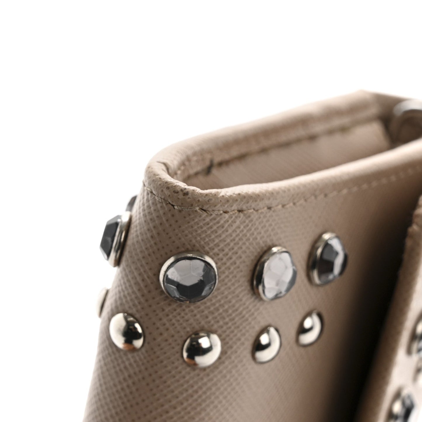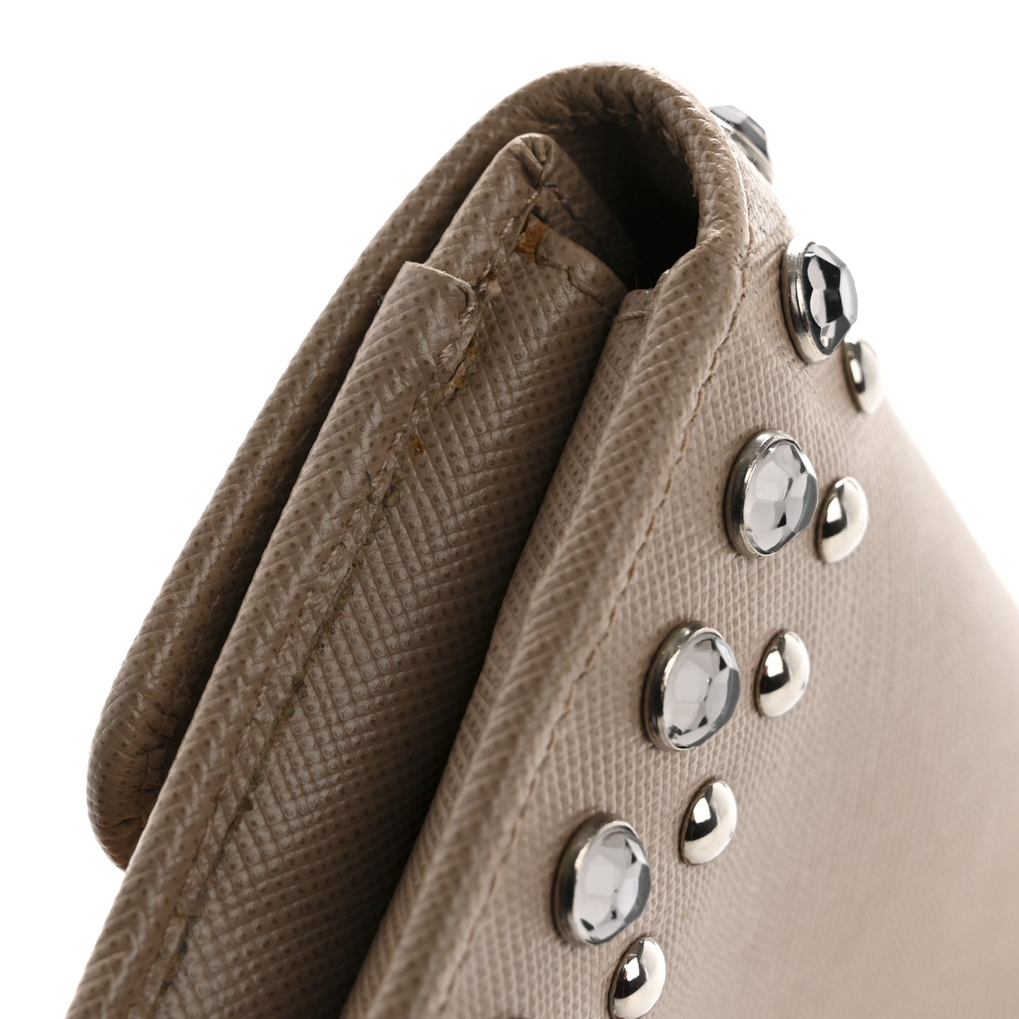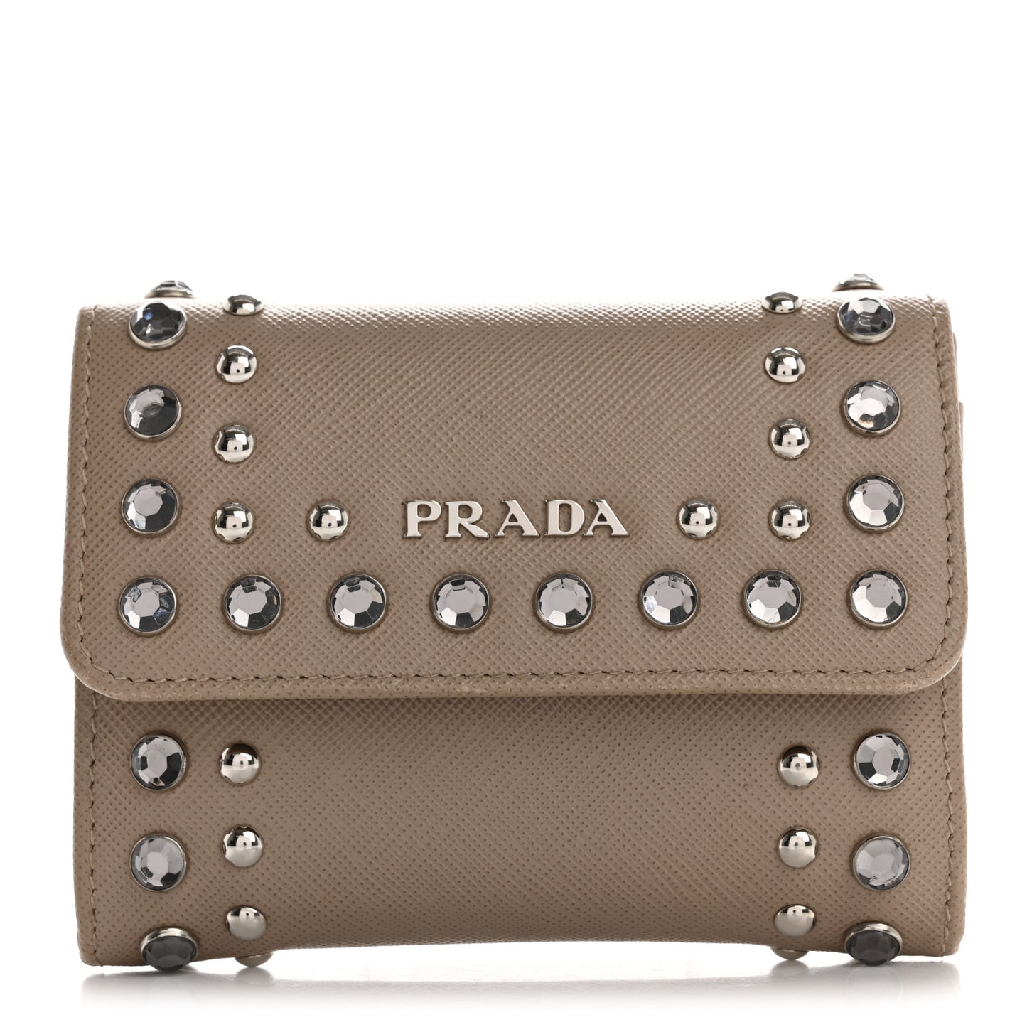 This is an authentic PRADA Saffiano Crystal Card Holder in Cammeo. This is a chic, compact wallet that is finely crafted of cross-grain leather in beige. The wallet opens with a snap to a matching leather interior.Follow this item for alerts. Prada is a registered trademark of Prada. FASHIONPHILE is not affiliated with Prada.
