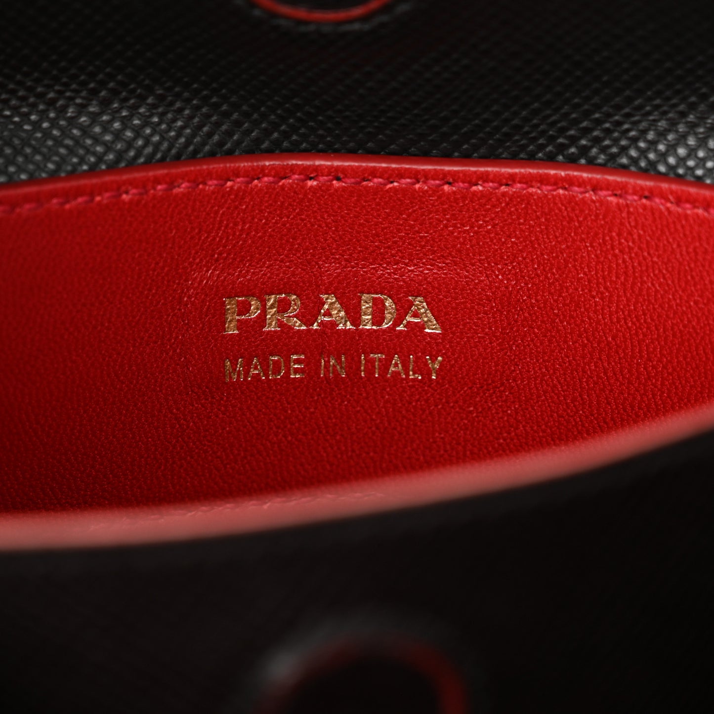 This is an authentic PRADA Saffiano Cuir Medium Double Bag in Black and Fuoco. This bold tote is crafted of luxurious Prada saffiano cross-grain leather in black with red resin glazing. The bag features rolled leather top handles, and an optional with polished gold hardware. The top is open to a partitioned smooth red leather interior with a center flap pocket.Follow this item for alerts. Prada is a registered trademark of Prada. FASHIONPHILE is not affiliated with Prada.