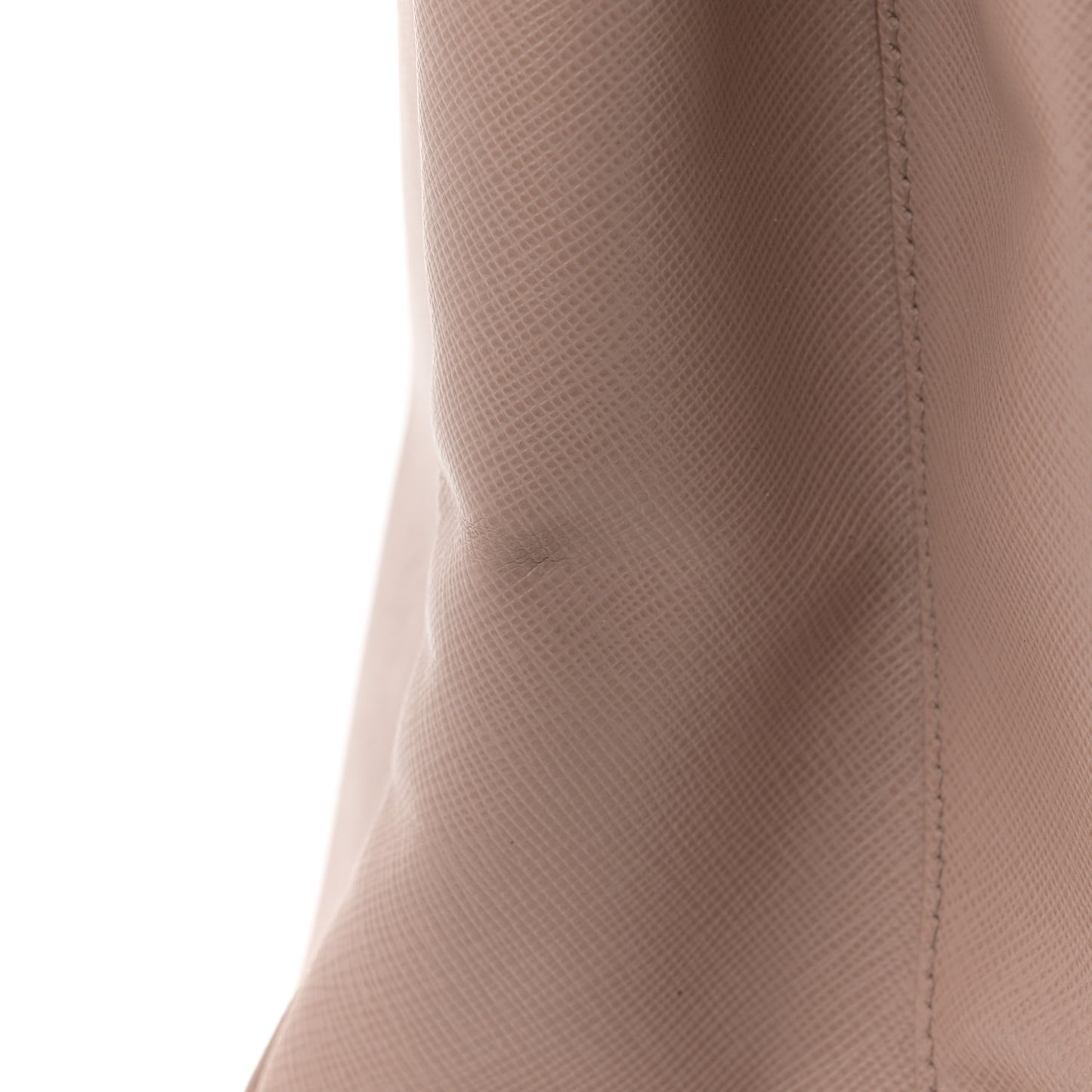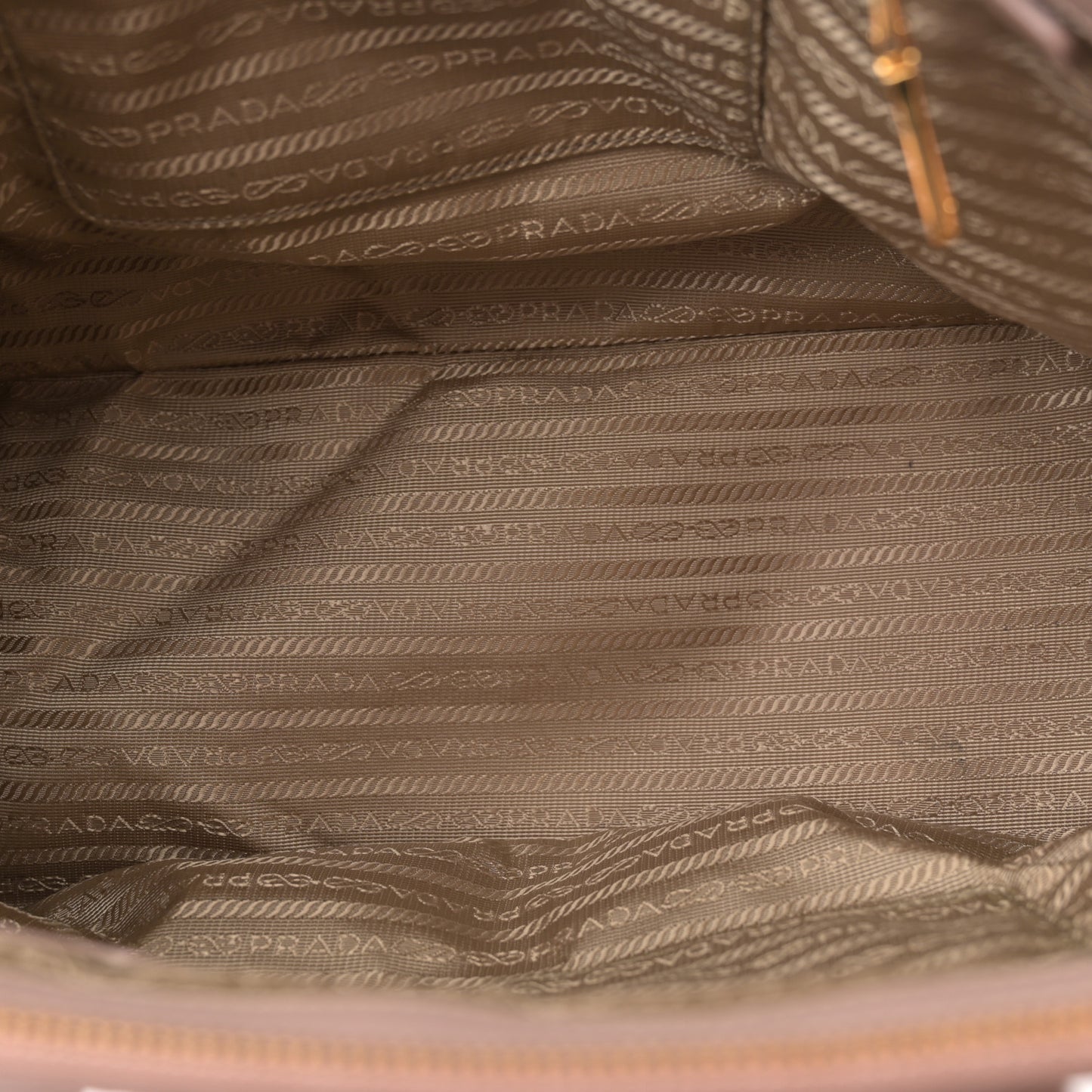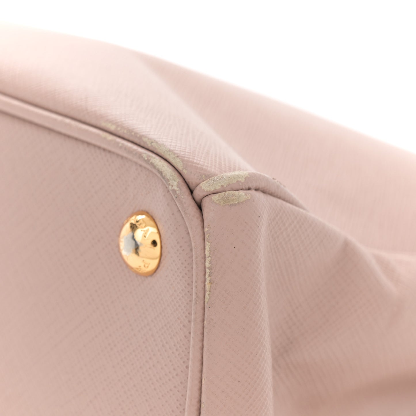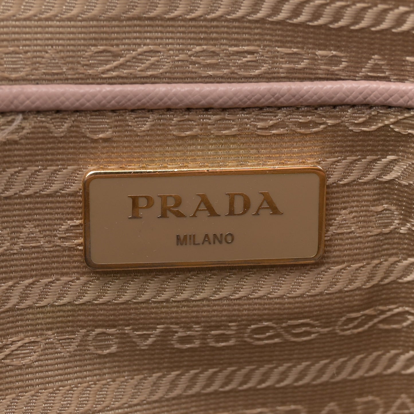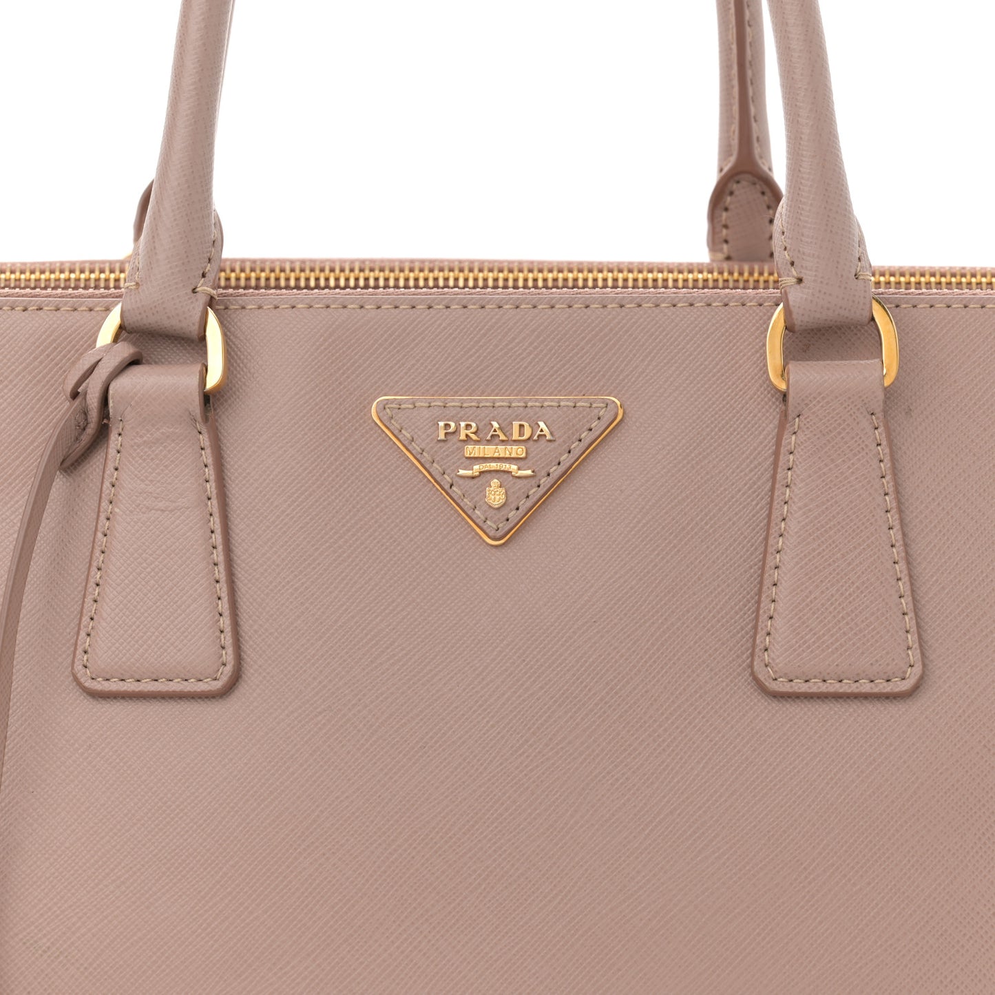This is an authentic PRADA Saffiano Large Galleria Double Zip Tote in Cipria. This chic tote is crafted of lustrous Saffiano cross grain leather in a beige. The handbag features rolled leather top handles with gold links. The top is open to a beige color Prada jacquard monogram interior with full zipper pockets on either side of the top and zipper and patch pocket inside.Follow this item for alerts. Prada is a registered trademark of Prada. FASHIONPHILE is not affiliated with Prada.
