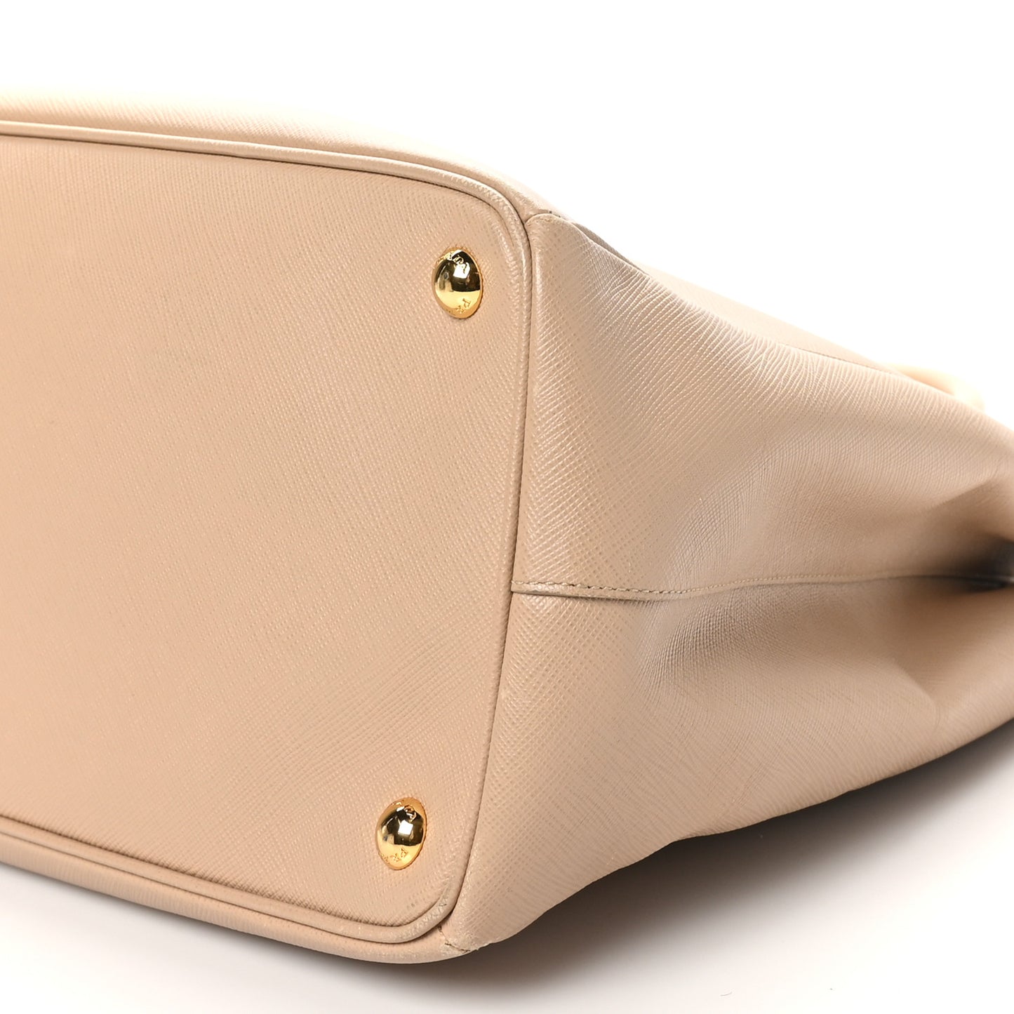 This is an authentic PRADA Saffiano Large Galleria Double Zip Tote in Pomice. This chic tote is crafted of Saffiano cross-grain leather in a beige. It features rolled leather top handles with gold links and clasps. The top is open to a gold color Prada jacquard monogram interior with full zipper pockets on either side.Follow this item for alerts. Prada is a registered trademark of Prada. FASHIONPHILE is not affiliated with Prada.