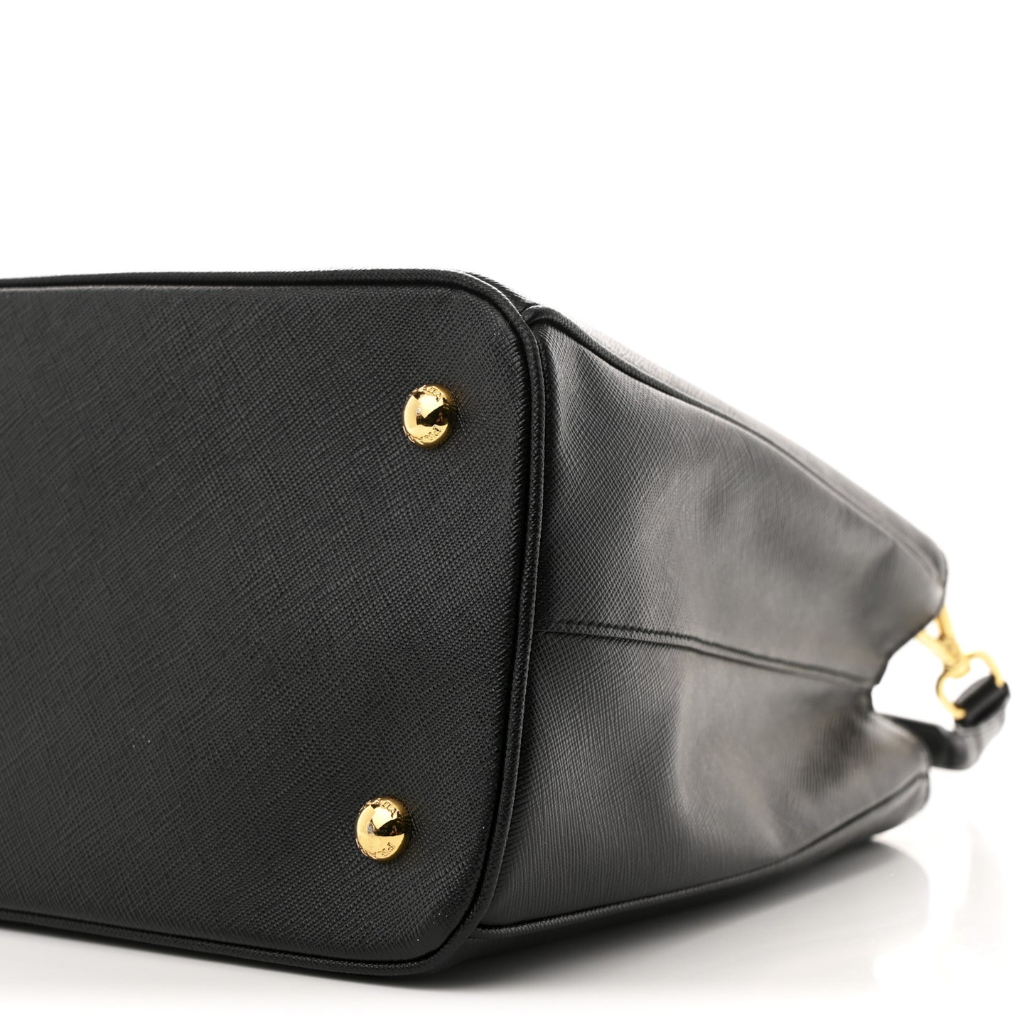 This is an authentic PRADA Saffiano Medium Galleria Double Zip Tote in Black. This chic tote is crafted of Saffiano cross-grain leather in black. The bag features rolled leather top handles with polished brass links, an optional shoulder strap with brass clasps, with a hanging bag charm. The top is open and features two full length side zippered compartments and a black Prada monogram jacquard interior with zipper and patch pockets.Follow this item for alerts. Prada is a registered trademark of Prada. FASHIONPHILE is not affiliated with Prada.