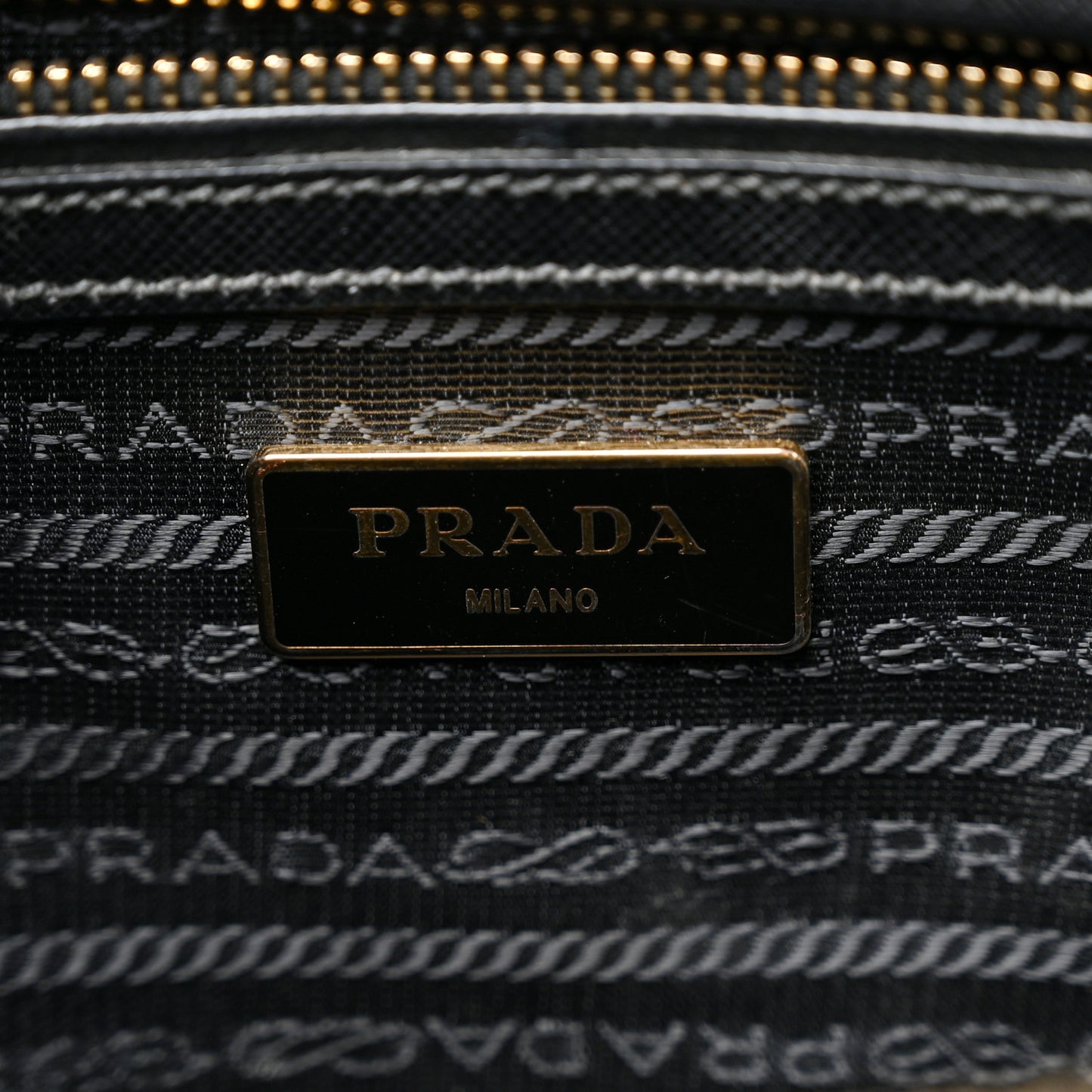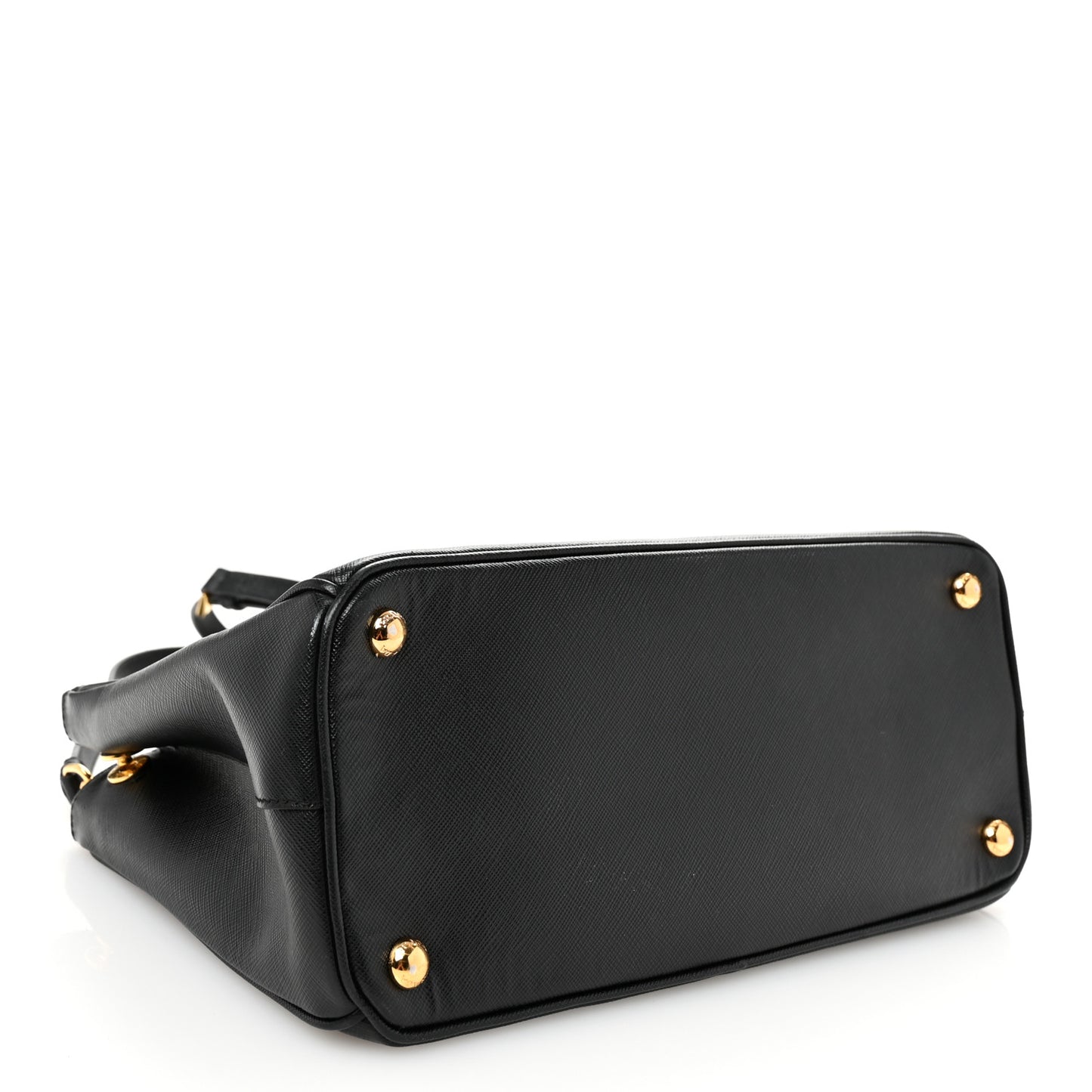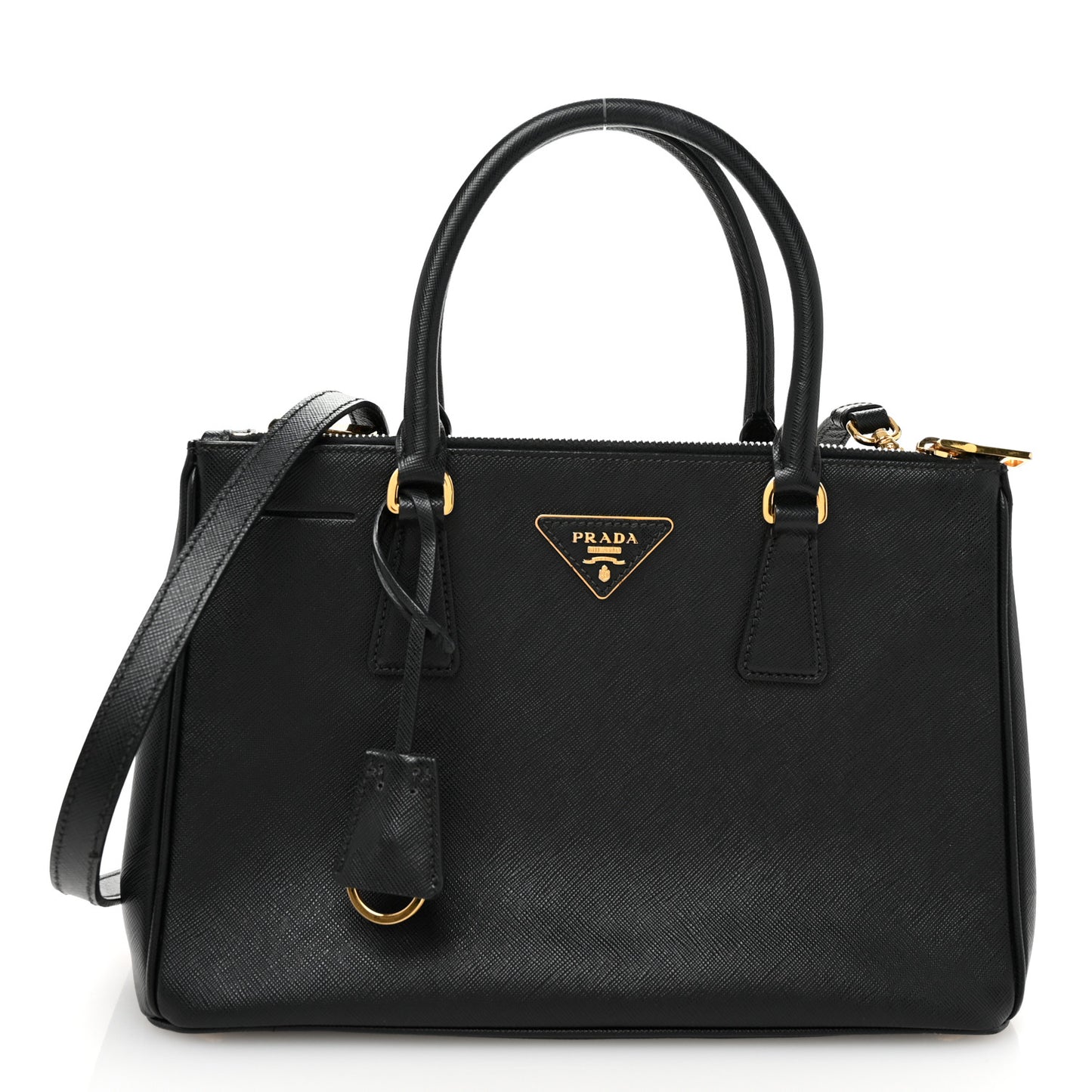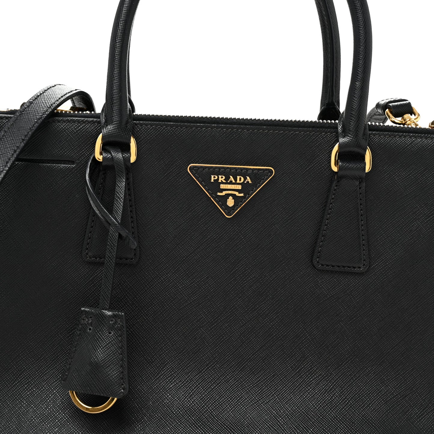 This is an authentic PRADA Saffiano Small Galleria Double Zip Tote in Black. This chic tote is crafted of Saffiano cross-grain leather in black. The bag features rolled leather top handles with polished brass links, an optional shoulder strap with brass clasps, with a hanging clochette. The top is open and features two full-length side zippered compartments and a black Prada monogram jacquard interior with zipper and patch pockets.Follow this item for alerts. Prada is a registered trademark of Prada. FASHIONPHILE is not affiliated with Prada.