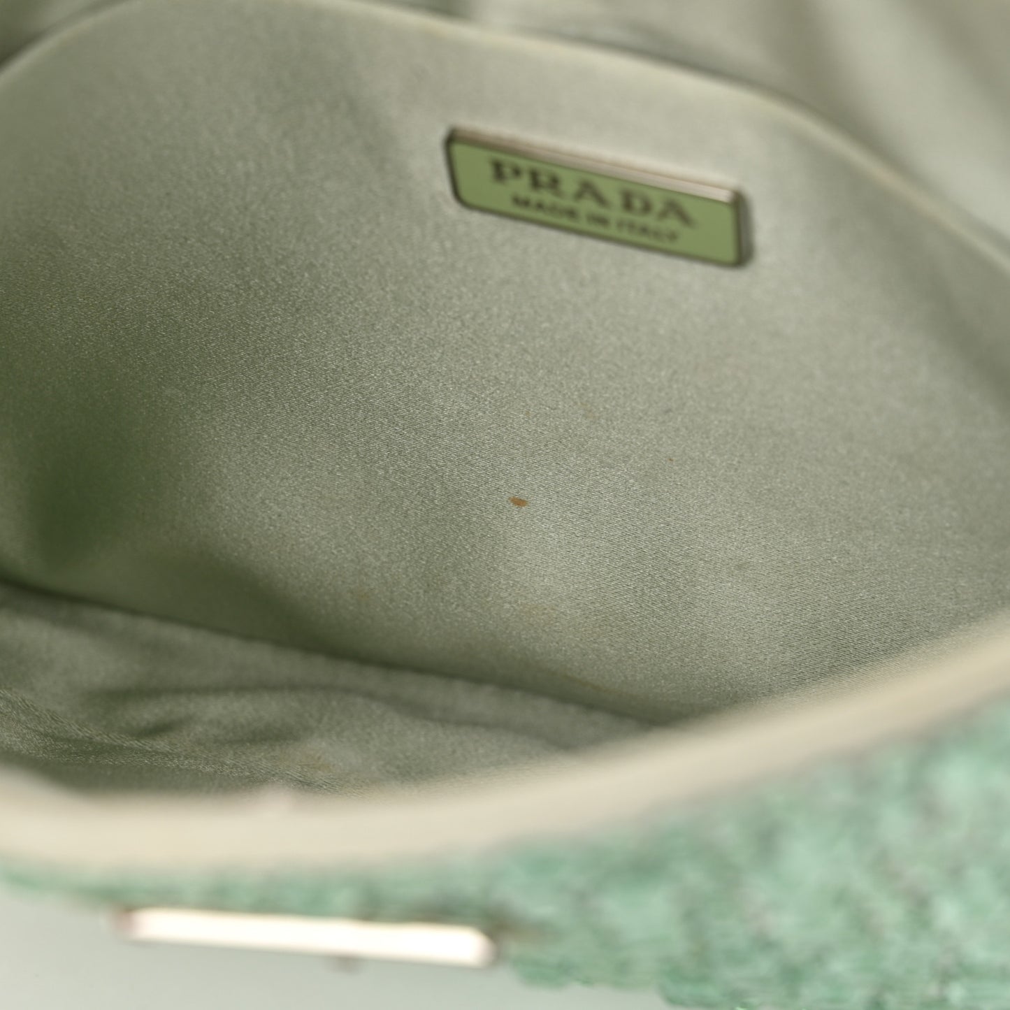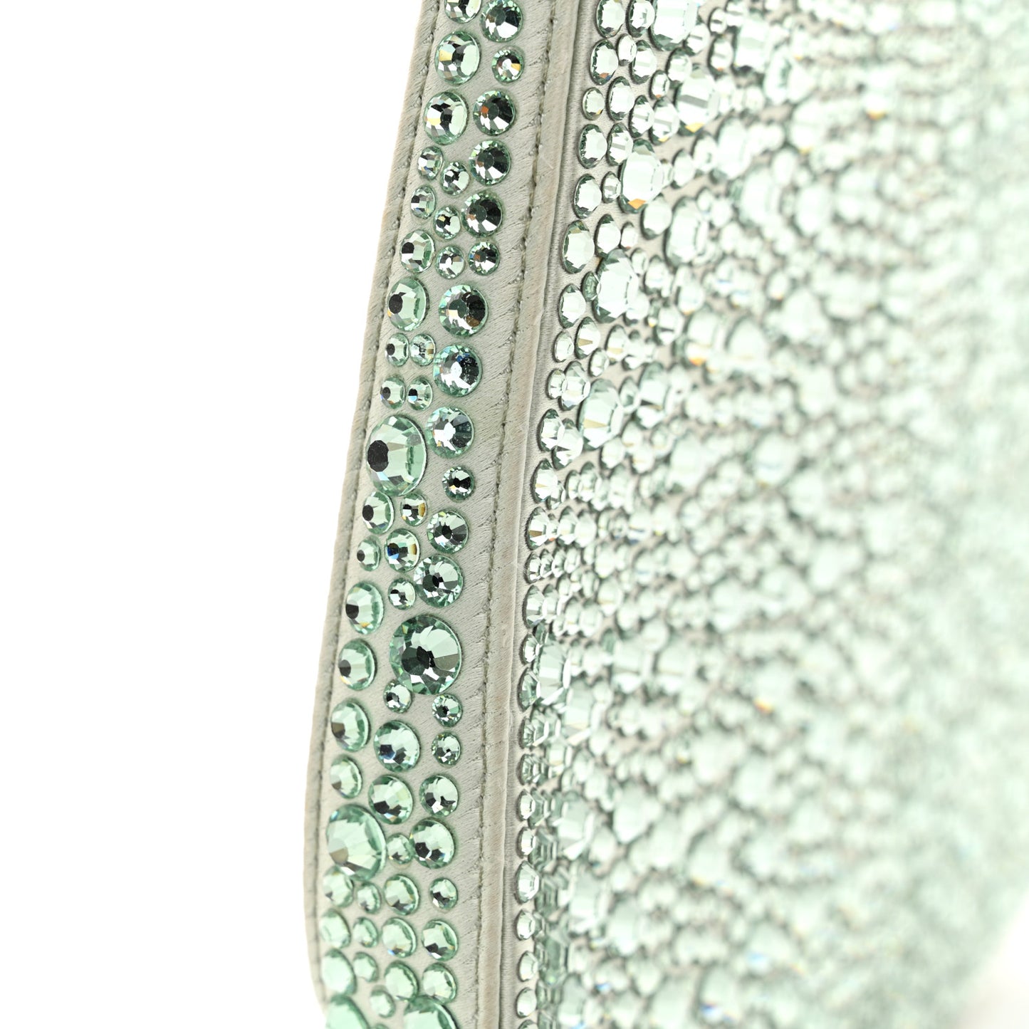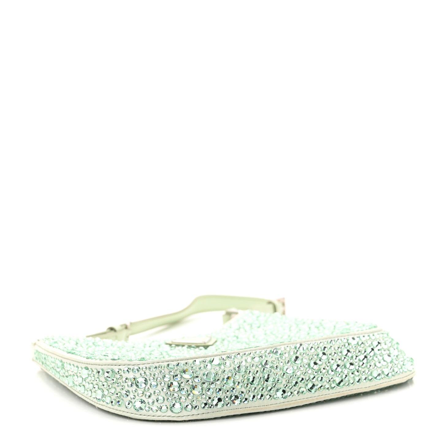 This is an authentic PRADA Satin Crystal Cleo Adjustable Strap Shoulder Bag in Acqua. This stylish shoulder bag is crafted of green satin with crystals throughout. It includes 2 interchangeable patent leather shoulder straps in different lengths, a magnetic closure, and a matching satin interior with a pocket.Follow this item for alerts. Prada is a registered trademark of Prada. FASHIONPHILE is not affiliated with Prada.