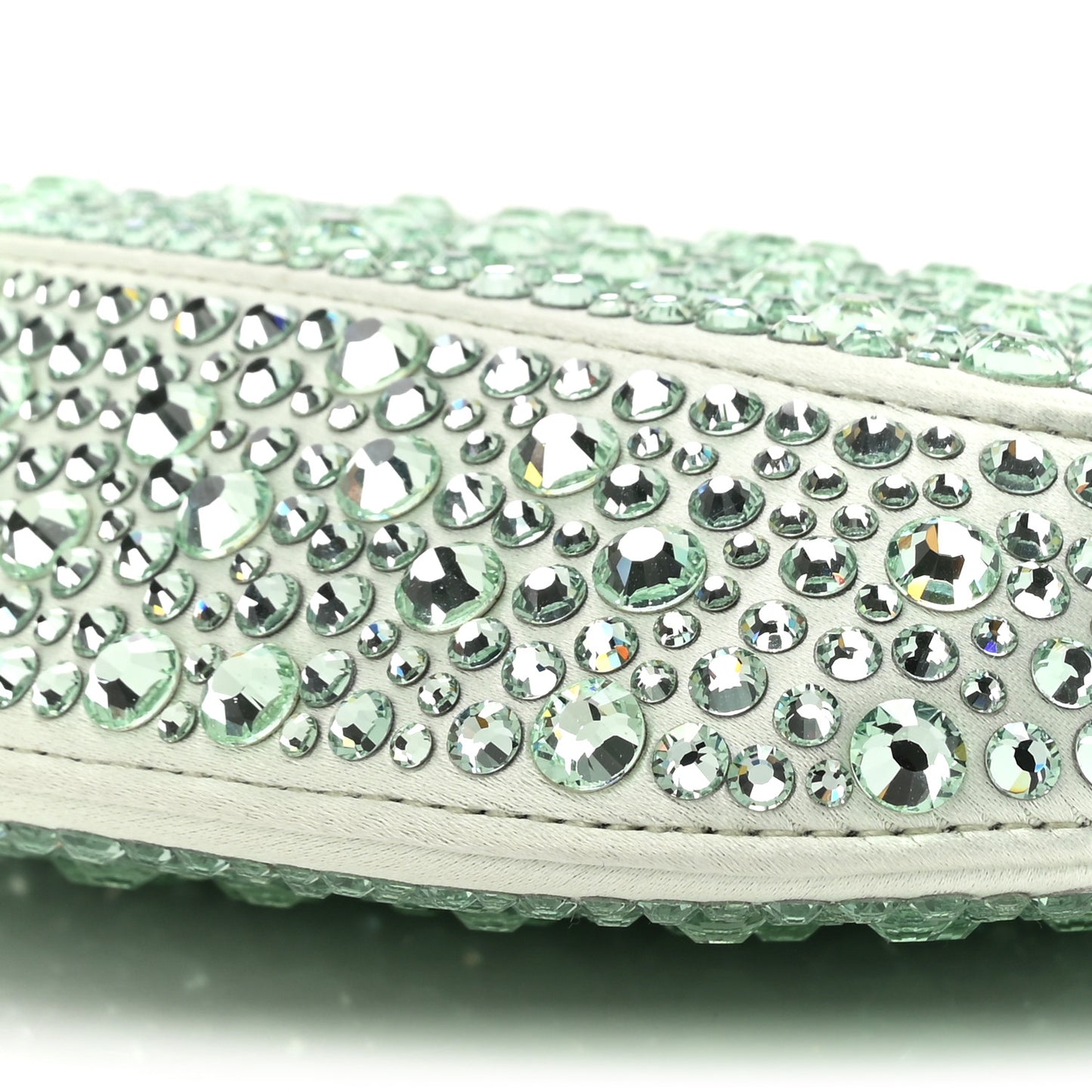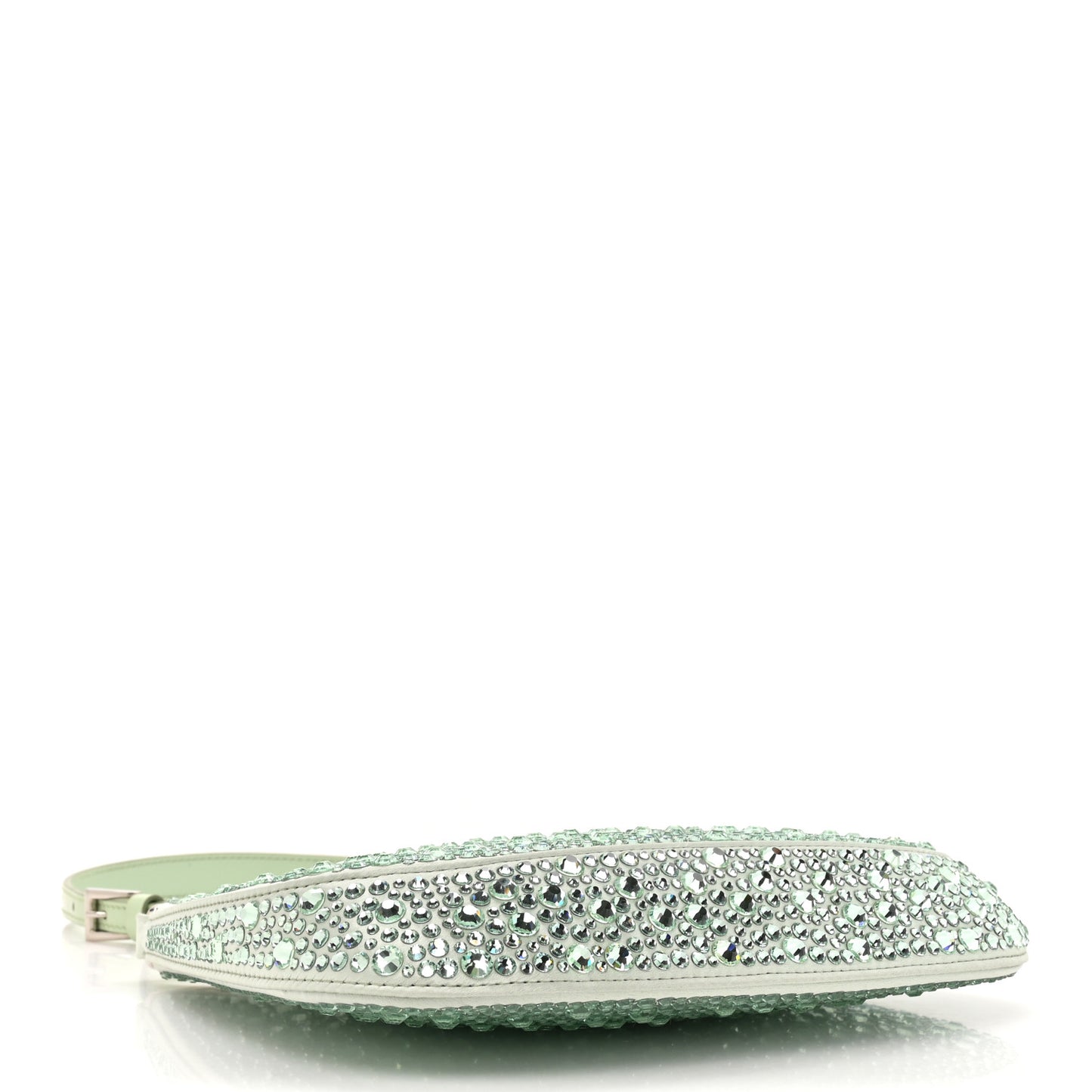 This is an authentic PRADA Satin Crystal Cleo Adjustable Strap Shoulder Bag in Acqua. This stylish shoulder bag is crafted of green satin with crystals throughout. It includes 2 interchangeable patent leather shoulder straps in different lengths, a magnetic closure, and a matching satin interior with a pocket.Follow this item for alerts. Prada is a registered trademark of Prada. FASHIONPHILE is not affiliated with Prada.