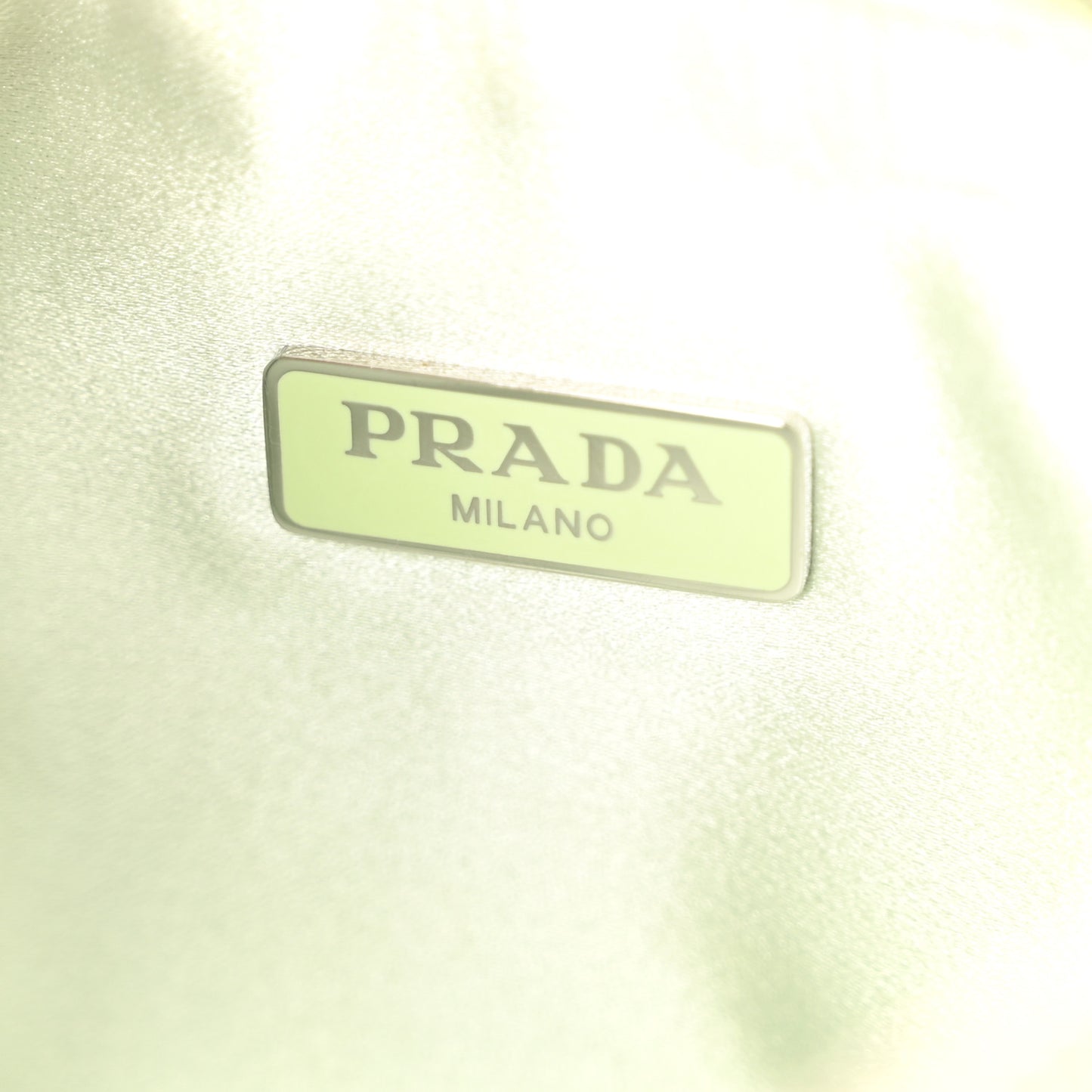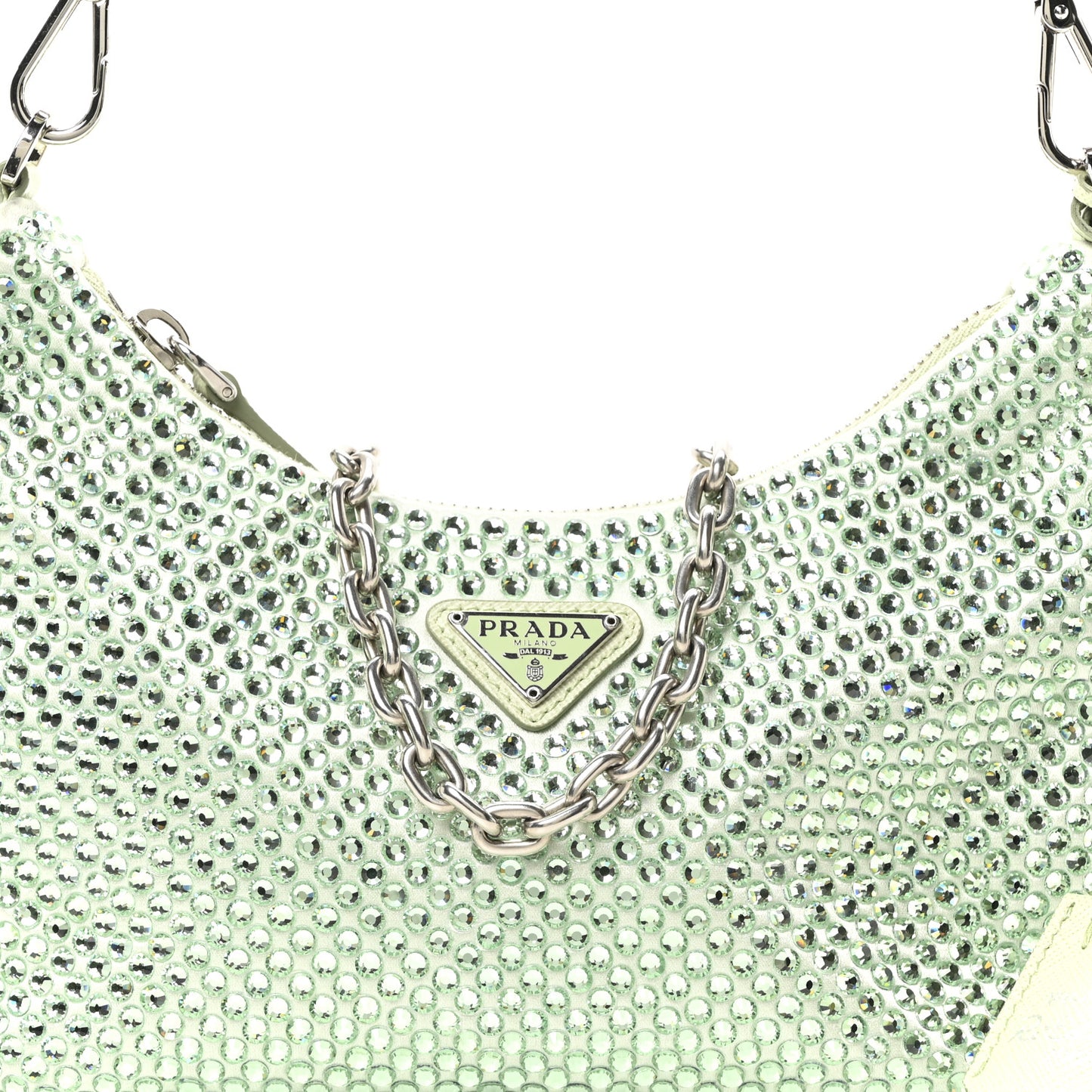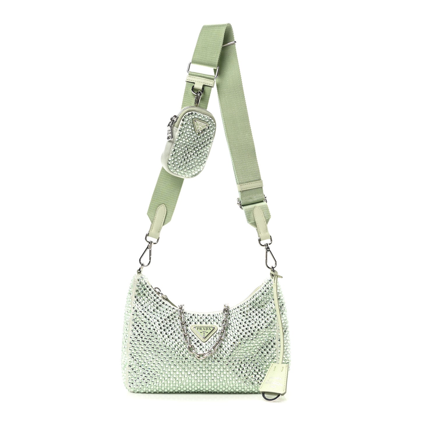 This is an authentic PRADA Satin Crystal Re-Edition 2005 Shoulder Bag in Acqua. This Prada handbag is crafted of crystal-embellished satin with silver hardware. The bag features a nylon shoulder strap and the top zipper opens to a light green fabric interior.Follow this item for alerts. Prada is a registered trademark of Prada. FASHIONPHILE is not affiliated with Prada.