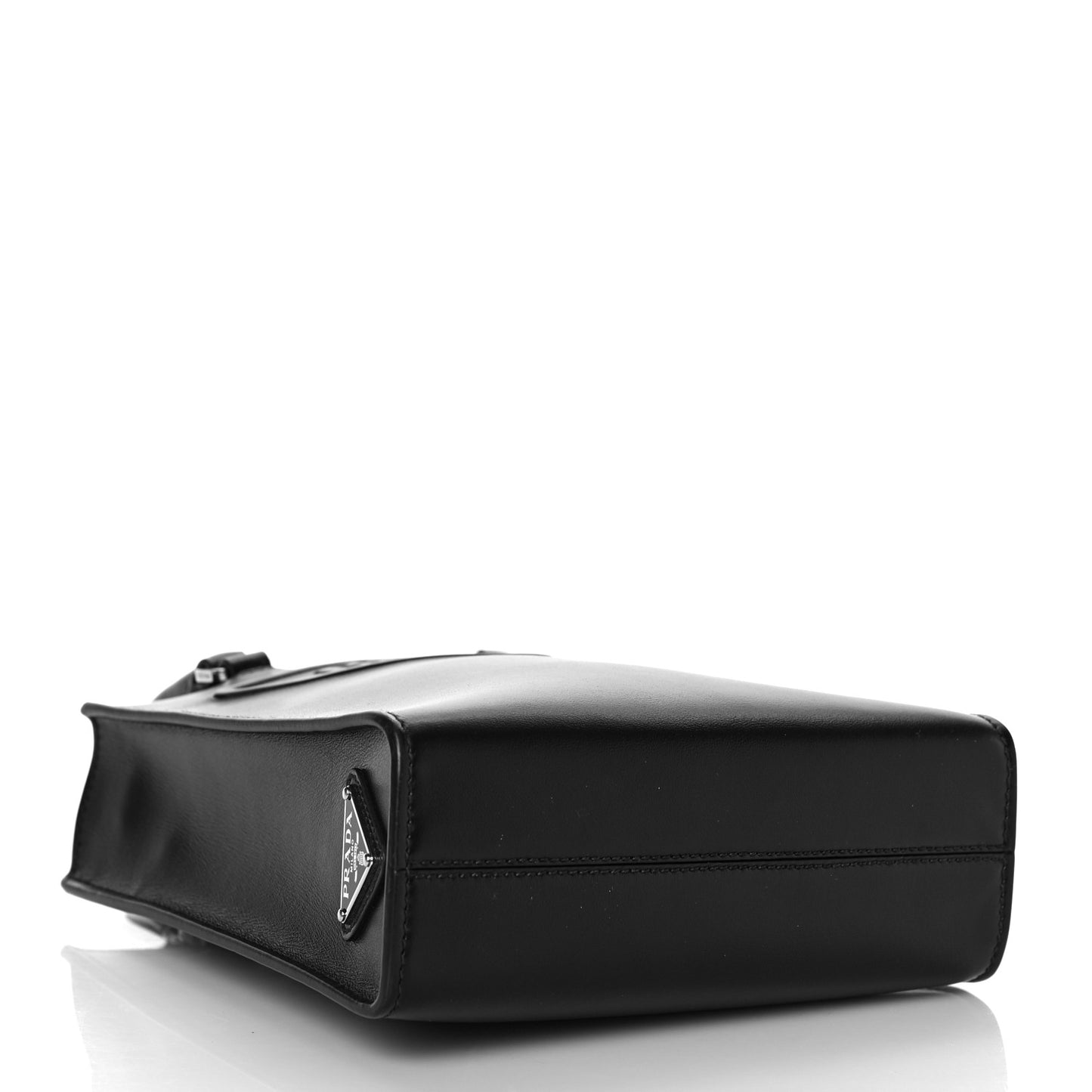 This is an authentic PRADA Soft Calfskin Triangle Logo Embossed Small Double Handle Crossbody Tote in Black. This chic tote is crafted of calfskin leather in black. The bag features rolled leather top handles and an adjustable black shoulder strap. The top is open to a black Prada monogram jacquard fabric interior.Follow this item for alerts. Prada is a registered trademark of Prada. FASHIONPHILE is not affiliated with Prada.