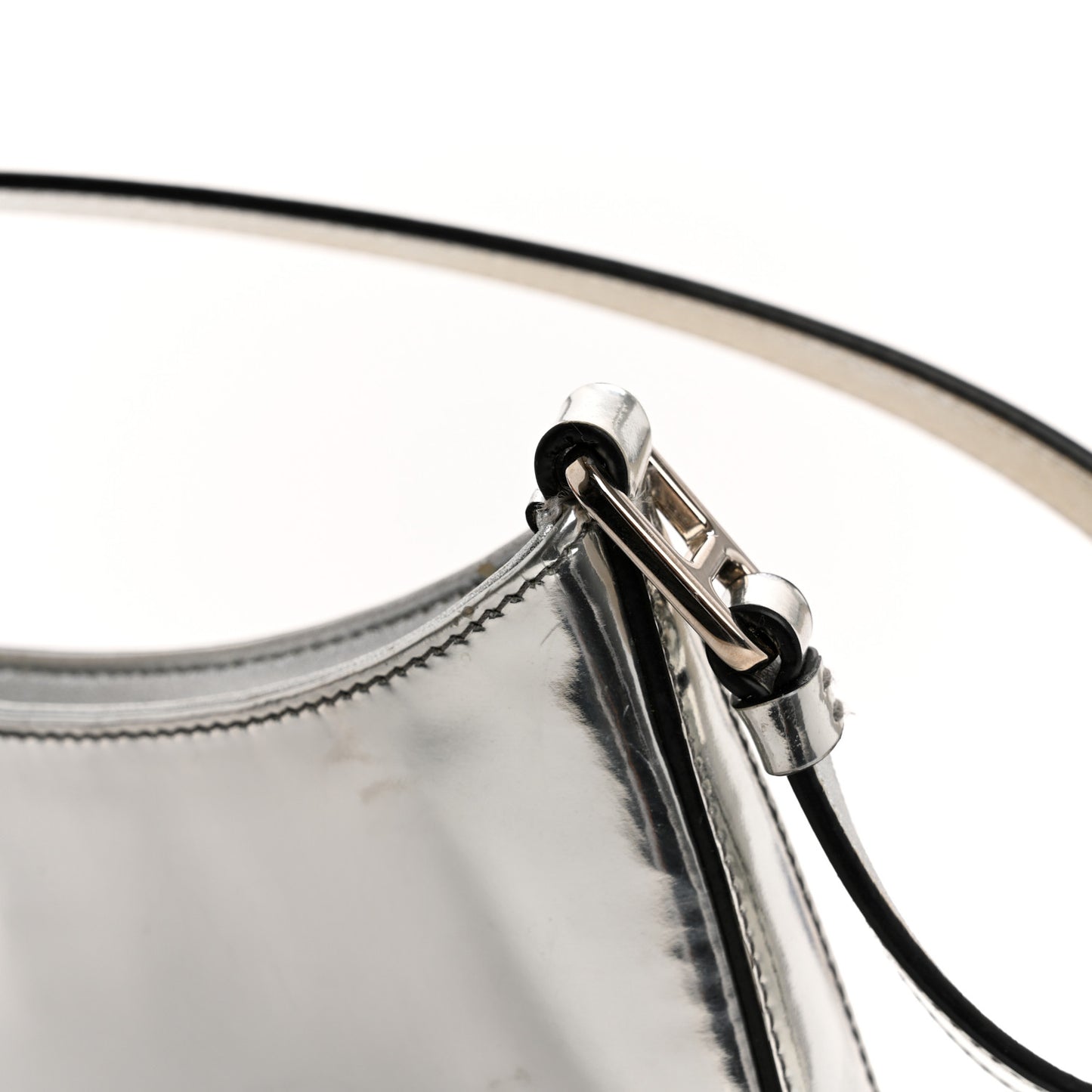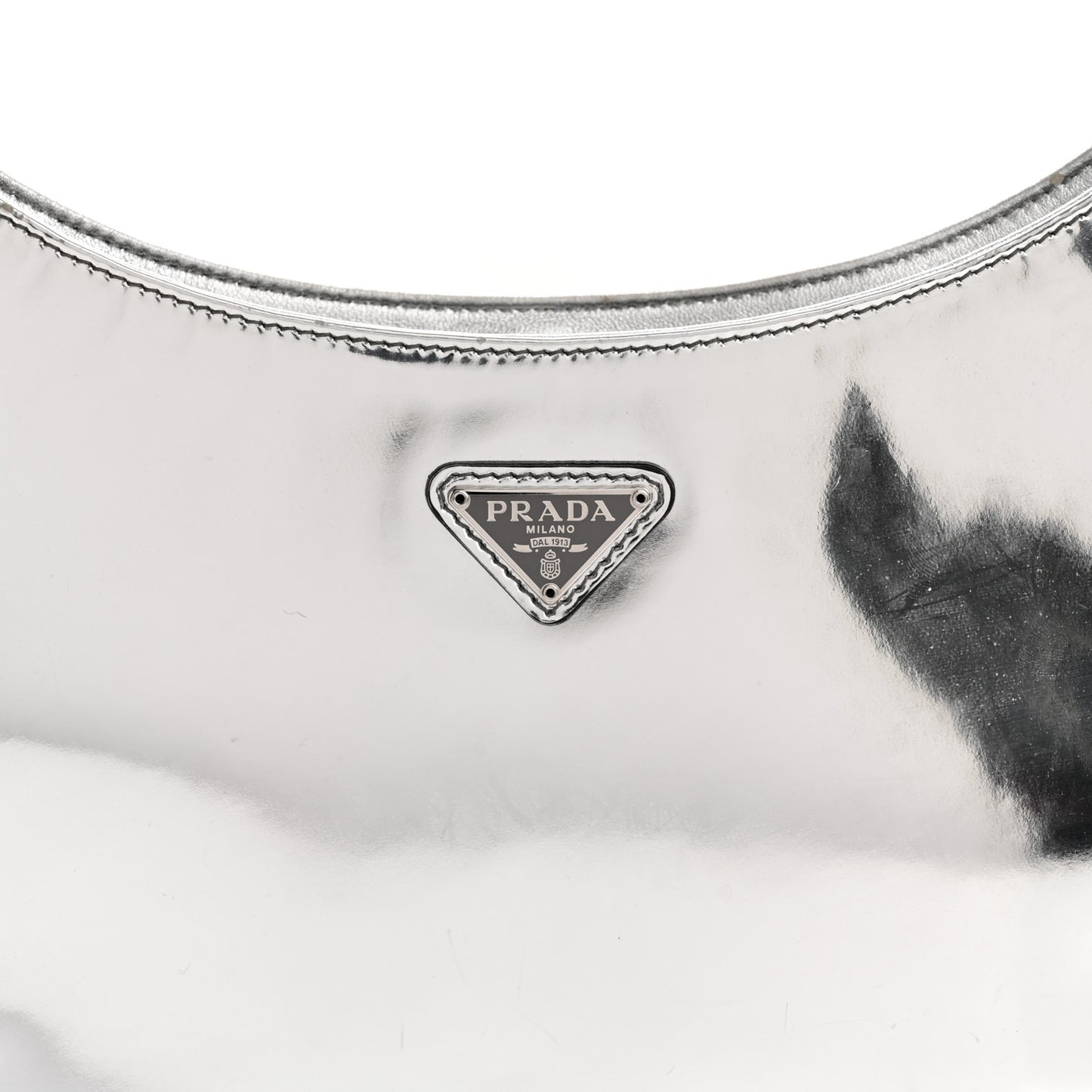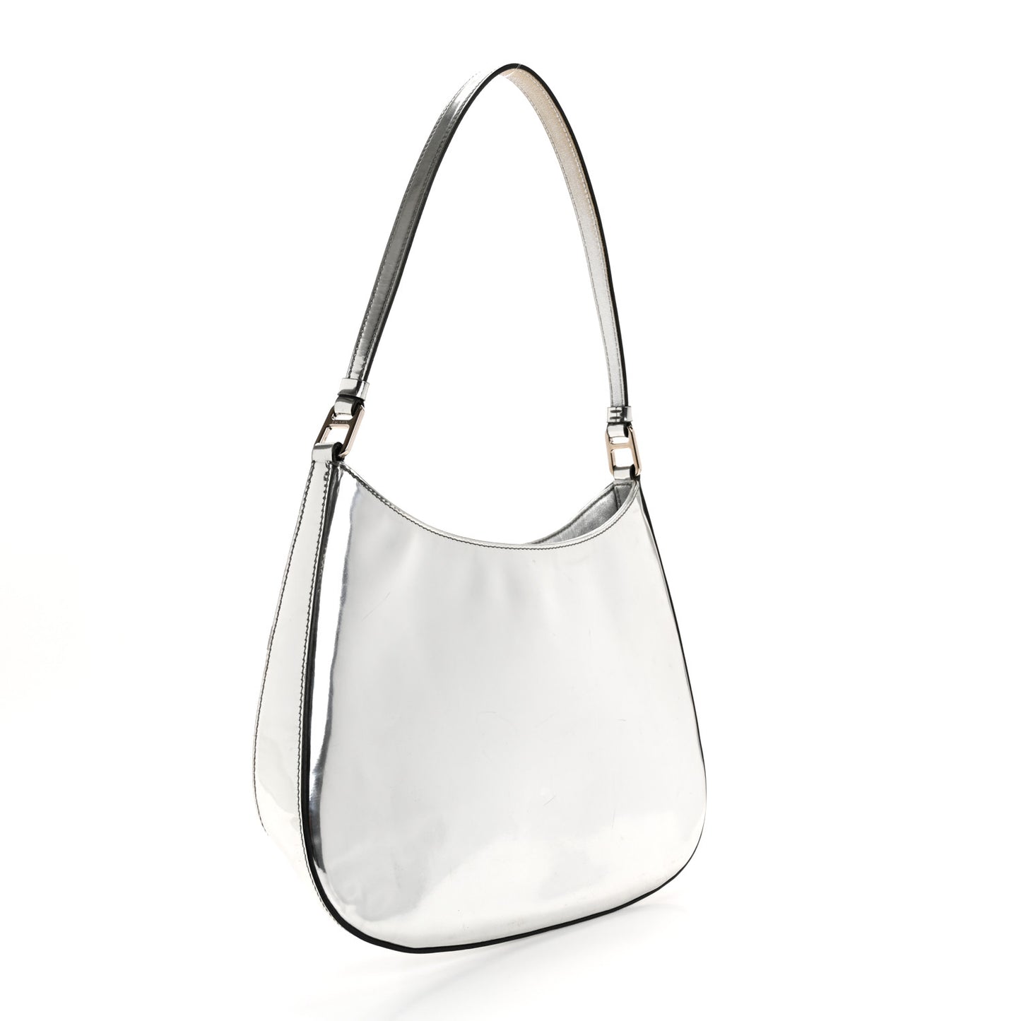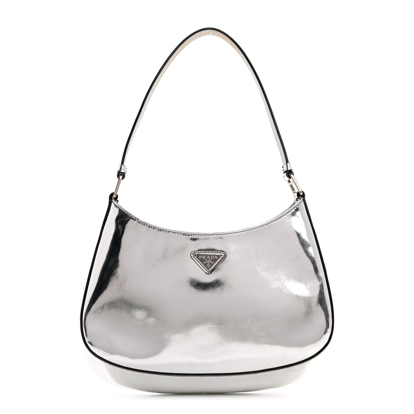 This is an authentic PRADA Spazzolato Cleo Shoulder Bag in Argento. This chic shoulder bag is crafted of metallic silver patent leather. The bag features a matching leather shoulder strap and a triangle Prada logo. The magnetic closure opens to a logo jacquard interior with a leather patch pocket.Follow this item for alerts. Prada is a registered trademark of Prada. FASHIONPHILE is not affiliated with Prada.