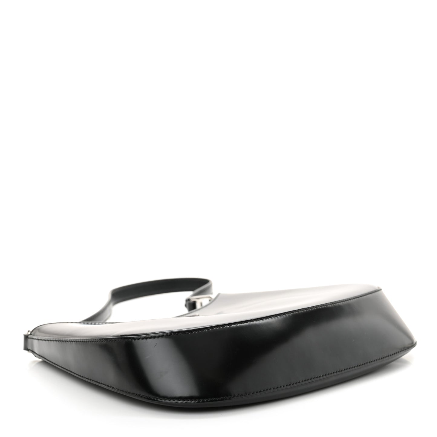 This is an authentic PRADA Spazzolato Cleo Shoulder Bag in Black. This bag is crafted of shiny black calfskin leather. It features a matching strap handle, silver hardware, and a Prada triangle logo on the front. The magnetic closure opens to a black fabric interior with a patch pocket.Follow this item for alerts. Prada is a registered trademark of Prada. FASHIONPHILE is not affiliated with Prada.