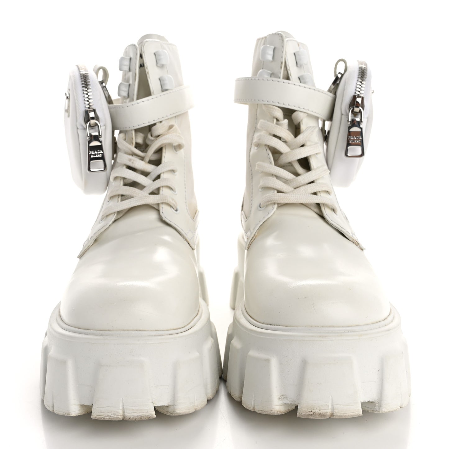 This is an authentic pair of PRADA Spazzolato Rois Re-Nylon Metal Triangle Logo Monolith Pouch Pocket 55mm Boots size 36 in White. These chic platforms are crafted of calfskin leather in white. They feature white stacked rubber platform soles, crossover straps, and removable pouches.Follow this item for alerts. Prada is a registered trademark of Prada. FASHIONPHILE is not affiliated with Prada.