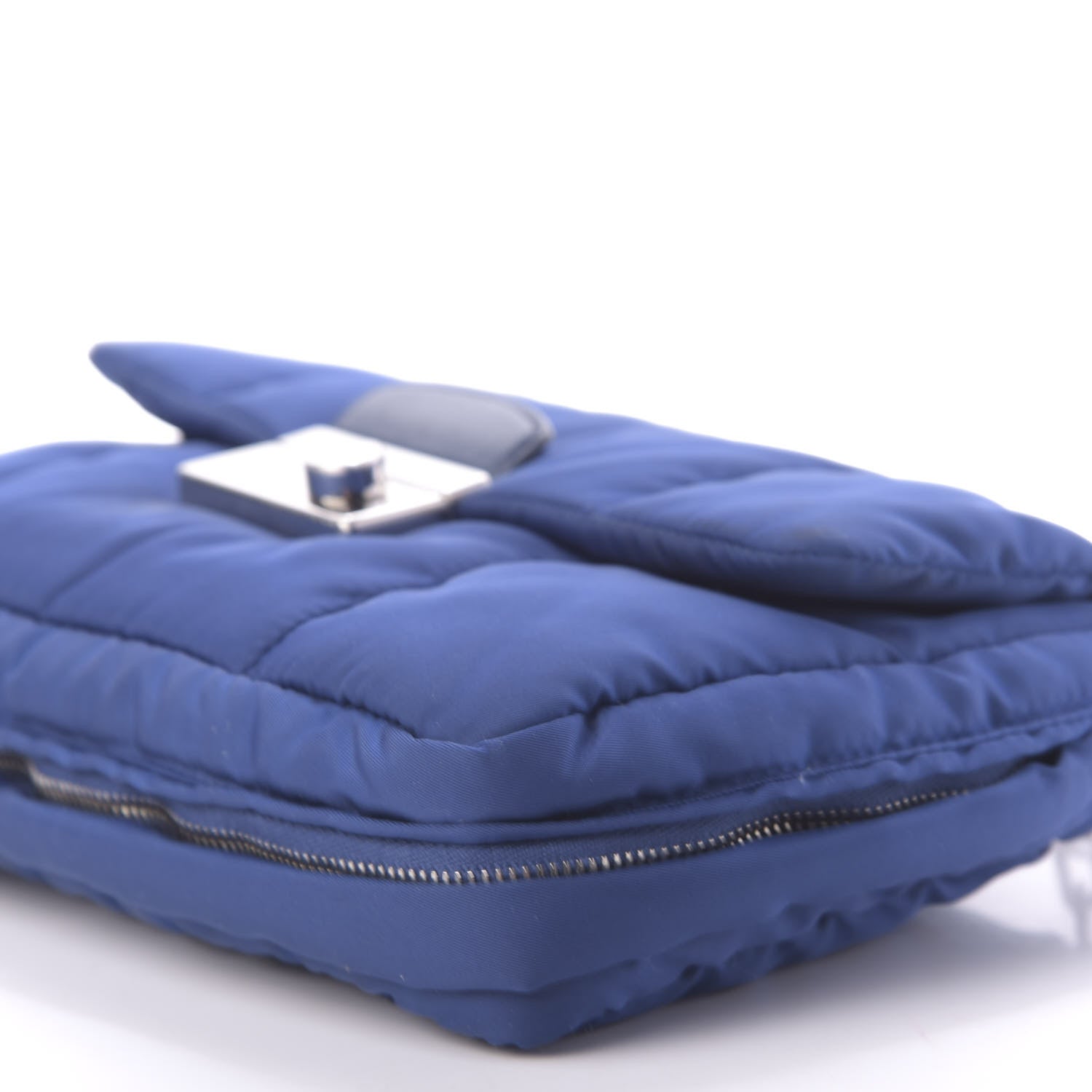 This is an authentic PRADA Tessuto Nylon Bomber Flap Chain Shoulder Bag in Bluette. This chic tote is crafted of quilted nylon in blue. The bag features a shoulder strap with silver links and shoulder pads and a zipper at the base that opens to expand the width of the bag. The flap opens to a blue interior with zipper and patch pockets.Follow this item for alerts. Prada is a registered trademark of Prada. FASHIONPHILE is not affiliated with Prada.