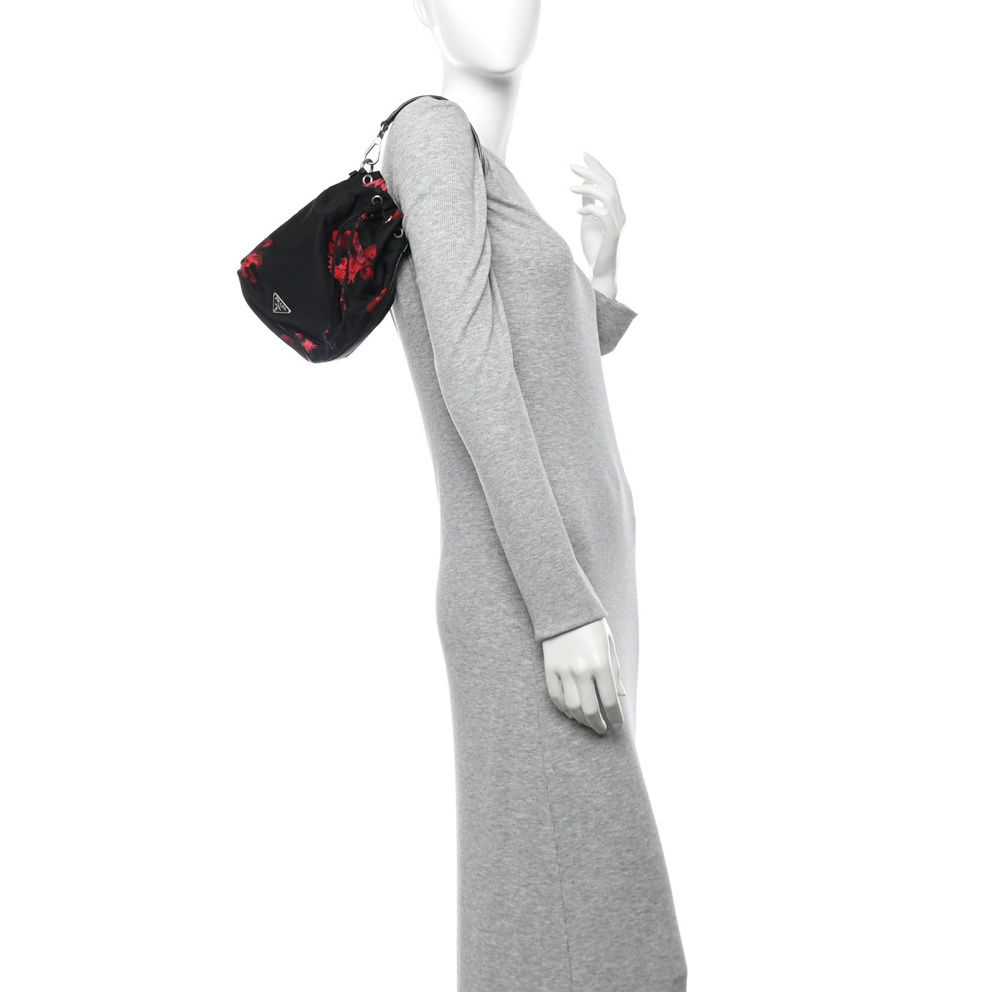 This is an authentic PRADA Tessuto Nylon Spazzolato Rose Print Bucket Bag in Black Rosso. This chic bag is crafted of nylon in black with a red rose print. The bag features a top cinch cord and an optional black leather wristlet strap with polished silver hardware.Follow this item for alerts. Prada is a registered trademark of Prada. FASHIONPHILE is not affiliated with Prada.