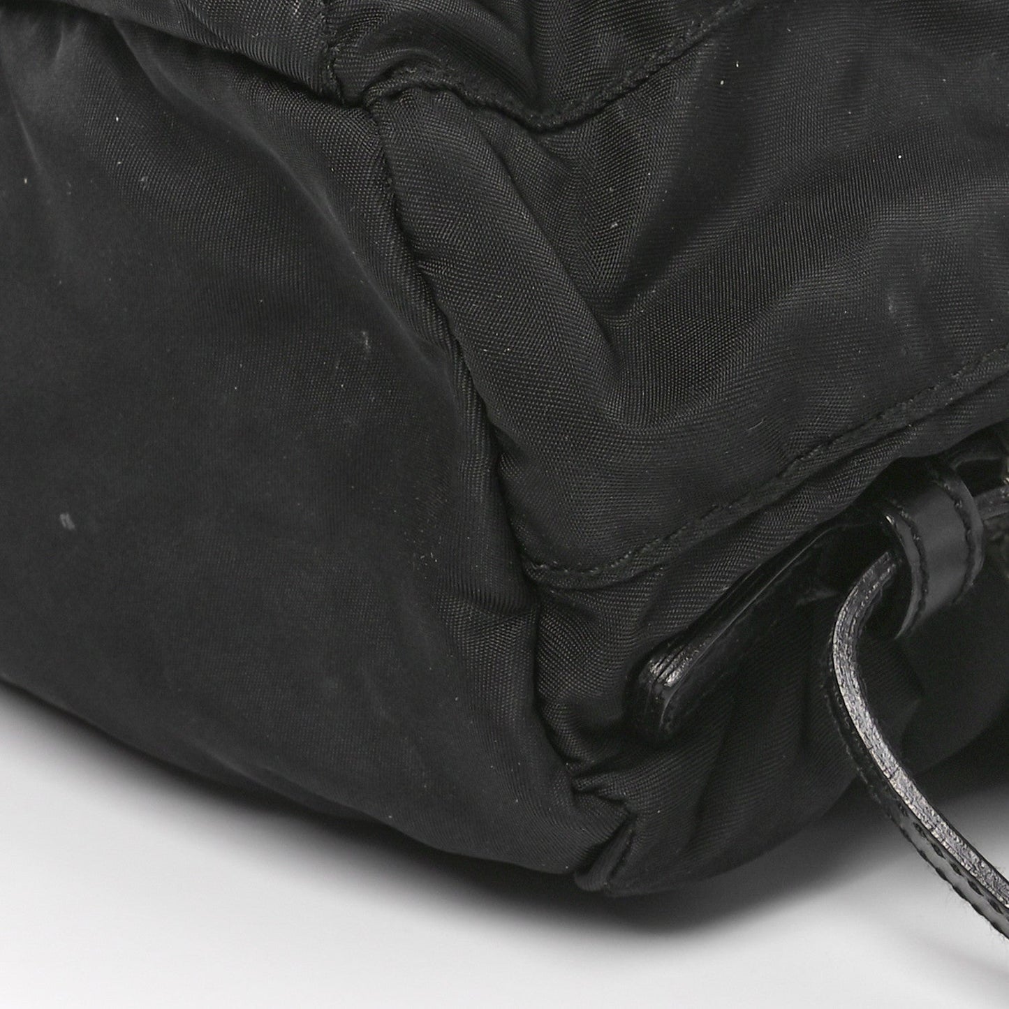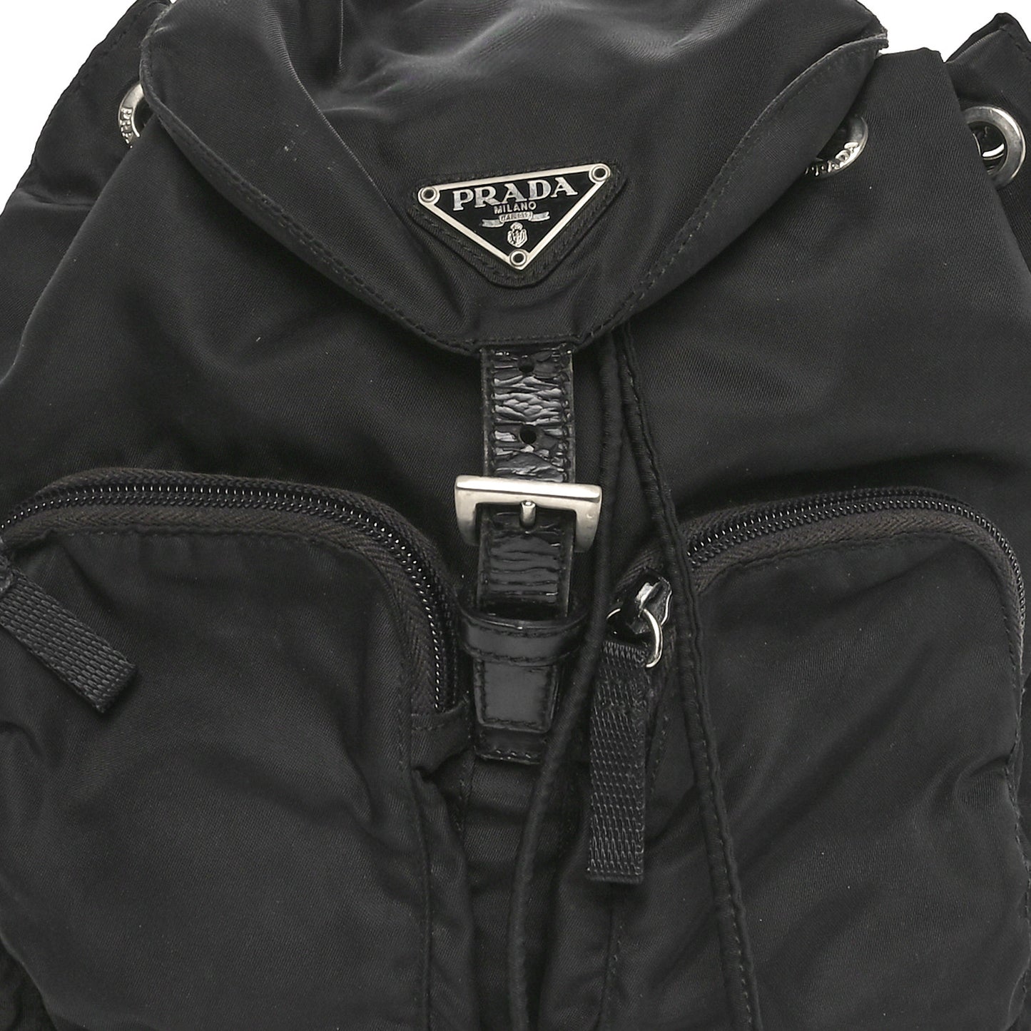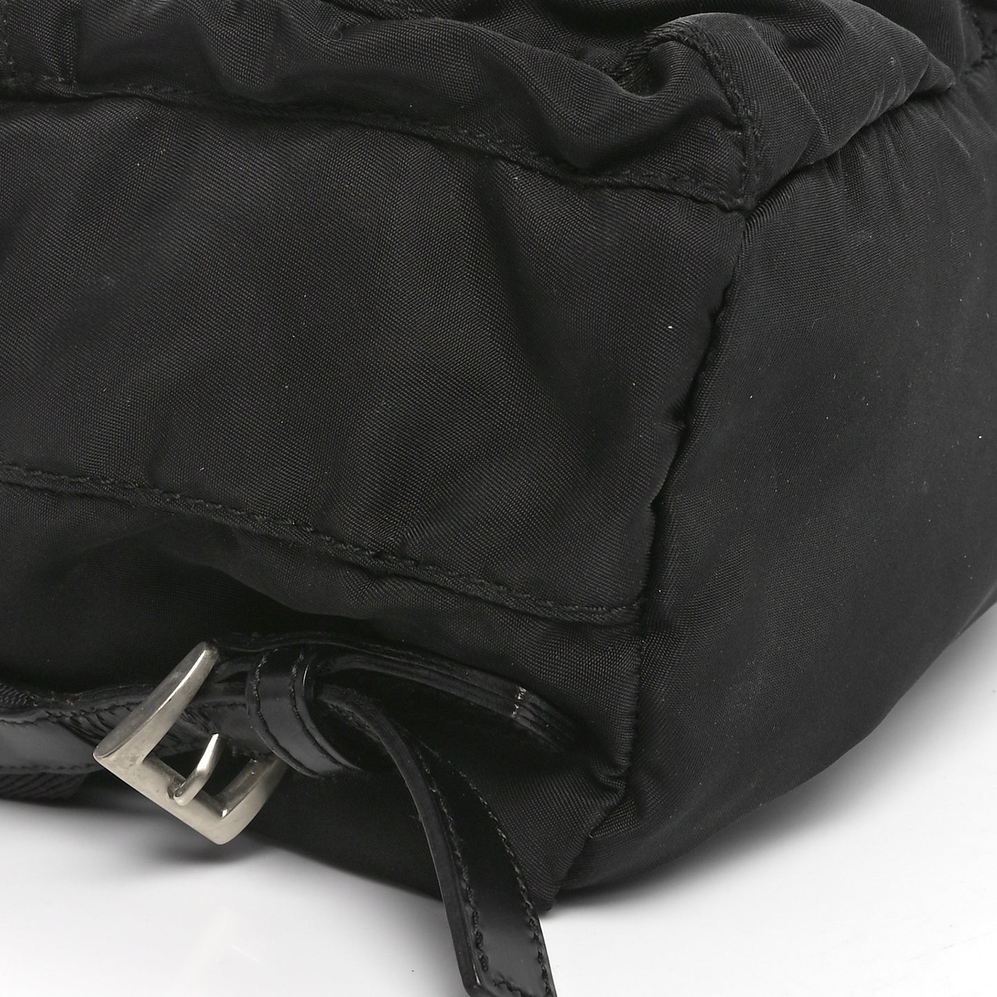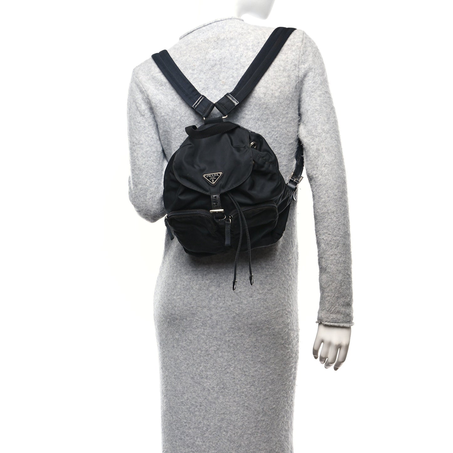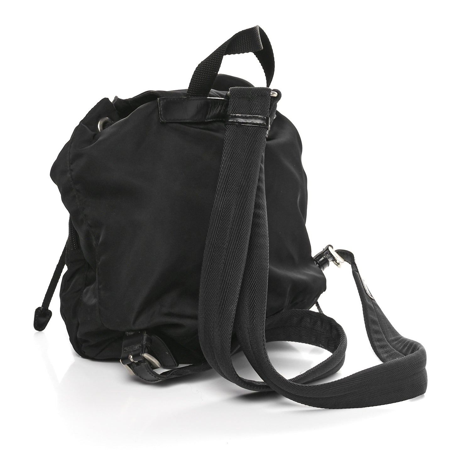 This is an authentic PRADA Tessuto Nylon Vela Small Backpack in Black. This backpack is crafted of black nylon with black leather accents. It features two front zippered pockets, a fabric top grip, and adjustable fabric shoulder straps. The crossover flap opens with a buckle and magnetic snap to a top drawstring and a black logo fabric interior with a zipper pocket.Follow this item for alerts. Prada is a registered trademark of Prada. FASHIONPHILE is not affiliated with Prada.
