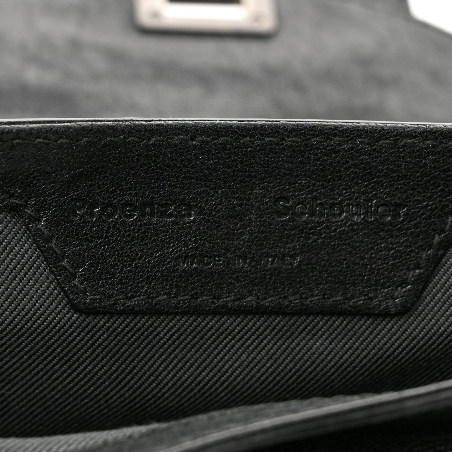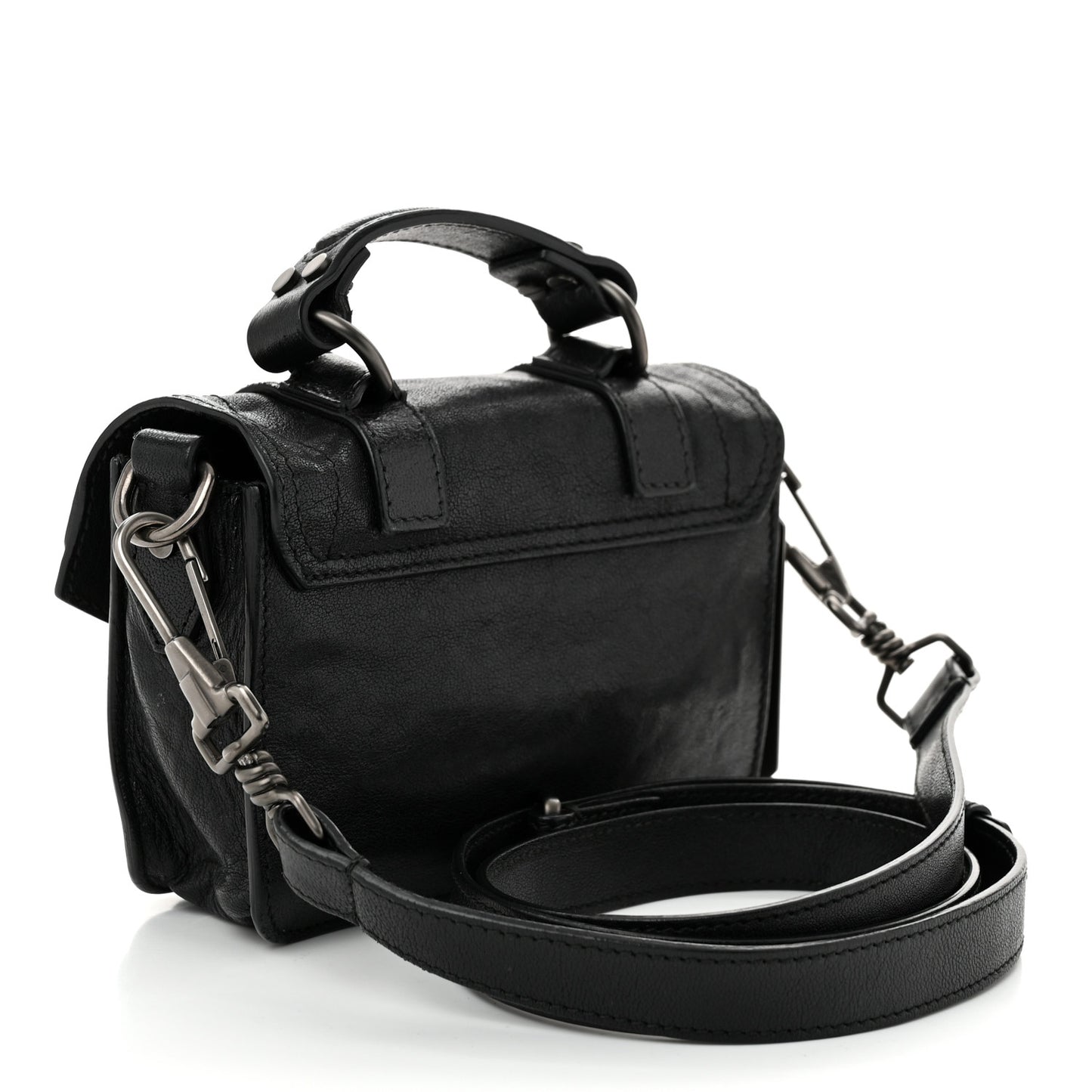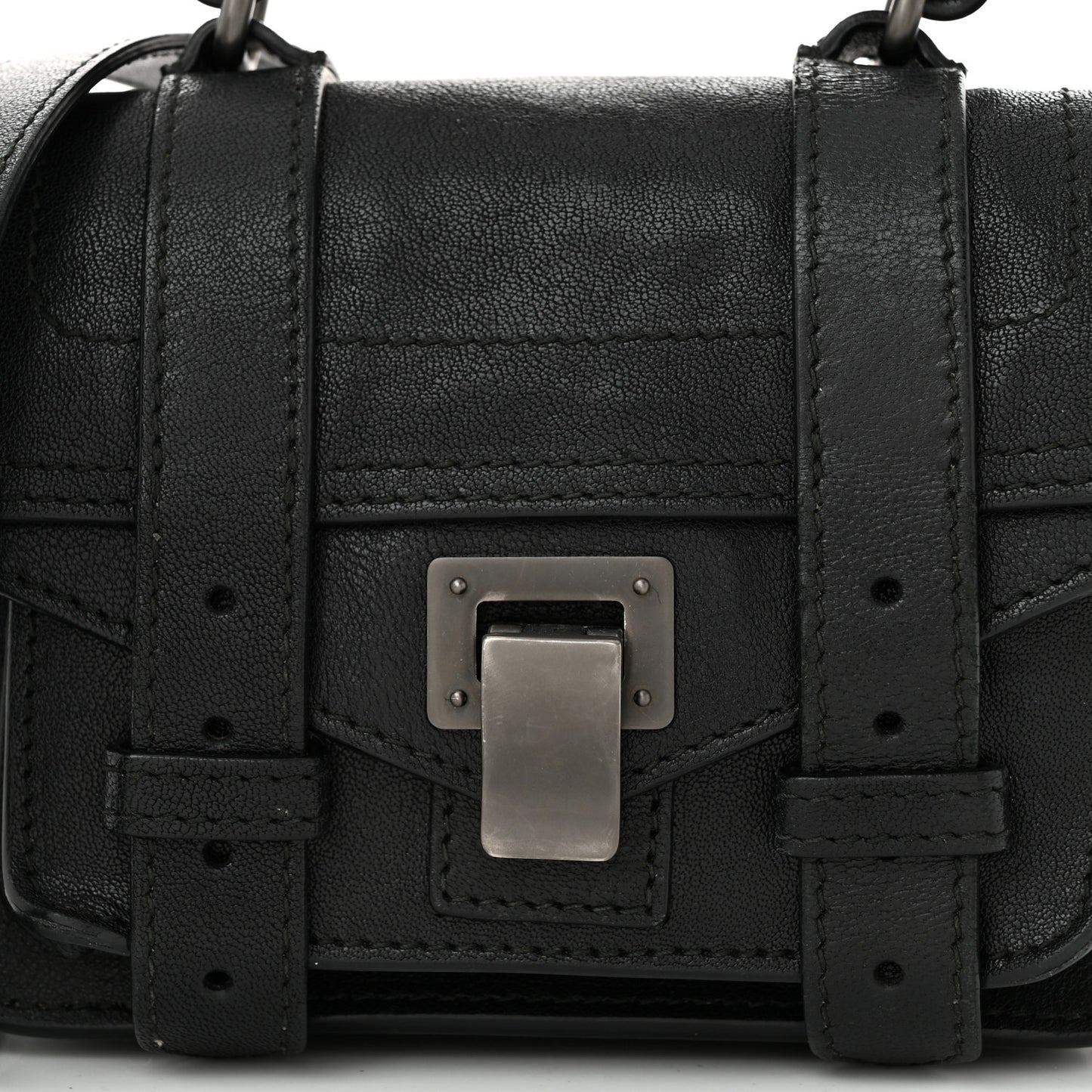 This is an authentic PROENZA SCHOULER Lambskin Micro PS1 Satchel in Black. This stylish mini satchel is crafted of lambskin leather in black. The shoulder bag features a top handle, a detachable adjustable shoulder strap, silver hardware, an exterior pocket and a flap with belts and a matte black tab closure. The flap opens to reveal a front pocket and a light gray fabric interior.Follow this item for alerts. Proenza Schouler is a registered trademark of Proenza Schouler. FASHIONPHILE is not affiliated with Proenza Schouler.