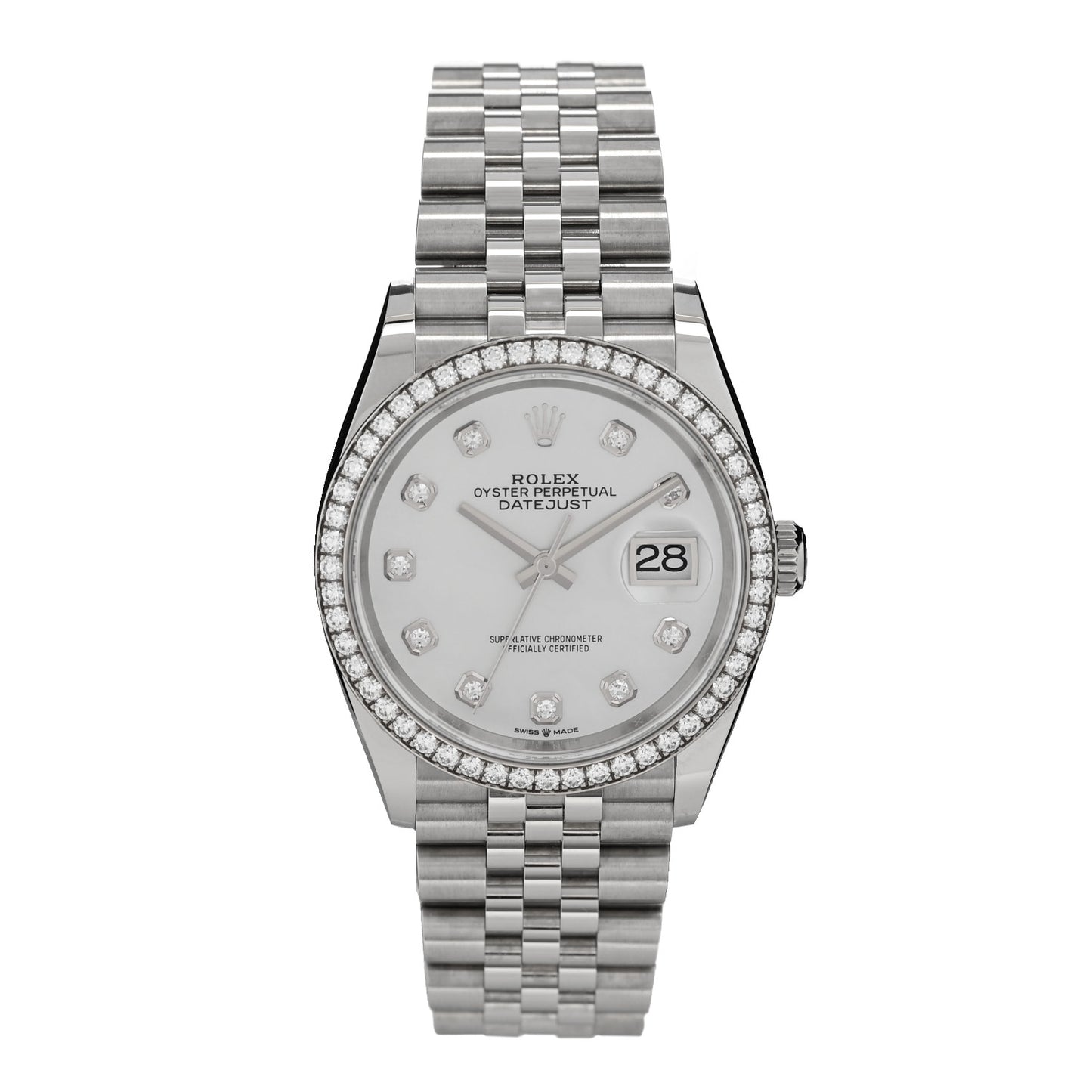 Stainless Steel 18K White Gold Diamond Bezel Mother of Pearl 36mm Oyster Perpetual Datejust Watch 126284RBR