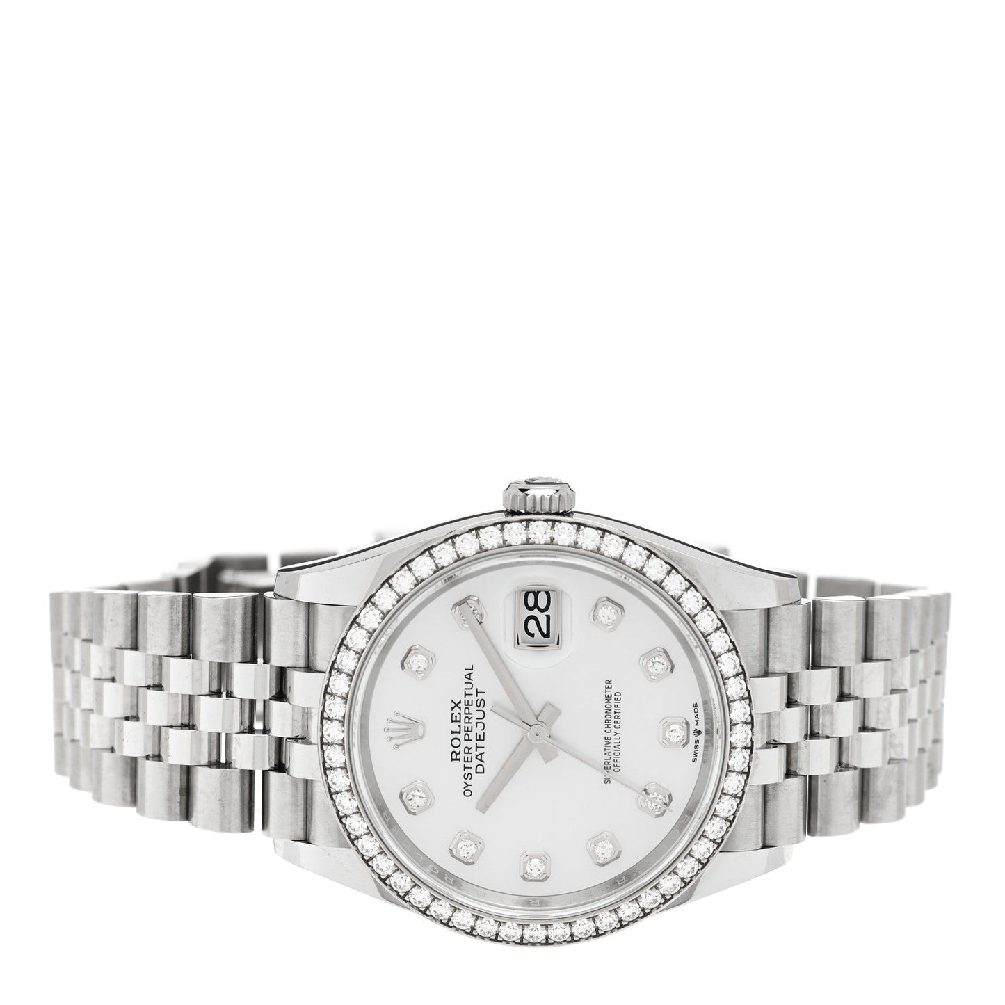 This is an authentic ROLEX Stainless Steel 18K White Gold Diamond Bezel Mother of Pearl 36mm Oyster Perpetual Datejust Watch 126284RBR. The watch is crafted of stainless steel and 18 karat white gold, and features a mother of pearl dial, diamond bezel, sapphire crystal, and an automatic movement.Follow this item for alerts. Rolex is a registered trademark of Rolex. FASHIONPHILE is not affiliated with Rolex.