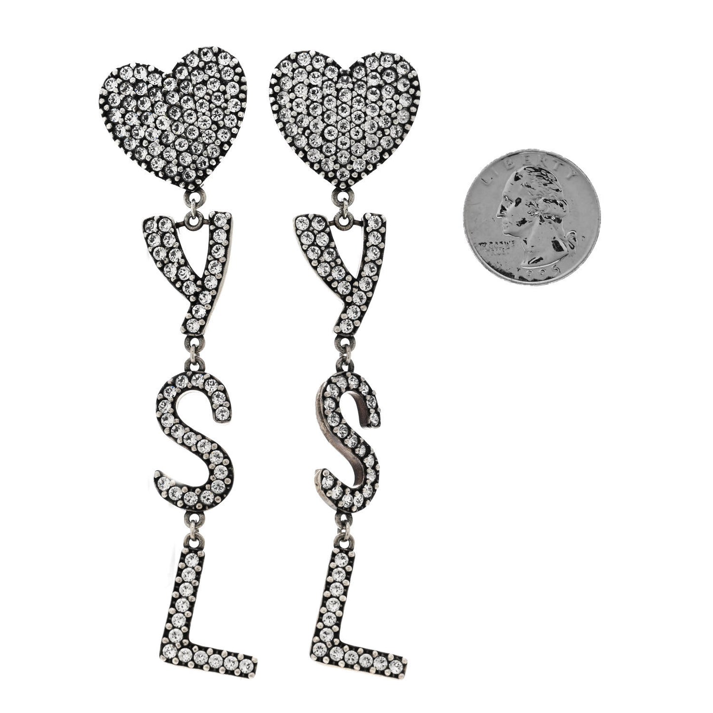 This is an authentic pair of SAINT LAURENT Brass Crystal Monogram Heart Drop Clip Earrings in Silver. These crystal encrusted earrings are crafted of antique silver-toned metal with YSL's suspended from the hearts and clip on earring backs.Follow this item for alerts. Saint Laurent is a registered trademark of Saint Laurent. FASHIONPHILE is not affiliated with Saint Laurent.