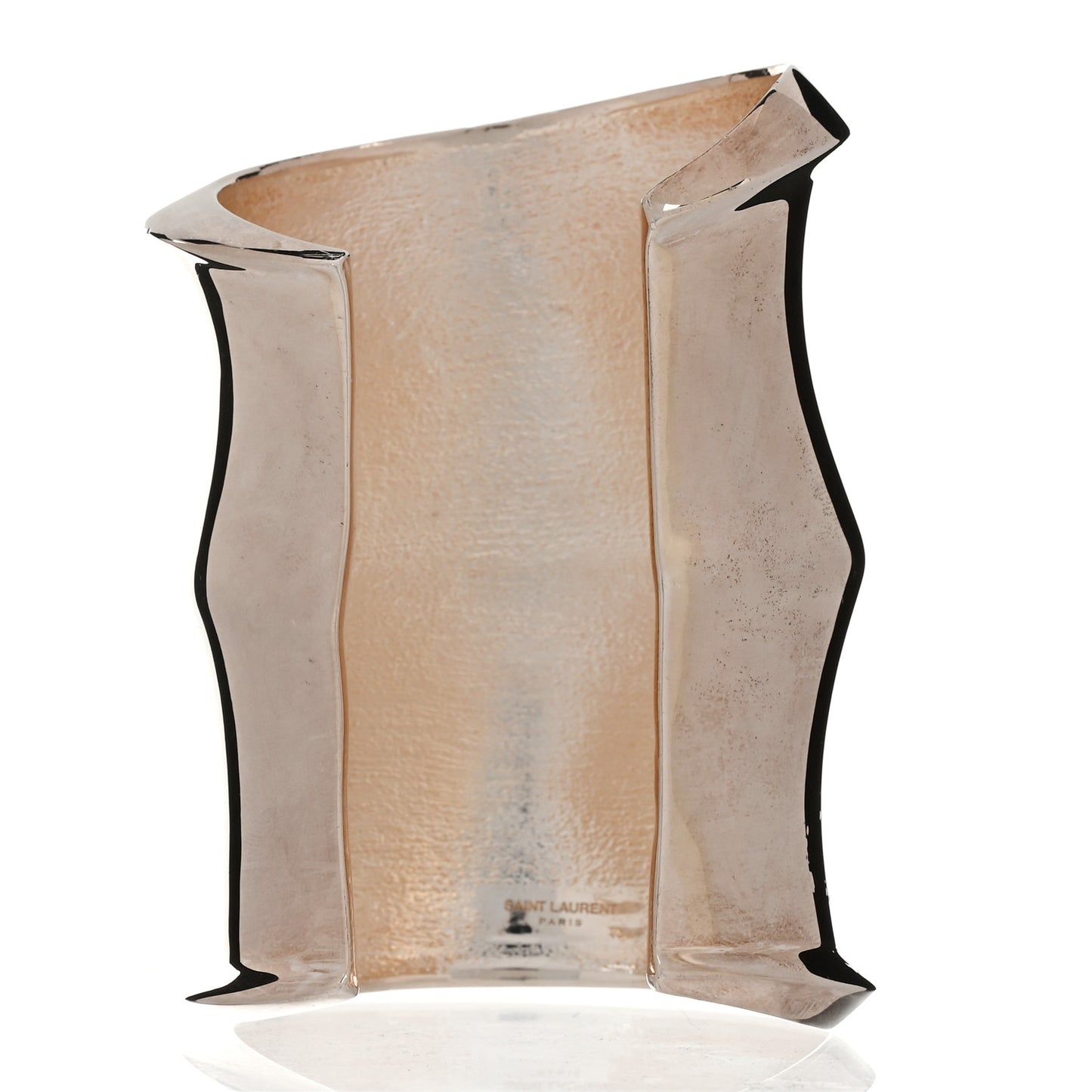 This is an authentic Saint Laurent Brass Organic Oversized Cuff Bracelet L in Argent Brilliant. This bold bracelet is crafted of plated metal in aged silver and cuffs around your wrists.Follow this item for alerts. Saint Laurent is a registered trademark of Saint Laurent. FASHIONPHILE is not affiliated with Saint Laurent.
