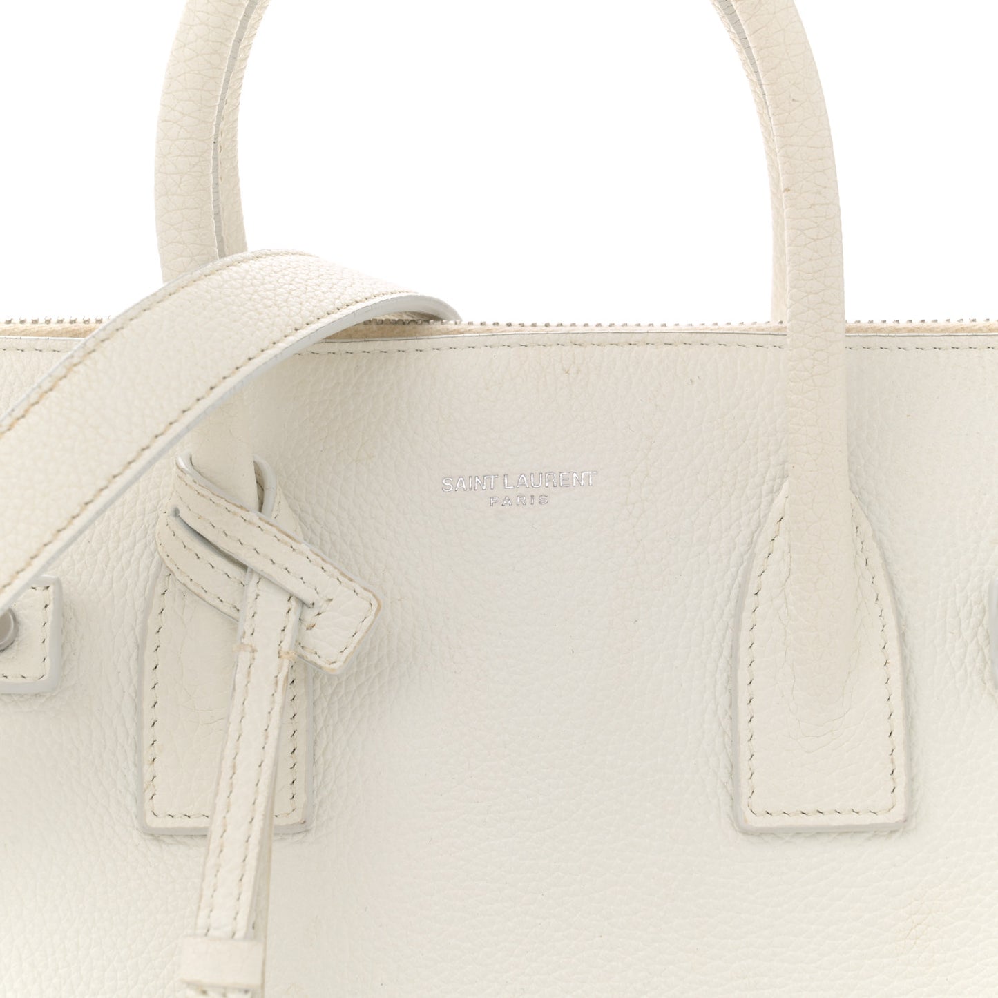 This is an authentic SAINT LAURENT Grained Calfskin Baby Sac De Jour in White. This small tote is crafted of textured calfskin leather in white. The bag features rolled leather top handles, an optional shoulder strap, and side short straps that can be undone to increase the width of the bag. The top zipper opens to a black fabric interior with zipper and patch pockets.Follow this item for alerts. Saint Laurent is a registered trademark of Saint Laurent. FASHIONPHILE is not affiliated with Saint Laurent.