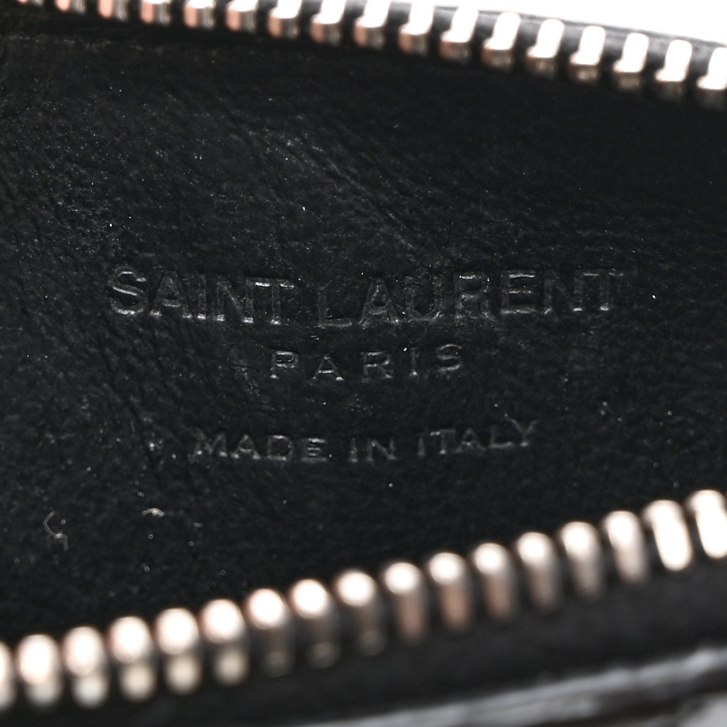 This is an authentic SAINT LAURENT Calfskin Crocodile Embossed 5 Fragments Zip Pouch Card Holder in Black. This petite wallet is crafted of crocodile embossed calfskin leather in black and features multiple credit card slots on the front of the main zipper compartment.Follow this item for alerts. Saint Laurent is a registered trademark of Saint Laurent. FASHIONPHILE is not affiliated with Saint Laurent.