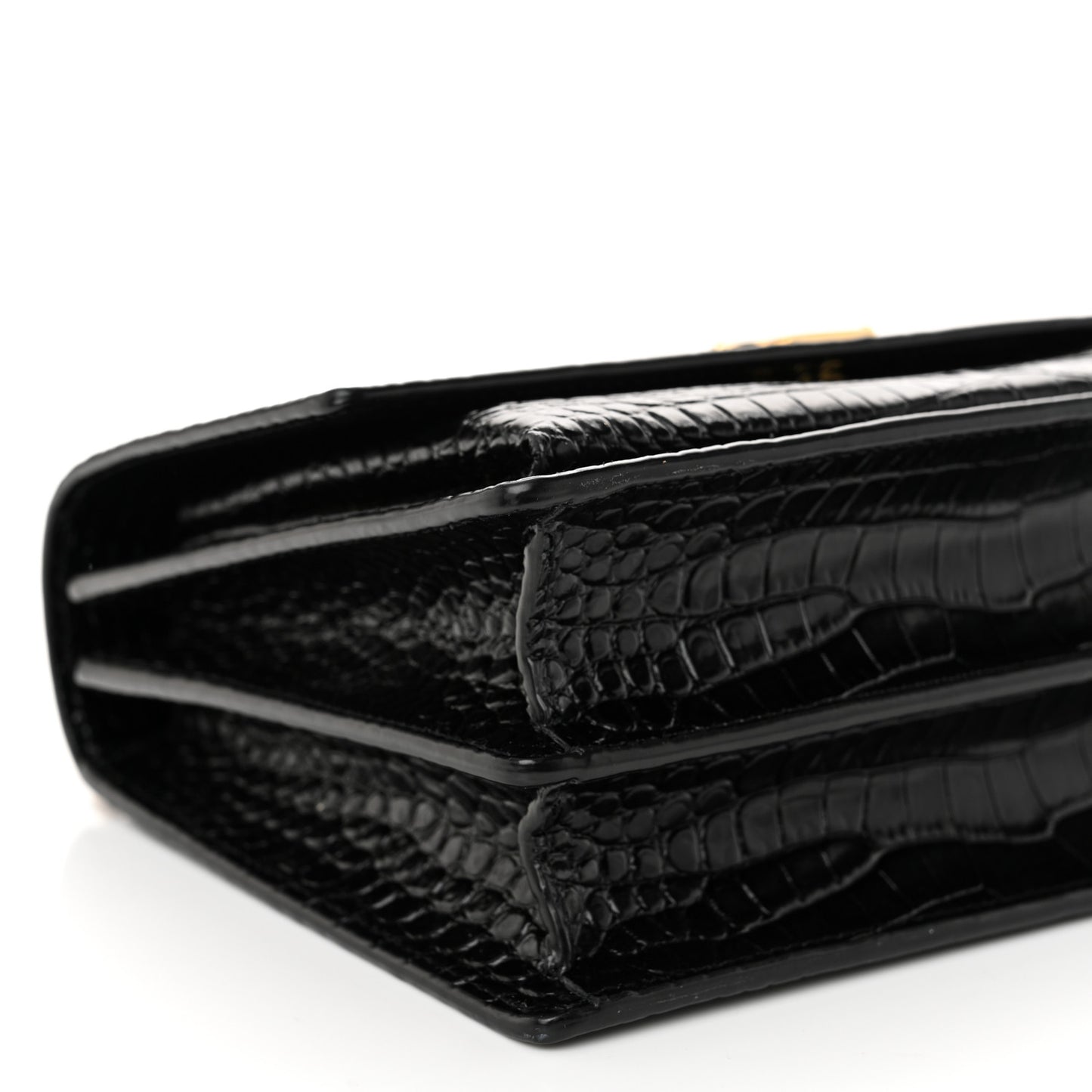 This is an authentic SAINT LAURENT Calfskin Crocodile Embossed Medium Monogram Sunset in Black. This shoulder bag is crafted of crocodile-embossed calfskin leather in black. The bag features a rear patch pocket, gold chainlink shoulder strap with a leather shoulder pad, and a gold-toned YSL emblem on the front. The crossover flap opens with a magnetic snap to a front pocket and a partitioned black suede interior with a patch pocket.Follow this item for alerts. Saint Laurent is a registered trademark of Saint Laurent. FASHIONPHILE is not affiliated with Saint Laurent.