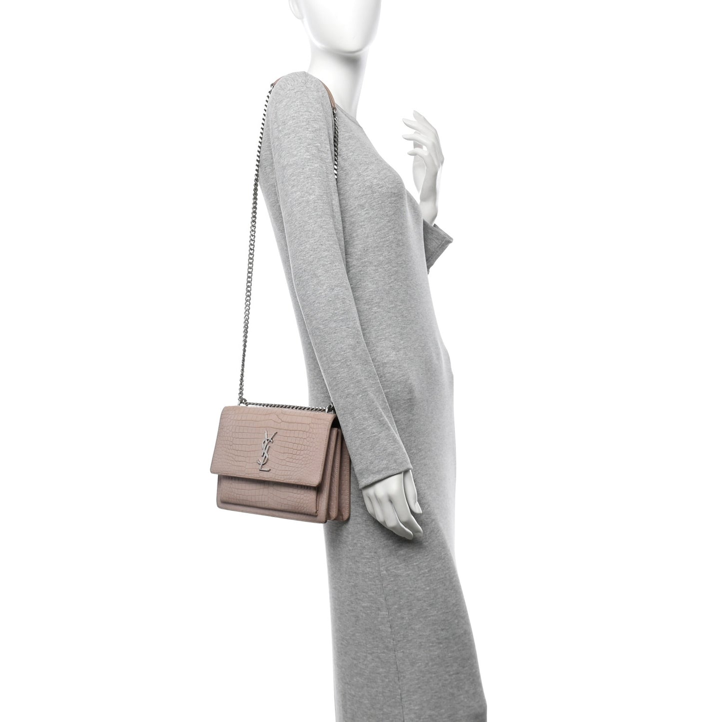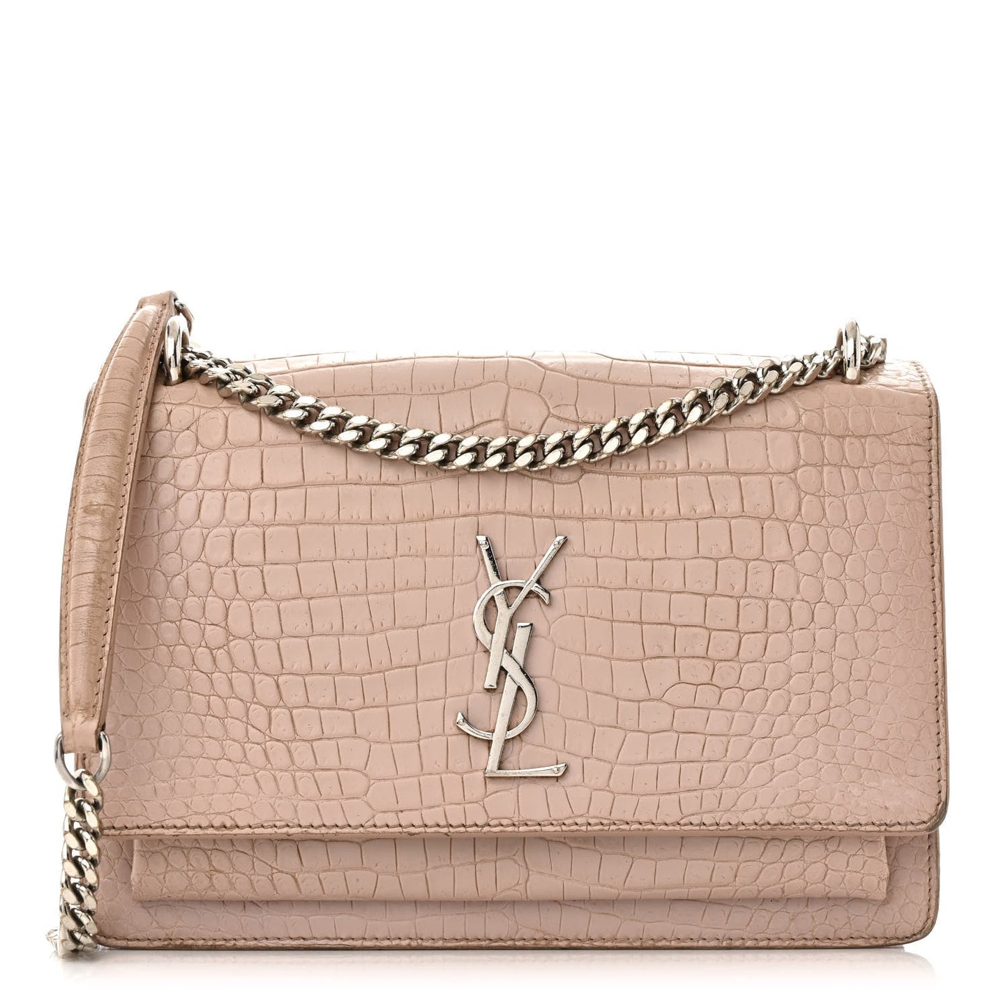 This is an authentic SAINT LAURENT Calfskin Crocodile Embossed Medium Monogram Sunset in Rose Antic. This stylish shoulder bag is crafted of crocodile-embossed calfskin leather in light pink. The bag features an exterior slip pocket, polished silver chainlink shoulder strap with a leather shoulder pad, and a front flap with a signature silver YSL logo. The bag opens to a partitioned suede interior.Follow this item for alerts. Saint Laurent is a registered trademark of Saint Laurent. FASHIONPHILE is not affiliated with Saint Laurent.