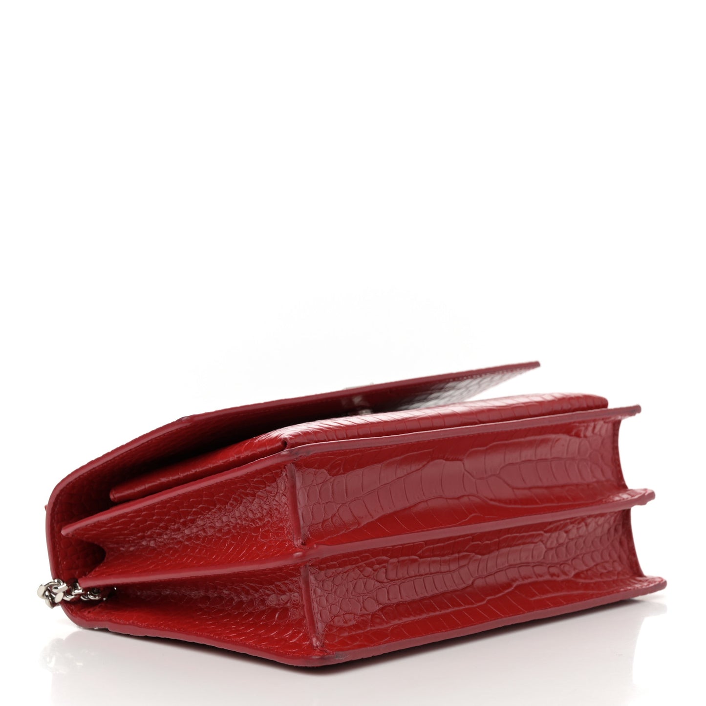 This is an authentic SAINT LAURENT Calfskin Crocodile Embossed Medium Monogram Sunset in Rouge Eros. This shoulder bag is crafted of crocodile embossed calfskin in red. It features a silver chainlink shoulder strap with a leather shoulder pad, a rear slip pocket and a crossover flap with a prominent silver YSL emblem. This opens with a magnetic snap to a front pocket and a partitioned red suede interior with a patch pocket.Follow this item for alerts. Saint Laurent is a registered trademark of Saint Laurent. FASHIONPHILE is not affiliated with Saint Laurent.