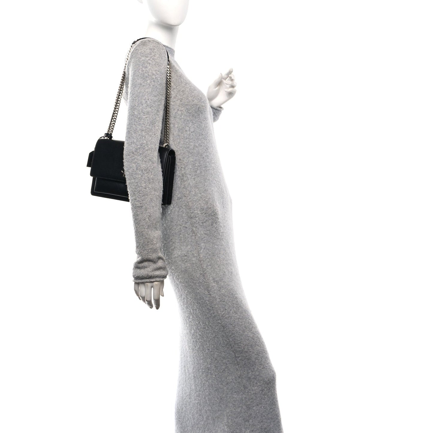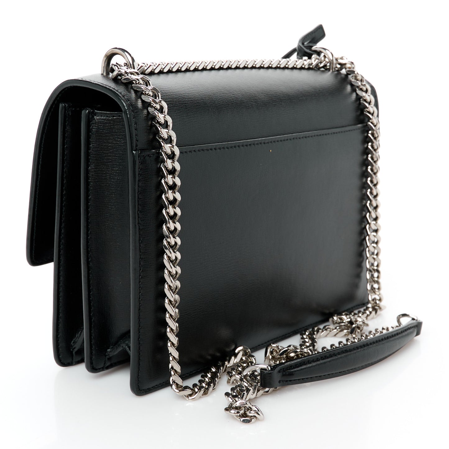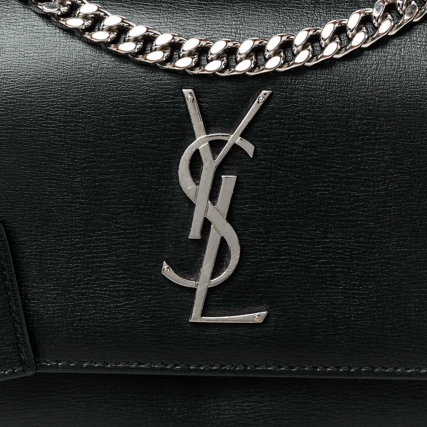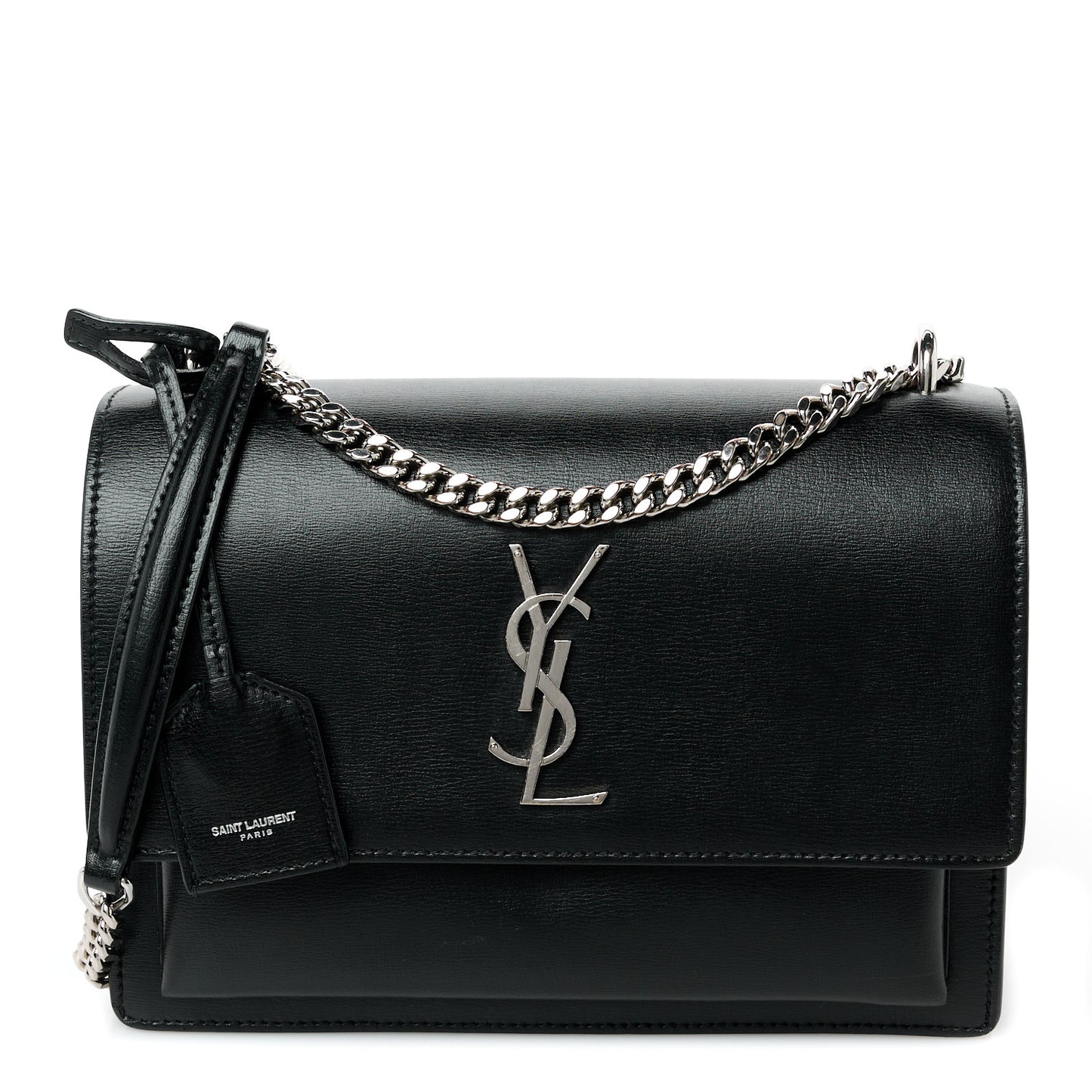 This is an authentic SAINT LAURENT Calfskin Medium Monogram Sunset in Black. This bag features a silver chain link strap with a leather shoulder pad, a front-facing flap with a signature YSL logo, gusseted sides, and an exterior pocket. This bag opens with a magnetic snap to a partitioned black suede interior with a patch pocket.Follow this item for alerts. Saint Laurent is a registered trademark of Saint Laurent. FASHIONPHILE is not affiliated with Saint Laurent.