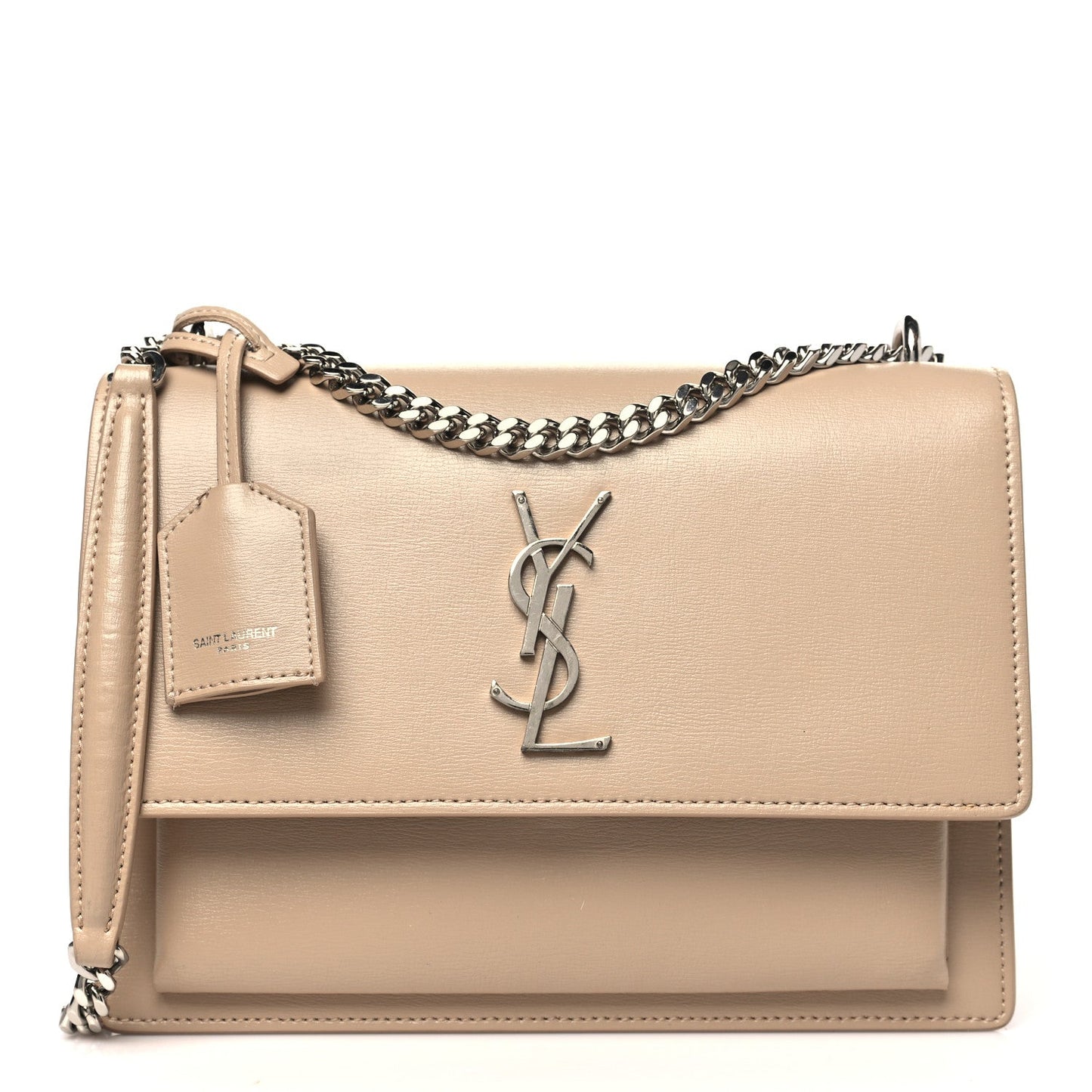 This is an authentic SAINT LAURENT Calfskin Medium Monogram Sunset in Dark Beige. This stunning shoulder bag is crafted of smooth calfskin in Dark Beige. The bag features a matching shoulder strap with an aged silver chain, a front facing flap with a signature silver YSL logo, gusseted sides, and both an interior and exterior pocket. This fold over bag is complete with magnetic snap that opens to a spacious suede and leather interior.Follow this item for alerts. Saint Laurent is a registered trademark of Saint Laurent. FASHIONPHILE is not affiliated with Saint Laurent.