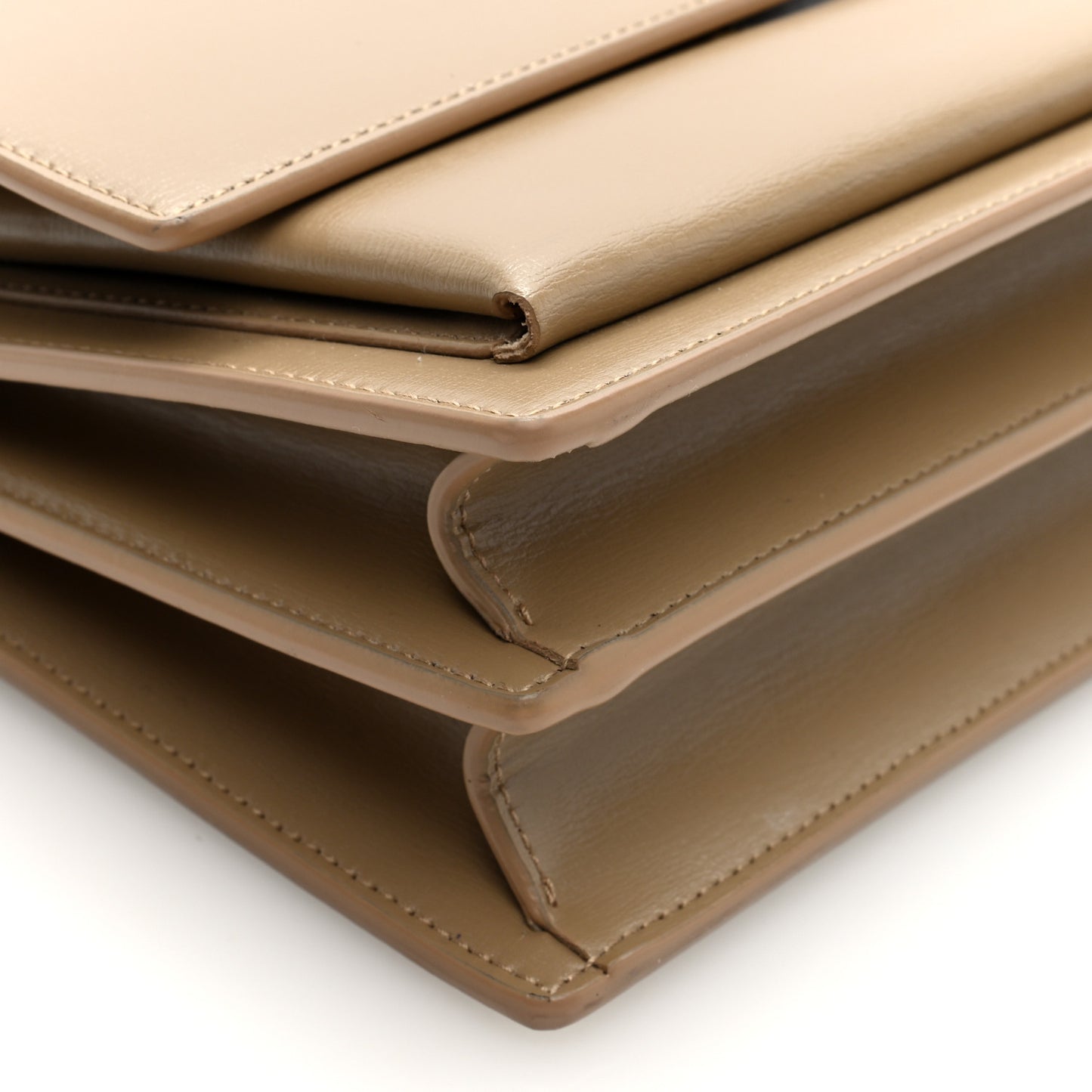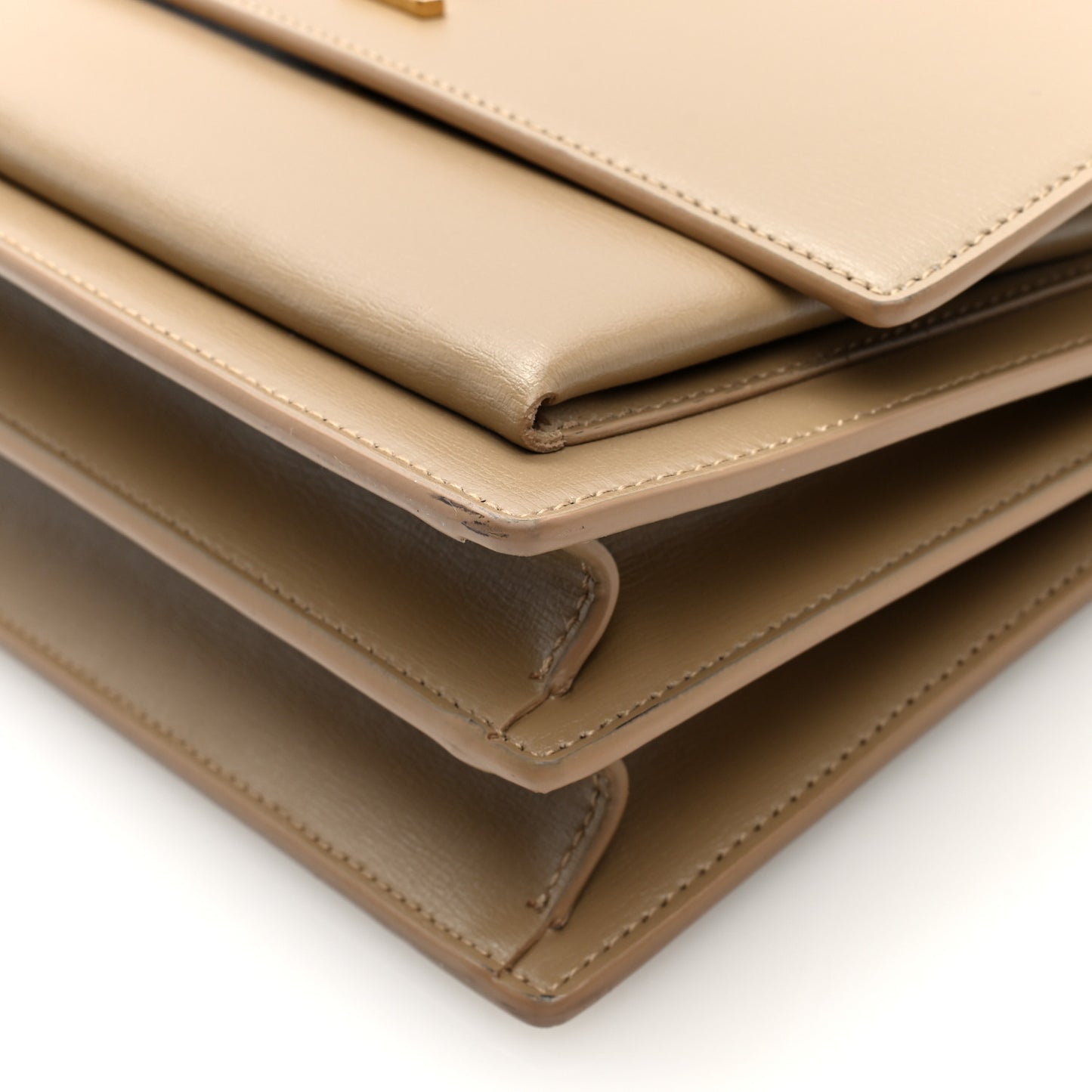 This is an authentic SAINT LAURENT Calfskin Medium Monogram Sunset in Dark Latte. This stunning shoulder bag is crafted of smooth calfskin in dark beige. The bag features a matching shoulder strap with aged gold hardware, a front facing flap with an aged gold YSL logo, gusseted sides, and both an interior and exterior pocket. This fold over bag is complete with magnetic snap that opens to a spacious partitioned suede leather interior with a patch pocket.Follow this item for alerts. Saint Laurent is a registered trademark of Saint Laurent. FASHIONPHILE is not affiliated with Saint Laurent.