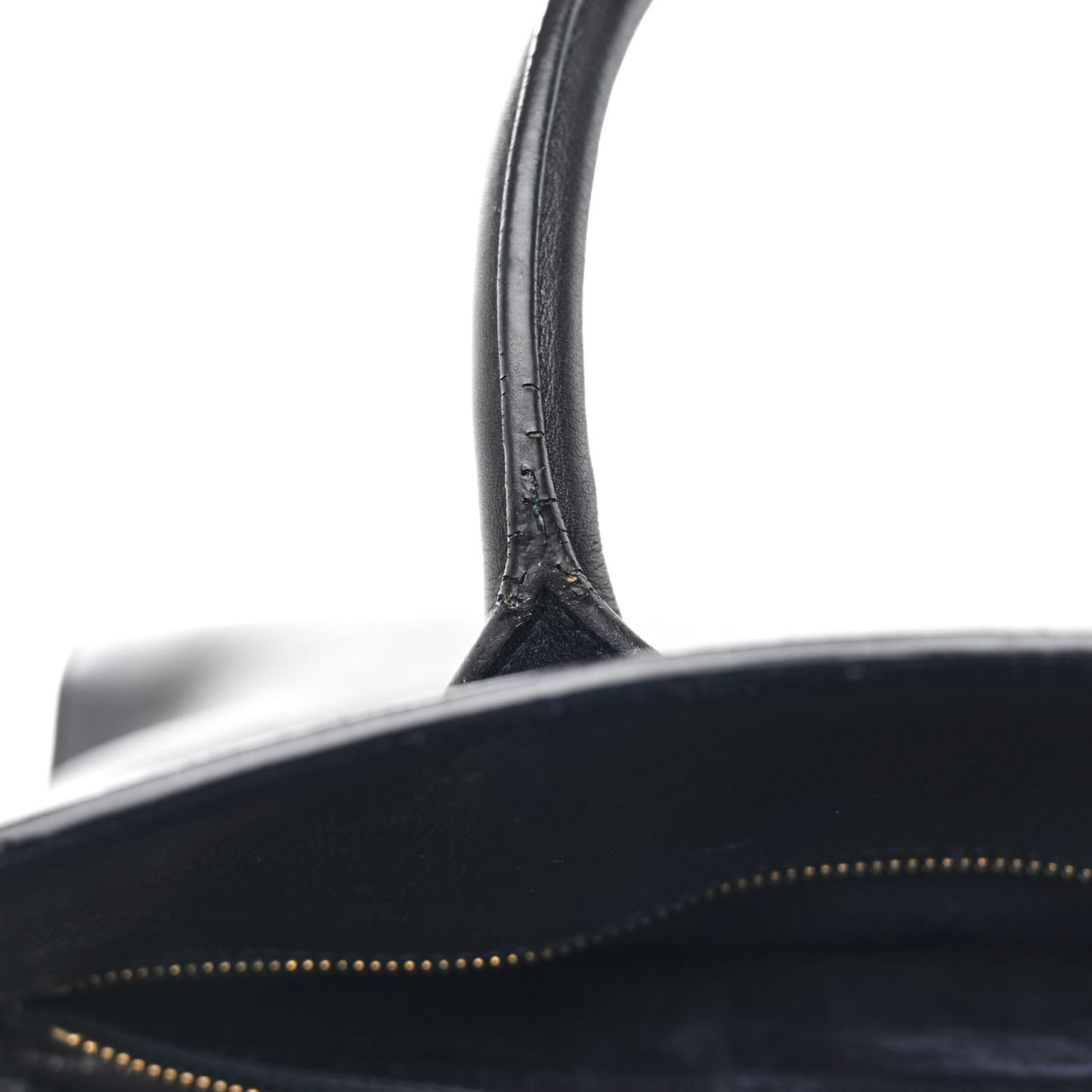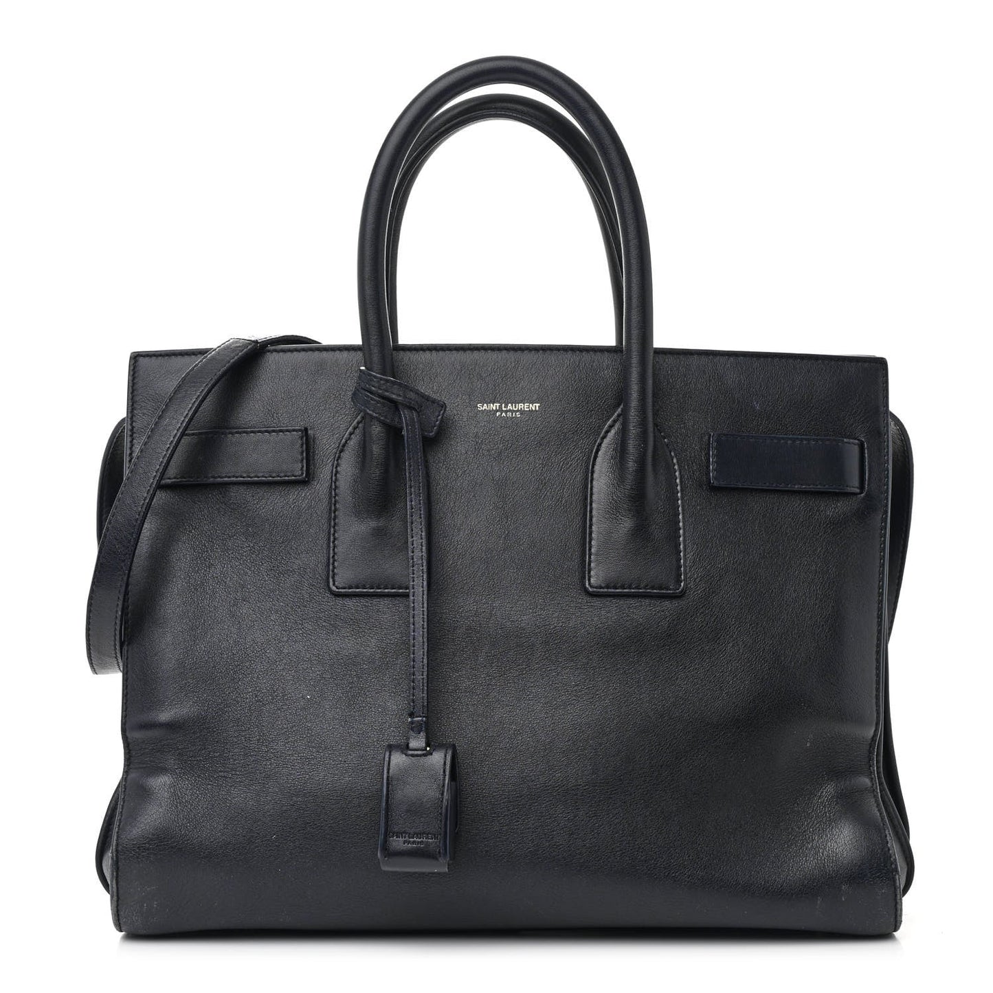 This is an authentic SAINT LAURENT Calfskin Small Sac De Jour in Navy. This tote is crafted of calfskin leather in dark blue. The bag features rolled leather top handles, an optional shoulder strap with gold hardware, and short side straps that can be undone to increase the width of the bag. The top is open to a partitioned blue suede interior with zipper and patch pockets.Follow this item for alerts. Saint Laurent is a registered trademark of Saint Laurent. FASHIONPHILE is not affiliated with Saint Laurent.