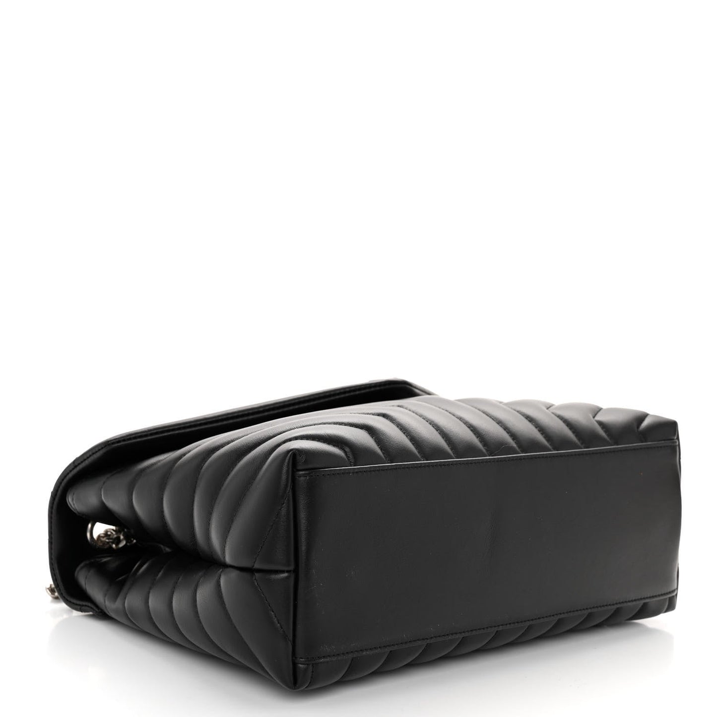 This is an authentic SAINT LAURENT Calfskin Y Quilted Monogram Medium Loulou Chain Satchel in Black. This shoulder bag is crafted of chevron quilted calfskin leather. The bag features an aged silver chain link shoulder strap with shoulder pads, and an aged silver YSL detail on the crossover flap. The bag opens to a partitioned black fabric interior with zipper pockets.Follow this item for alerts. Saint Laurent is a registered trademark of Saint Laurent. FASHIONPHILE is not affiliated with Saint Laurent.