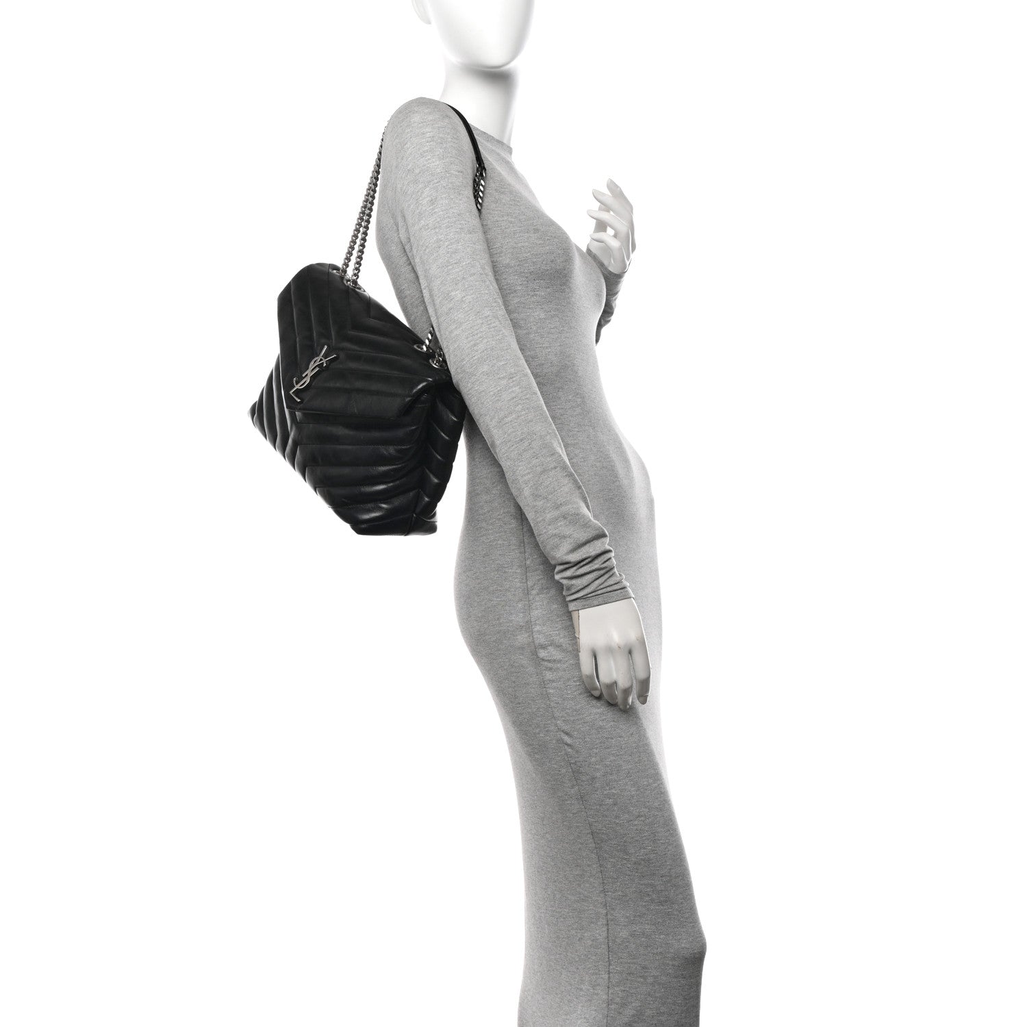 This is an authentic SAINT LAURENT Calfskin Y Quilted Monogram Medium Loulou Chain Satchel in Black. This elegant shoulder tote features chevron quilted calfskin leather in black. The bag has silver chain link shoulder straps with black leather shoulder pads. The envelope-style crossover flap features a prominent silver YSL monogram detail and snaps open to a partitioned black fabric interior with pockets.Follow this item for alerts. Saint Laurent is a registered trademark of Saint Laurent. FASHIONPHILE is not affiliated with Saint Laurent.