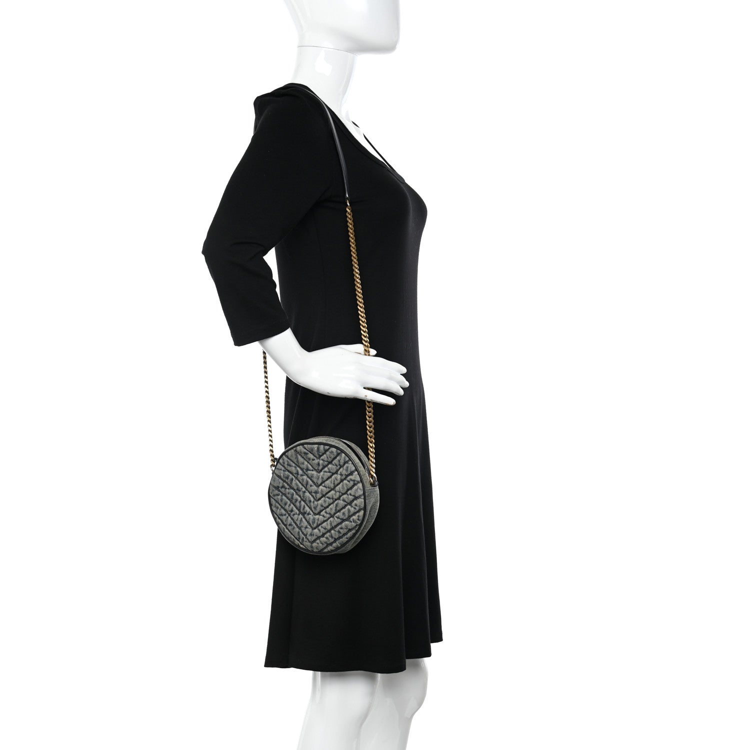 This authentic SAINT LAURENT Denim Quilted Monogram Round Crossbody Bag is crafted with blue denim and black leather trim. It features a prominent aged gold classic YSL logo on the front and a waist-length aged gold chain shoulder strap. The top zipper opens to a black fabric interior with a patch pocket.Follow this item for alerts. Saint Laurent is a registered trademark of Saint Laurent. FASHIONPHILE is not affiliated with Saint Laurent.