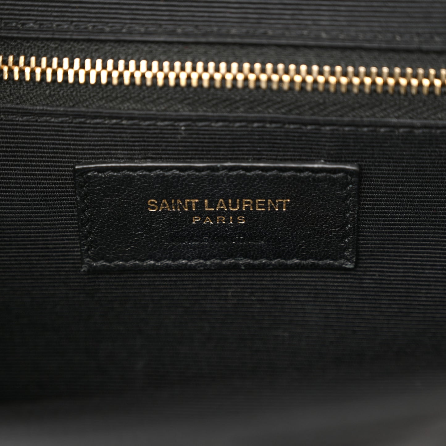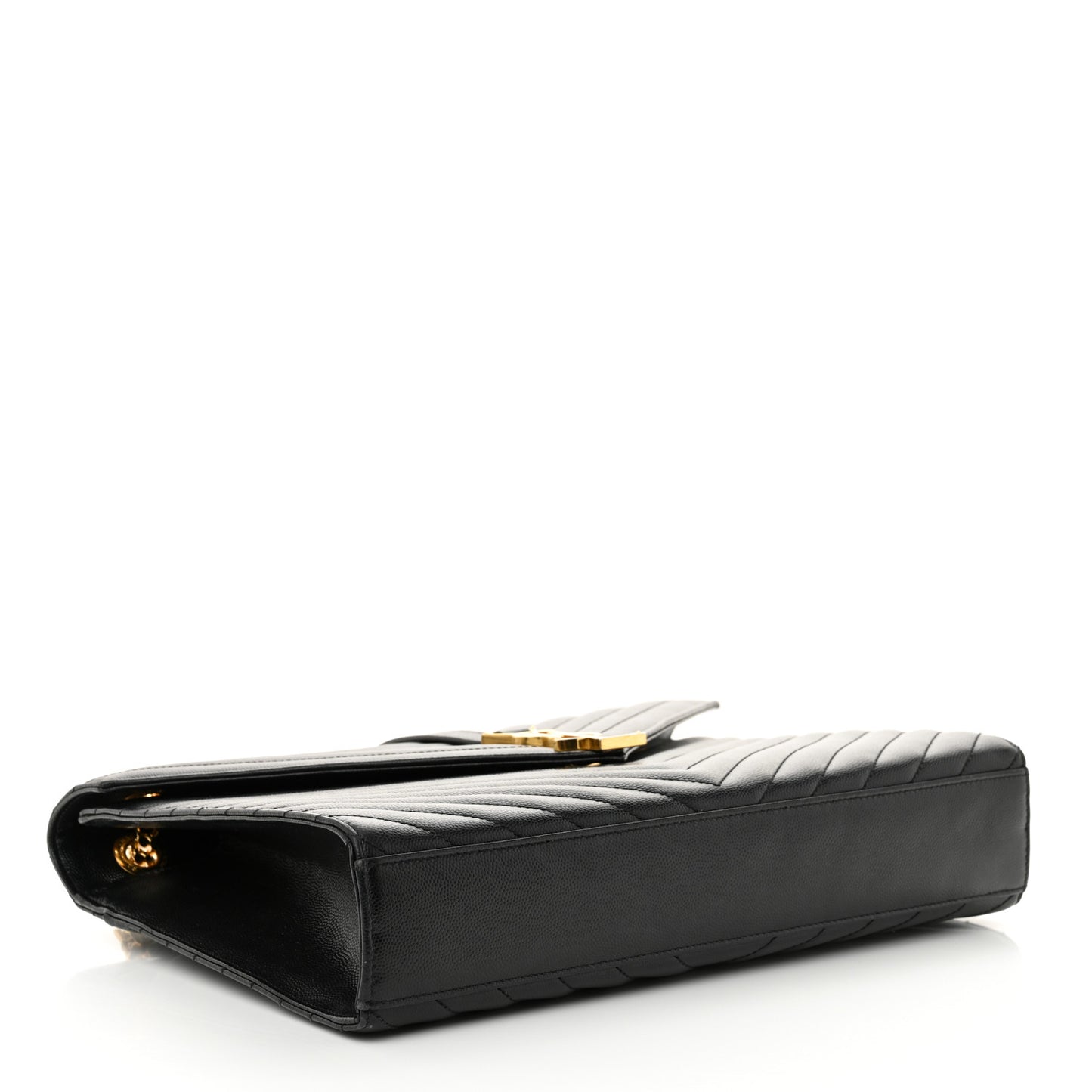 This is an authentic SAINT LAURENT Grain De Poudre Matelasse Chevron Large Monogram Satchel in Black. This elegant shoulder bag is crafted of beautifully pebbled calfskin leather in black. The bag features polished gold hardware, chevron quilting, chain shoulder straps, and a gold YSL emblem on the front flap. The flap opens to a black fabric interior with a zipper pocket.Follow this item for alerts. Saint Laurent is a registered trademark of Saint Laurent. FASHIONPHILE is not affiliated with Saint Laurent.