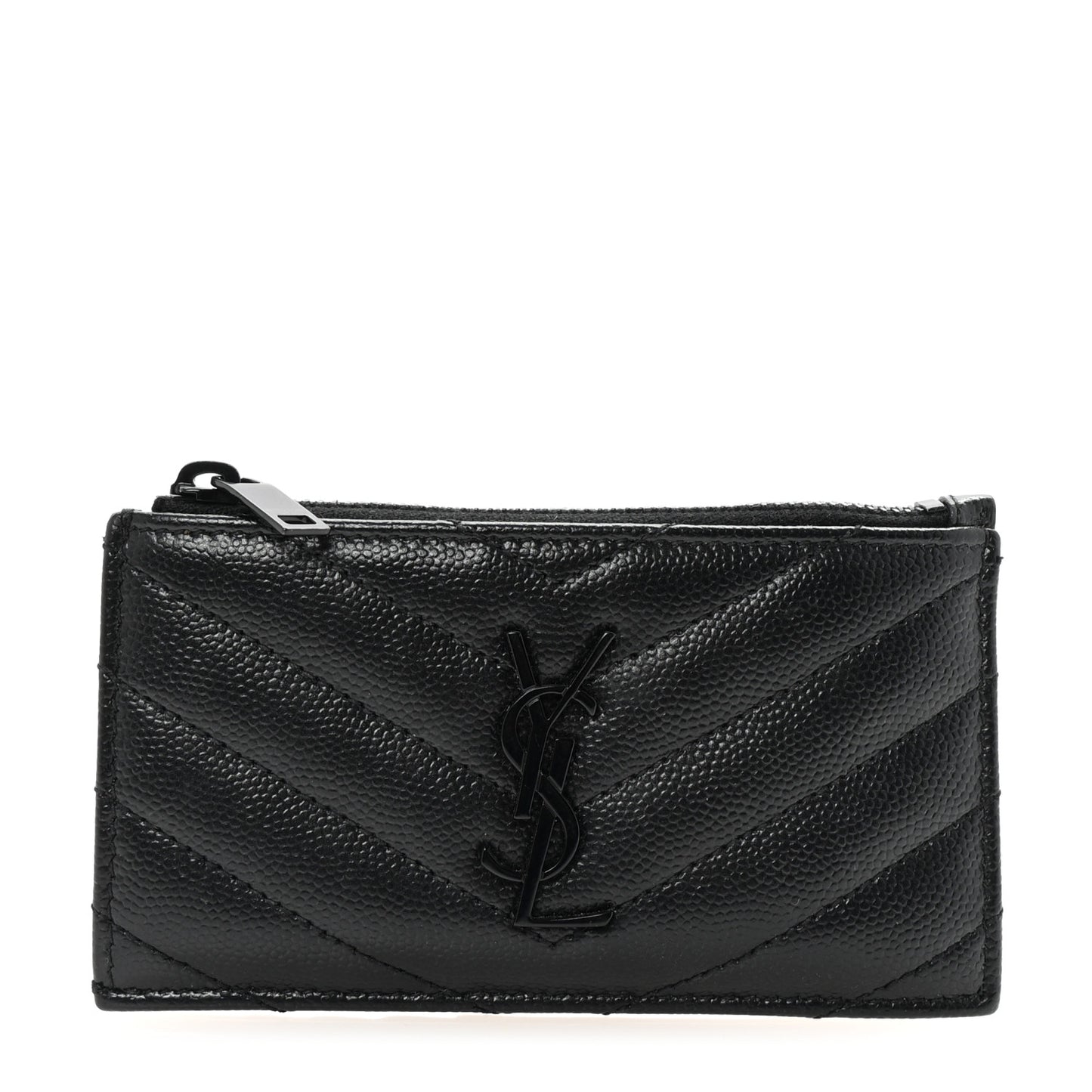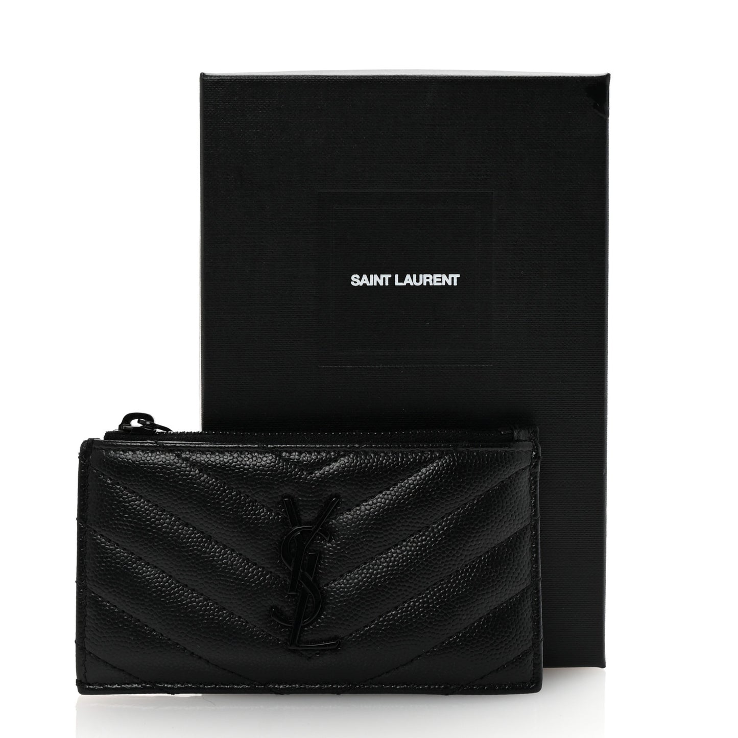 This is an authentic SAINT LAURENT Grain De Poudre Matelasse Chevron Monogram Fragments Zippered Card Case in Black. This elegant wallet features fine pebbled chevron quilting in black. The wallet features a prominent black YSL logo on the front, a panel of five card slots, and a top zipper opening to a black leather interior.Follow this item for alerts. Saint Laurent is a registered trademark of Saint Laurent. FASHIONPHILE is not affiliated with Saint Laurent.