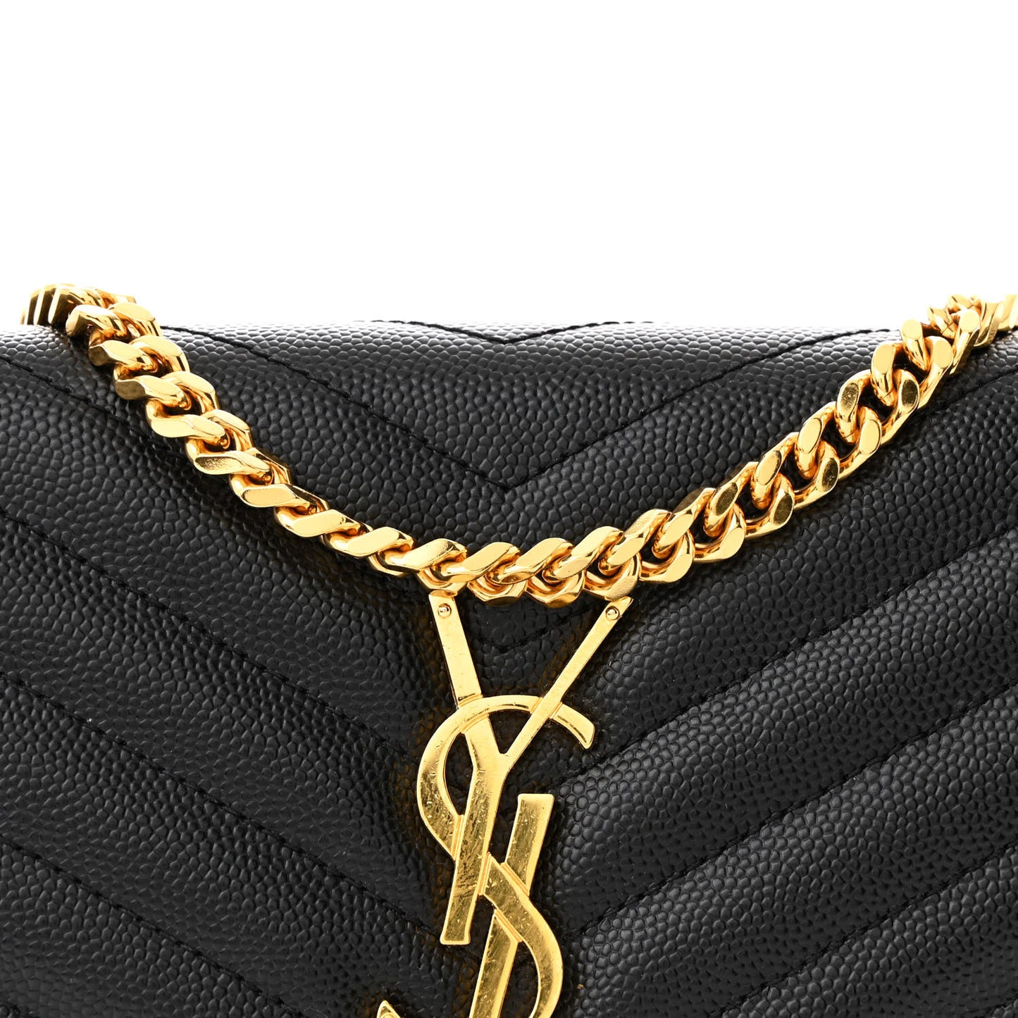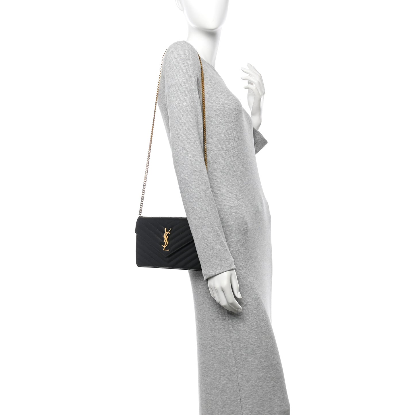 This is an authentic SAINT LAURENT Grain De Poudre Matelasse Chevron Monogram Chain Wallet in Black. This elegant wallet on a chain is crafted of finely pebbled chevron quilted leather in black. The shoulder bag features a removable waist-length gold chain shoulder strap with a shoulder pad and a classic gold YSL emblem on the flap. This opens to a black leather interior with card slots, a zipper compartment, and a patch pocket.Follow this item for alerts. Saint Laurent is a registered trademark of Saint Laurent. FASHIONPHILE is not affiliated with Saint Laurent.