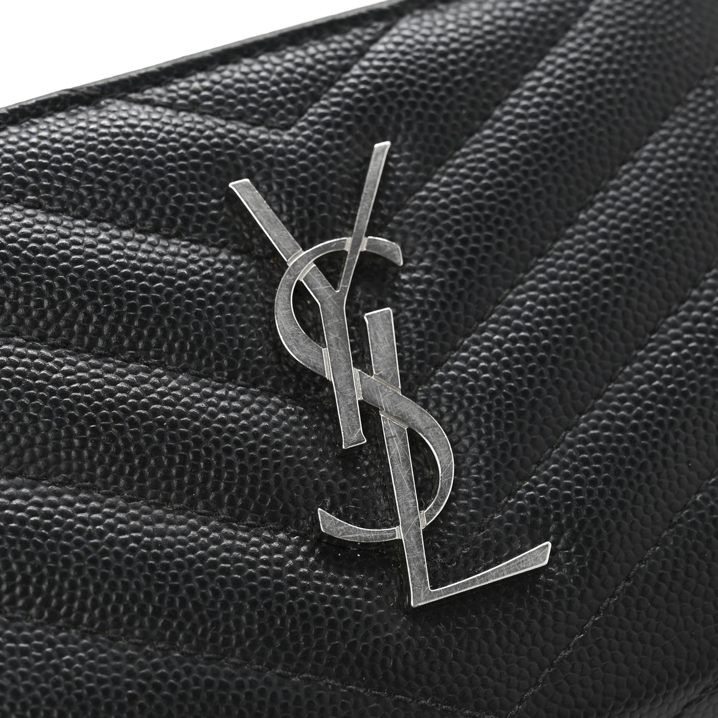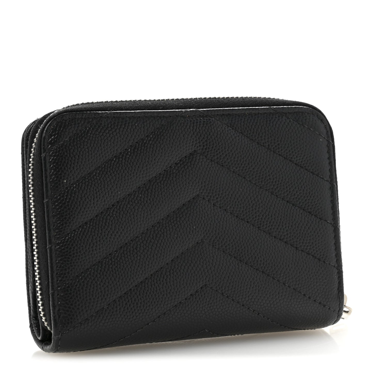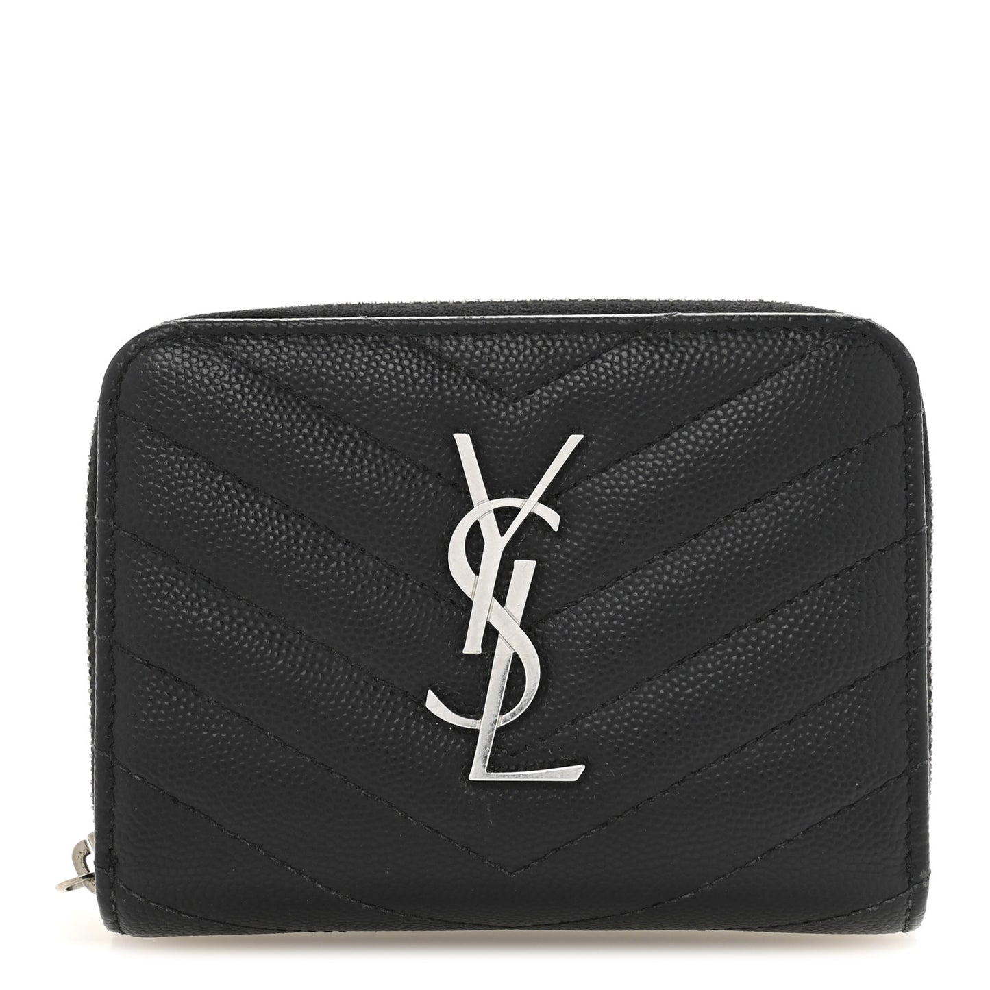 This is an authentic SAINT LAURENT Grain De Poudre Matelasse Chevron Monogram Compact Zip Around Wallet in Black. This chic wallet is crafted of grained calfskin leather in black, with a silver YSL monogram detail on the front. The wallet snaps open to a matching leather interior with card slots, a bill compartment, and a zipper pocket.Follow this item for alerts. Saint Laurent is a registered trademark of Saint Laurent. FASHIONPHILE is not affiliated with Saint Laurent.